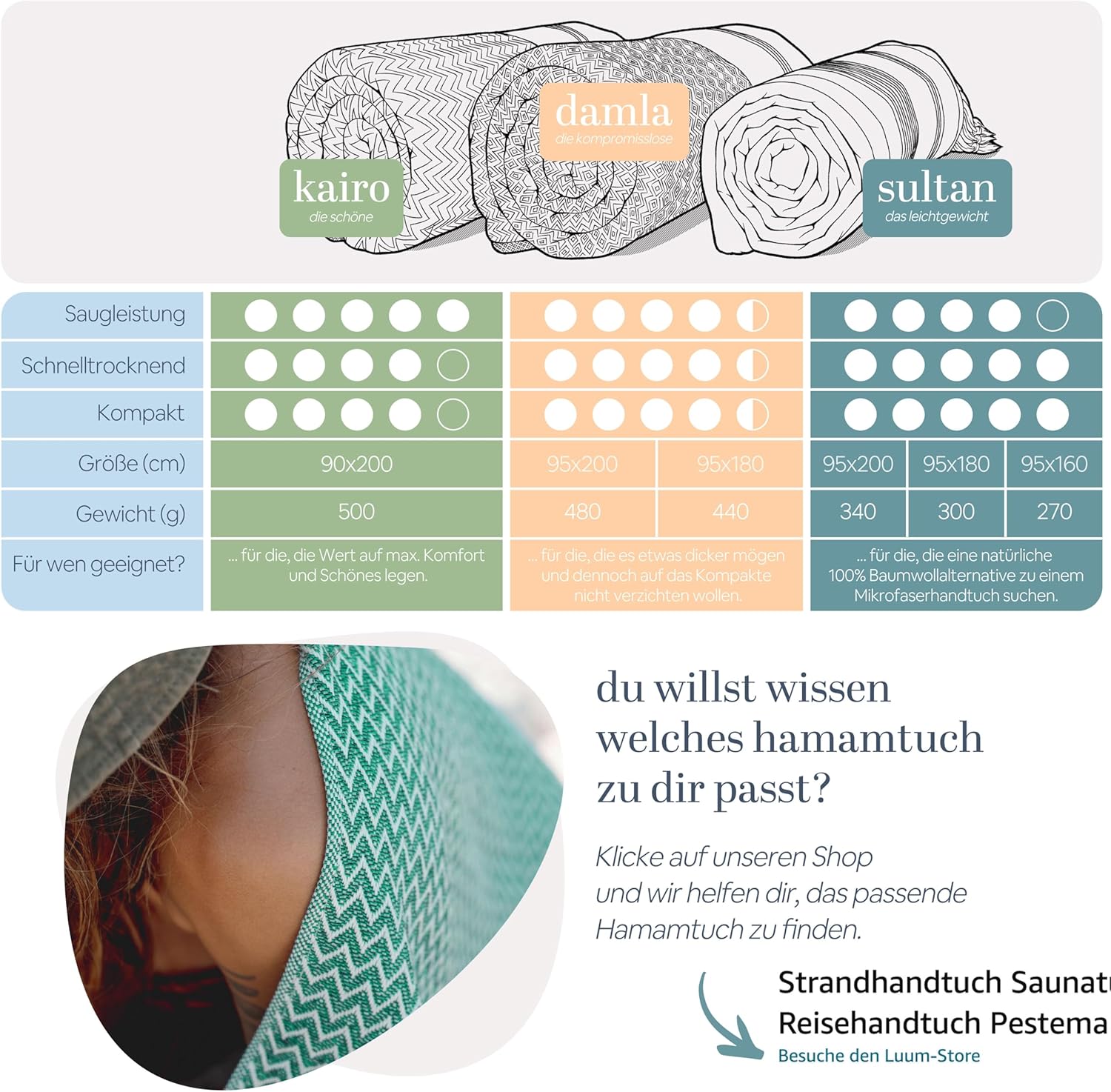 • Хавлиена кърпа? Не ме приемайте насериозно!] - С 500 г при внушителните 90 х 200 см, аз превъзхождам всяка хавлиена кърпа. Въпреки че дори не тежа наполовина и съм изтъкана плоско, ви предлагам същия комфорт благодарение на специалното си тъкане. Със семейството до открития басейн? В движение с кемпера? Къмпинг? Няколко кърпи за сауна, за да имате под ръка нещо сухо? Няма проблем с мен - обещавам!