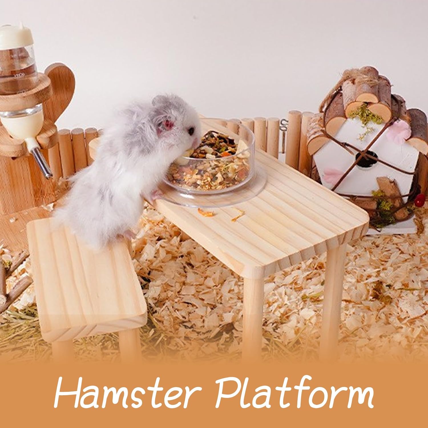 Дървената платформа за хамстери предлага много възможности за занимания и релаксация.