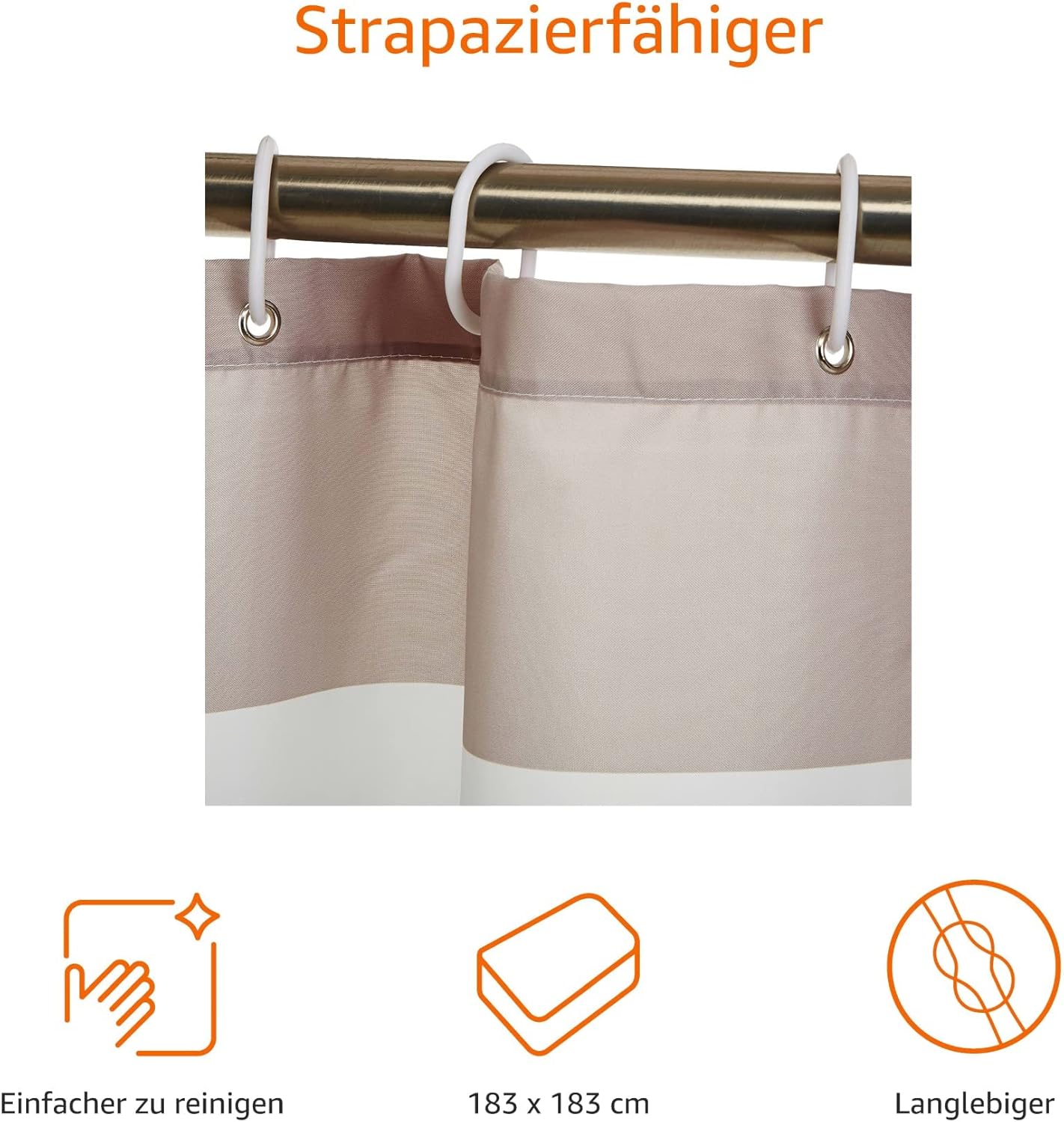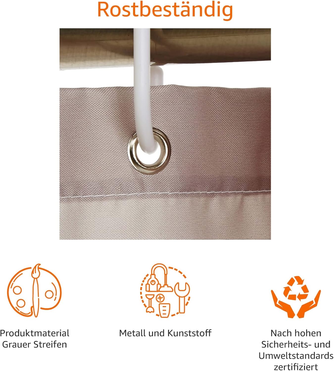 Душовата завеса е с размери 180 x 180 см за пълно уединение. По горната част на завесата има подсилени капси, предназначени за окачване на прикрепените куки или други декоративни куки. Капсите осигуряват здрав и изчистен вид, а претегленият подгъв на завесата гарантира сигурно задържане.