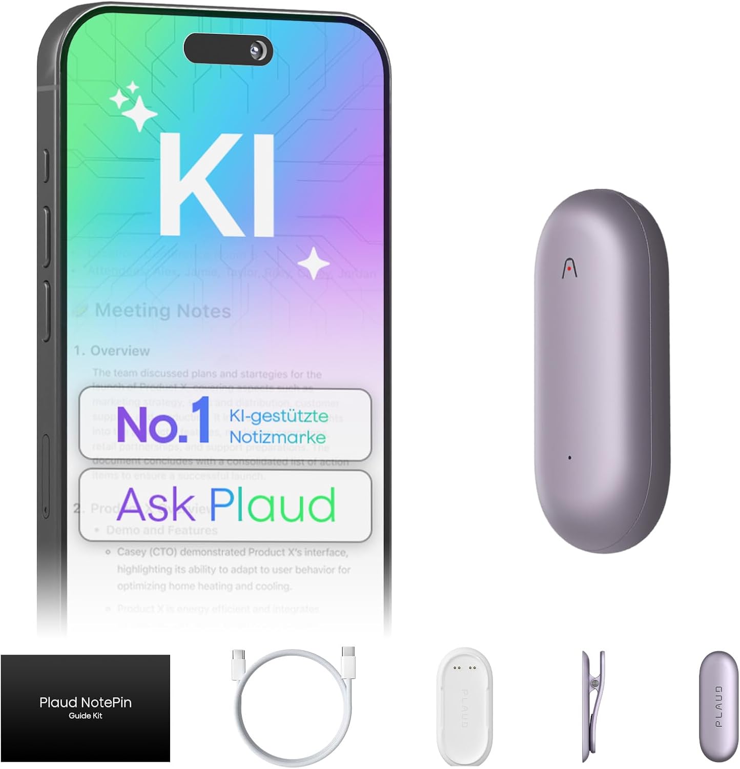 • Включено е всичко необходимо: 1 гласов рекордер Plaud NotePin, 1 магнитна щипка, 1 зарядна станция и 1 USB-C кабел за зареждане. Всички потребители на Plaud получават безплатни 300 минути за транскрипция на месец. Можете също така да конфигурирате WiFi за автоматично качване на файлове в PPC (по време на зареждане) и лесно да намерите своя NotePin с приложението Find My на Apple.