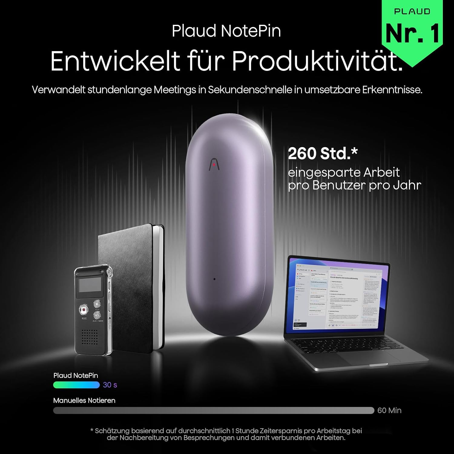 • ЗАБЕЛЕЖКА: Активирайте своя Plaud NotePin, за да получите безплатен стартов план с 300 минути транскрипция с изкуствен интелект на месец. Надстройте до Pro план за €110.99/година или €19.99/месец, за да отключите 1200 минути транскрипция, персонализирани шаблони и разширени функции като Ask AI.