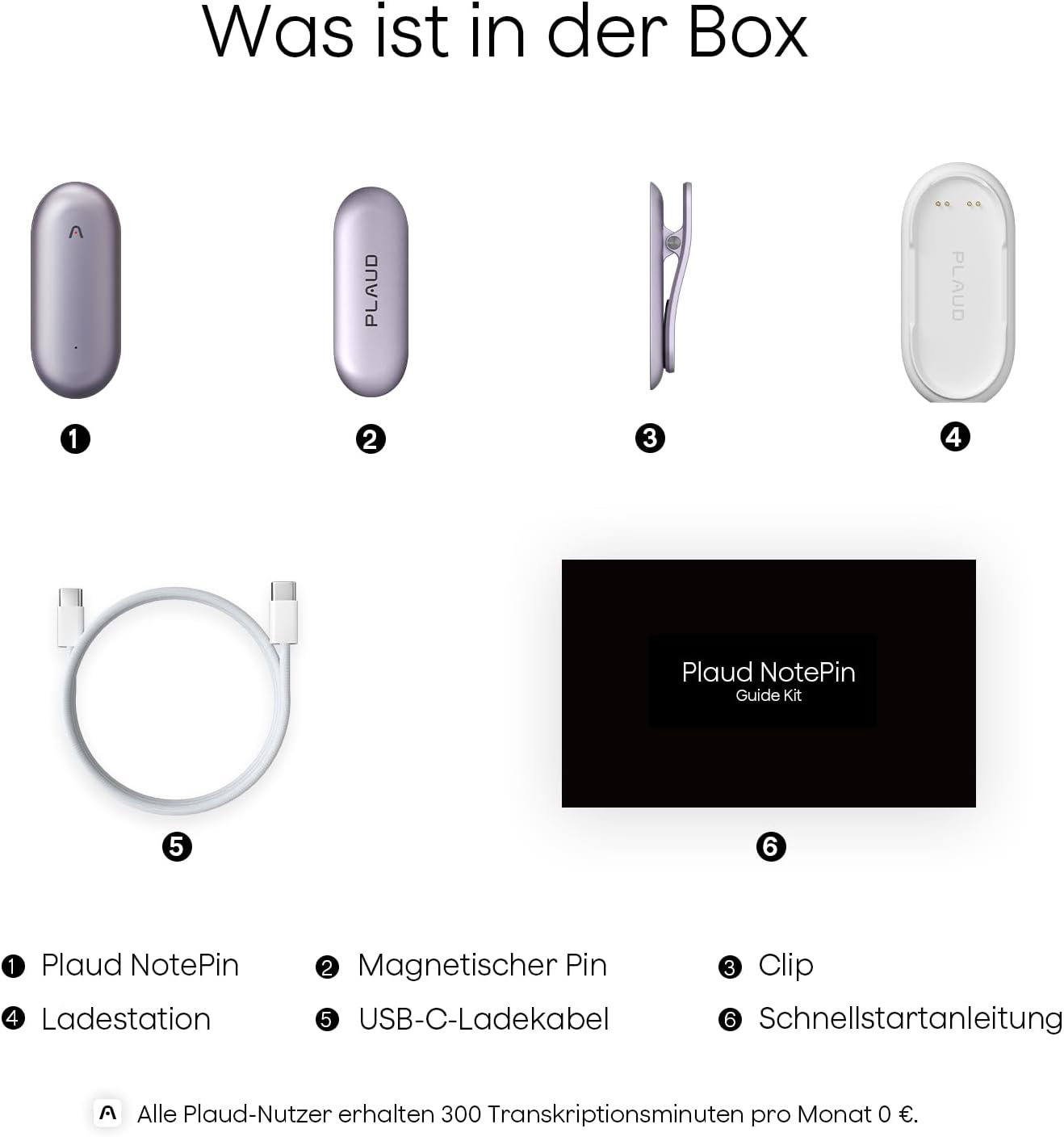 • Включено е всичко необходимо: 1 гласов рекордер Plaud NotePin, 1 магнитна щипка, 1 зарядна станция и 1 USB-C кабел за зареждане. Всички потребители на Plaud получават безплатни 300 минути за транскрипция на месец. Можете също така да конфигурирате WiFi за автоматично качване на файлове в PPC (по време на зареждане) и лесно да намерите своя NotePin с приложението Find My на Apple.
