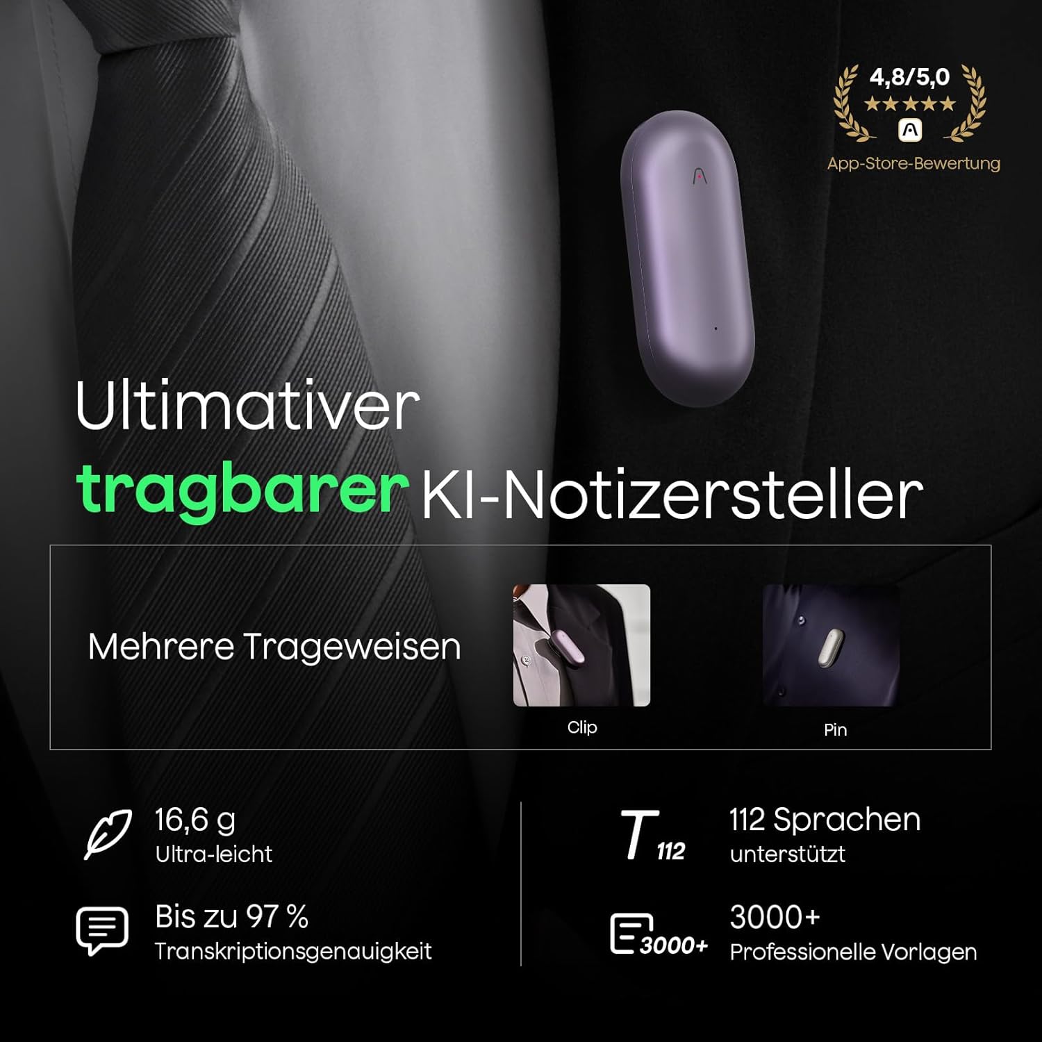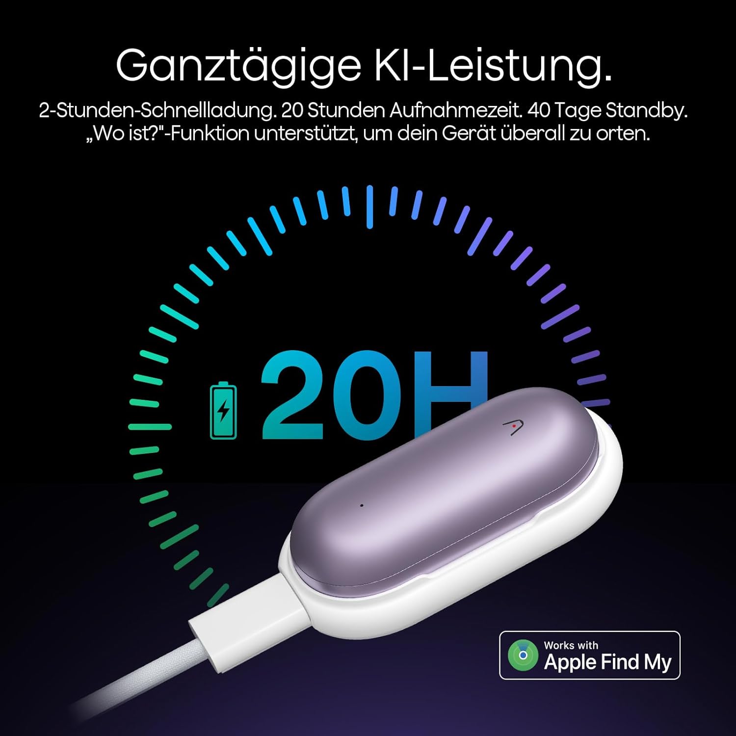Plaud NotePin Гласов рекордер, AI гласов рекордер, управление с приложения, AI устройство за бележки, AI транскрипция и резюме, 112 езика, 64GB, аудио рекордер за лекции, срещи, Sunset Purple