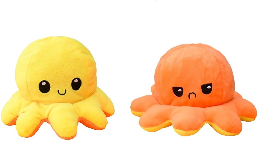 Плюшена играчка Октопод, С две лица, Щастливо и Сърдито, 30см диаметър, Жълта/Оранжева