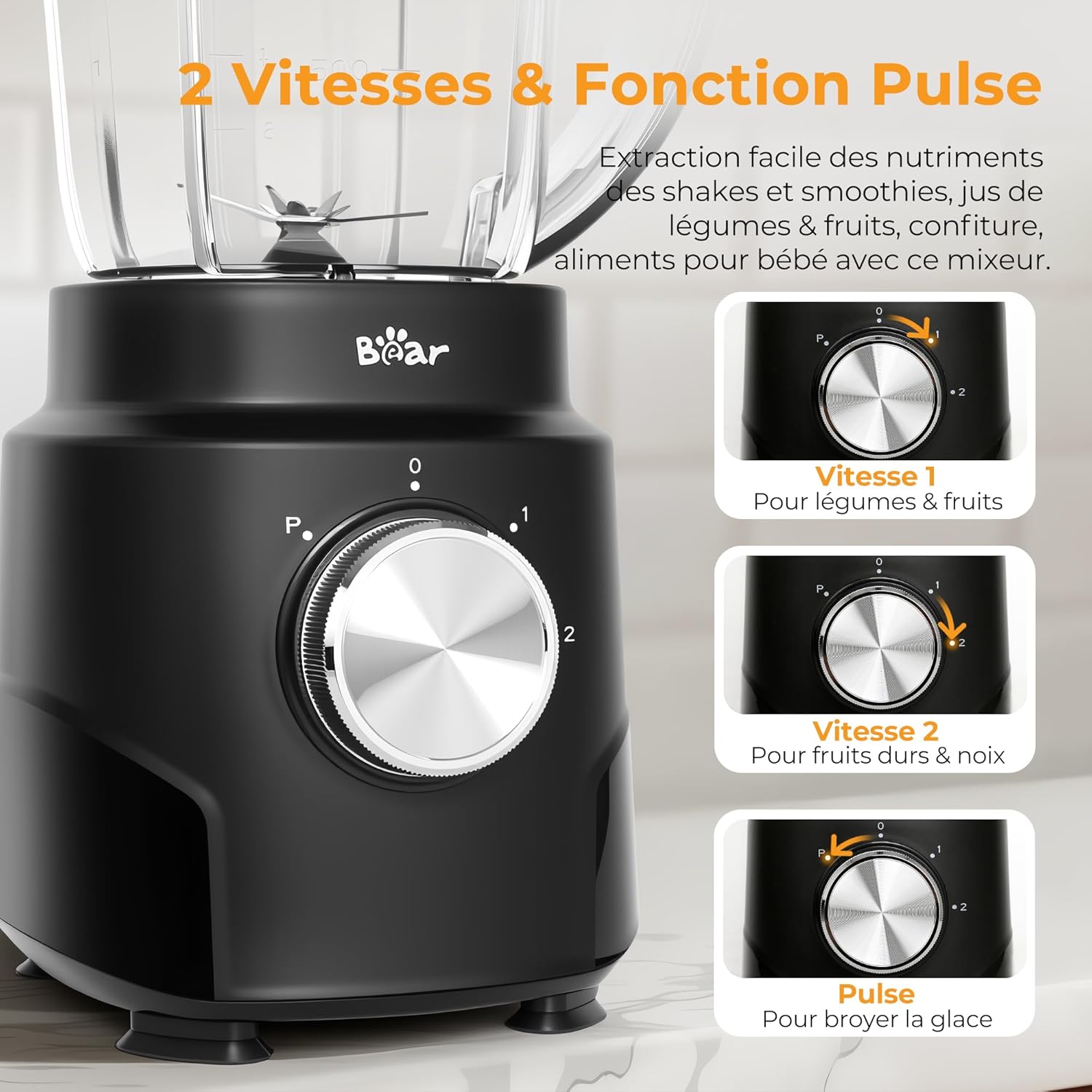 Плотен блендер Bear, професионален уред за смутита 700 W с чаша за смесване 1500 мл за шейкове, смутита и сосове, 3 плавно регулируеми скорости за раздробяване на лед и замразени плодове