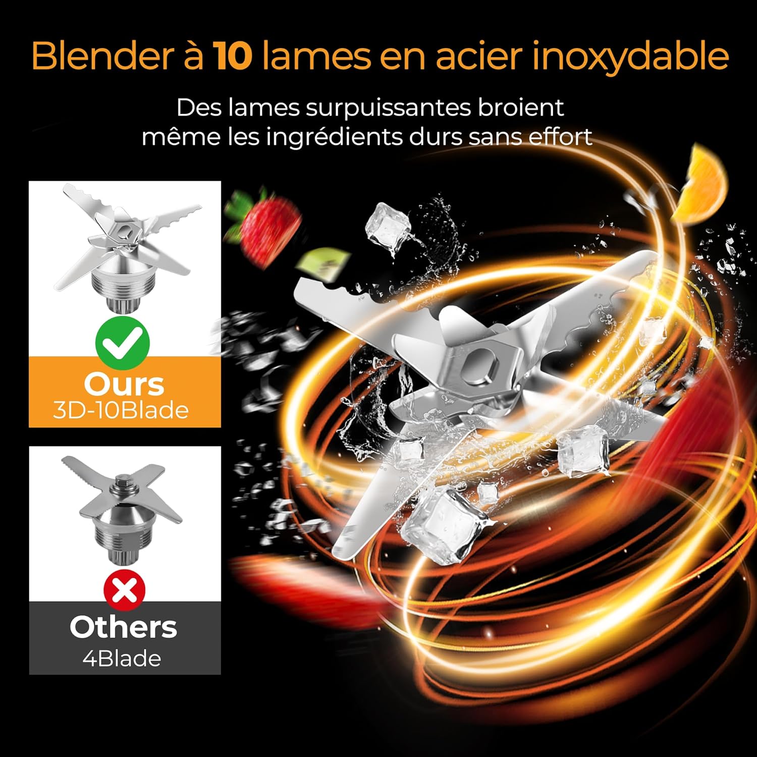 • 10-ножовата система от неръждаема стомана осигурява мощно смачкване - без усилие смачква лед и замразени плодове до ултрафини текстури.
