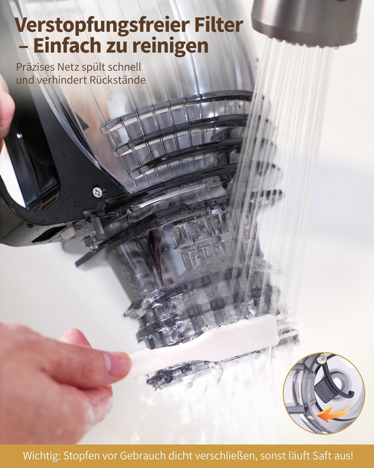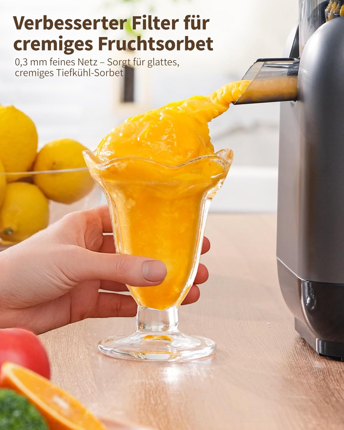 • Бърз монтаж и лесно почистване - Безопасна употреба: Бавната сокоизстисквачка се състои само от 4 части и може да се сглоби за нула време. За максимална сигурност устройството работи само ако предпазният механизъм е правилно заключен, когато е отворен. Патентованият филтър против запушване осигурява особено лесно почистване. Забележка: След приготвяне на плодов сладолед, моля, отстранете остатъците преди изплакване.