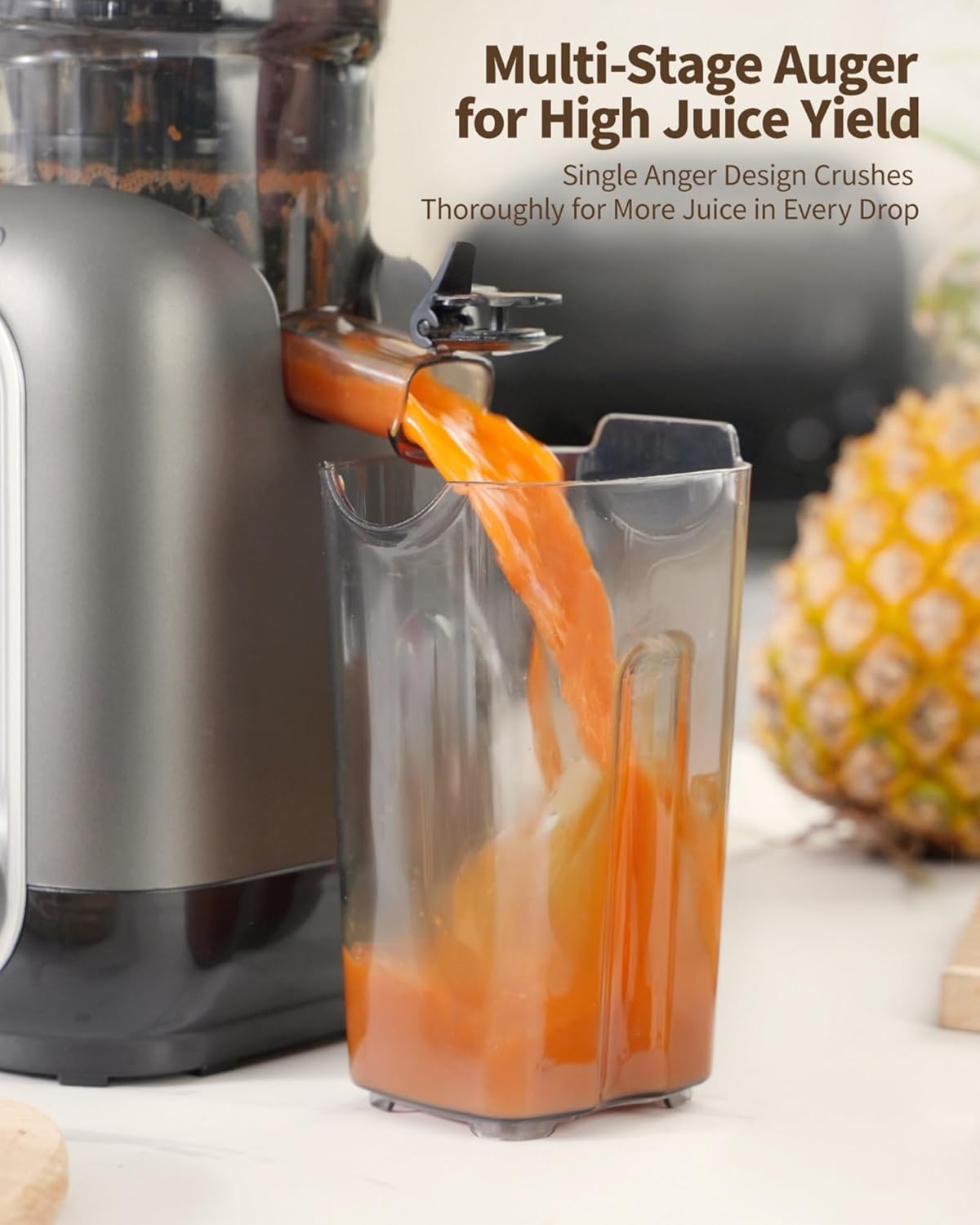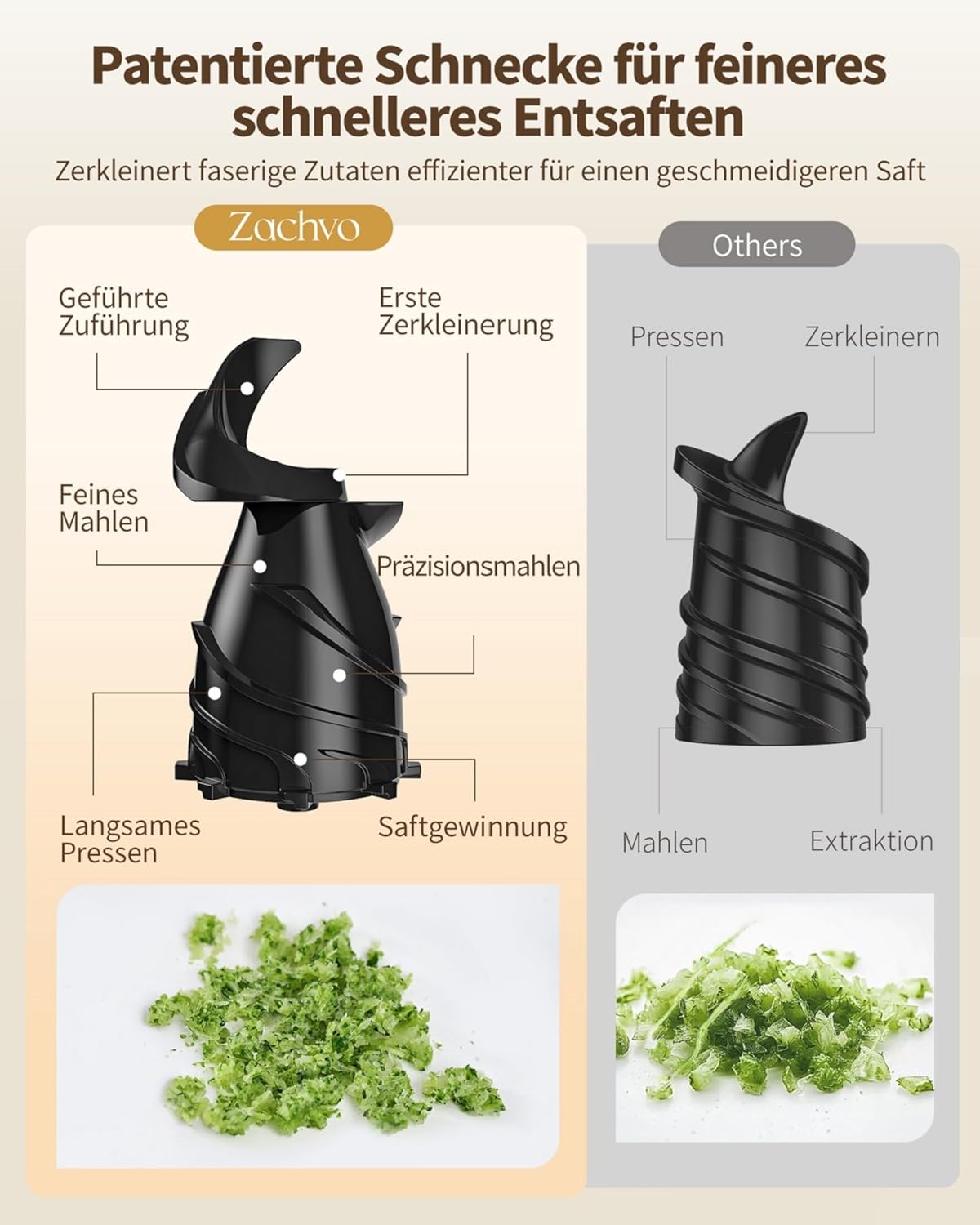 • Патентован шнек за висок добив на сок: нашата сокоизстисквачка използва удължен шнек, който хваща съставките по-ефективно, смачква старателно влакната и извлича сок с по-малко отпадъци. Резултатът: сухи люспи, по-гладка консистенция и повече хранителни вещества с по-ниско окисление - перфектна сокоизстисквачка, победител в теста за зеленчуци и плодове.