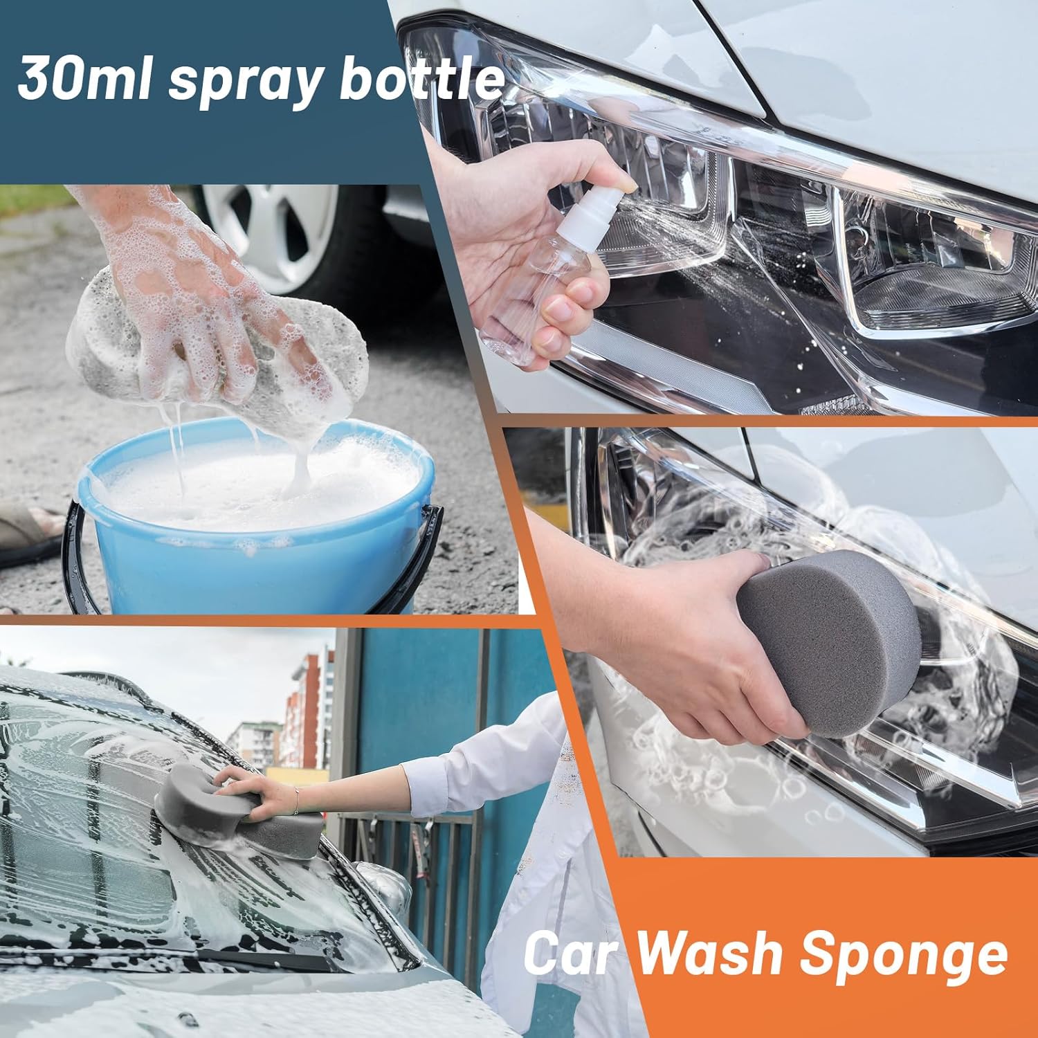 • Комплектът се състои от телескопичен прът с държач за подложки, общо четири перащи се калъфа (подложки), спрей бутилки от 30 мл и компресирана гъба за автомивка (гъбата се предлага в компресирана опаковка и се увеличава след добавяне на вода, дължината е 16,5 см)