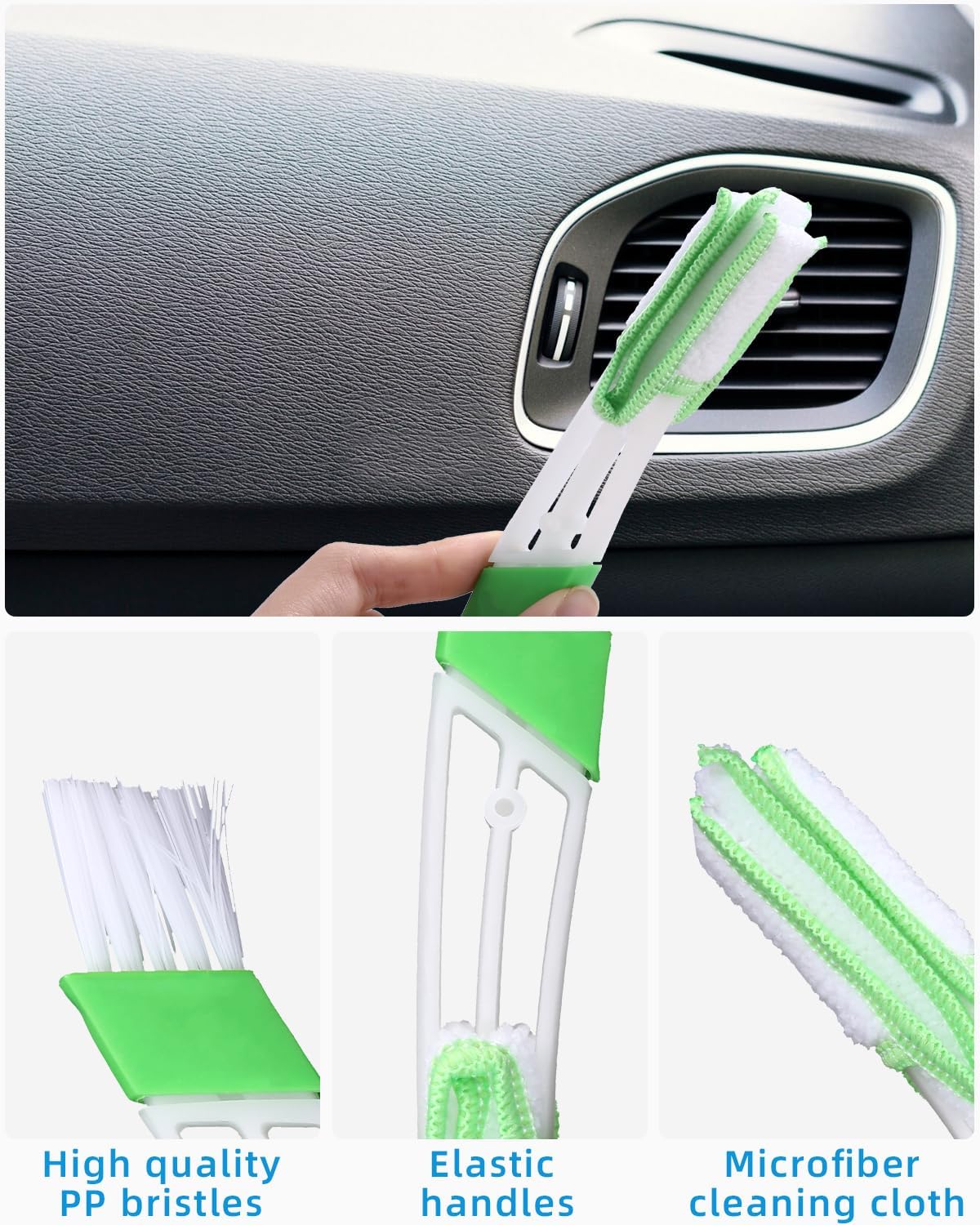 • Перфектен партньор: едната страна на двустранната четка е снабдена с меки микрофибърни вложки, които са идеални за почистване на вентилационни отвори и щори с различни размери и улесняват почистването на вентилацията. Другата страна е снабдена с издръжливи найлонови влакна за ефективно премахване на замърсявания, вградени в материала.
