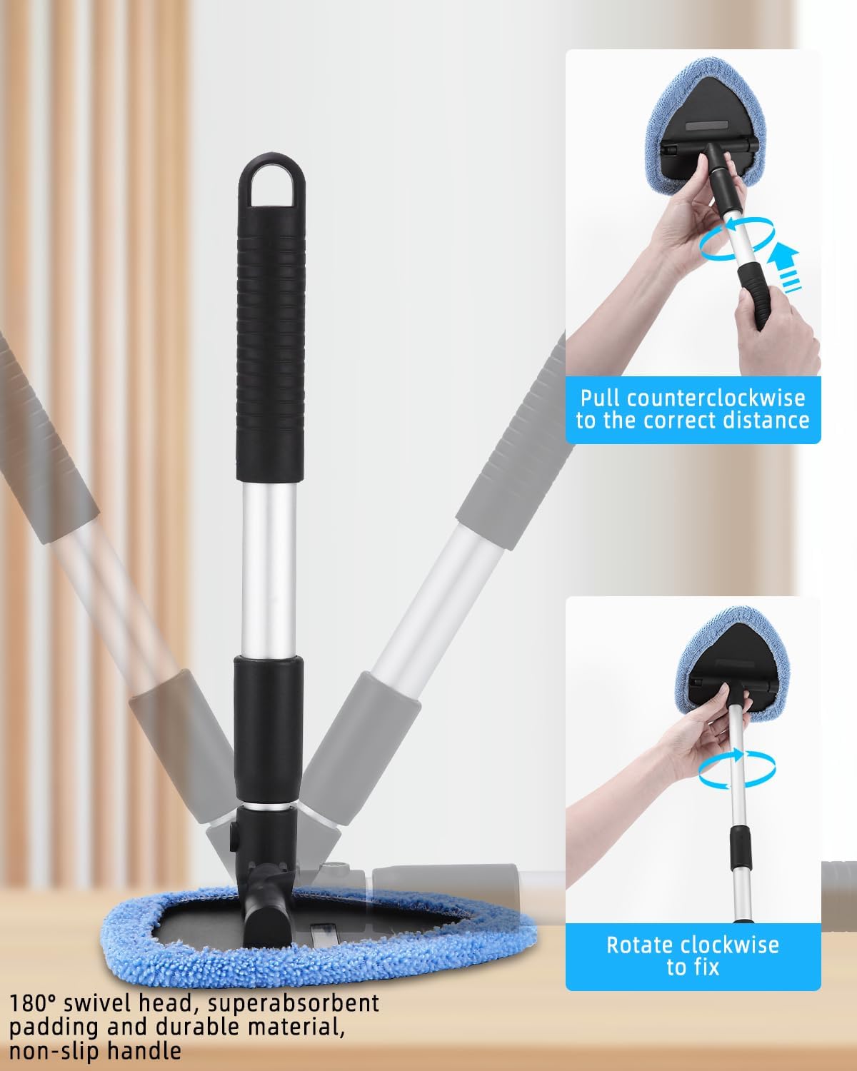 • Лесна за употреба: тази регулируема телескопична почистваща стъкла е лесна за задържане в правилната позиция, а въртящата се на 180 градуса глава достига с лекота цялото предно стъкло.