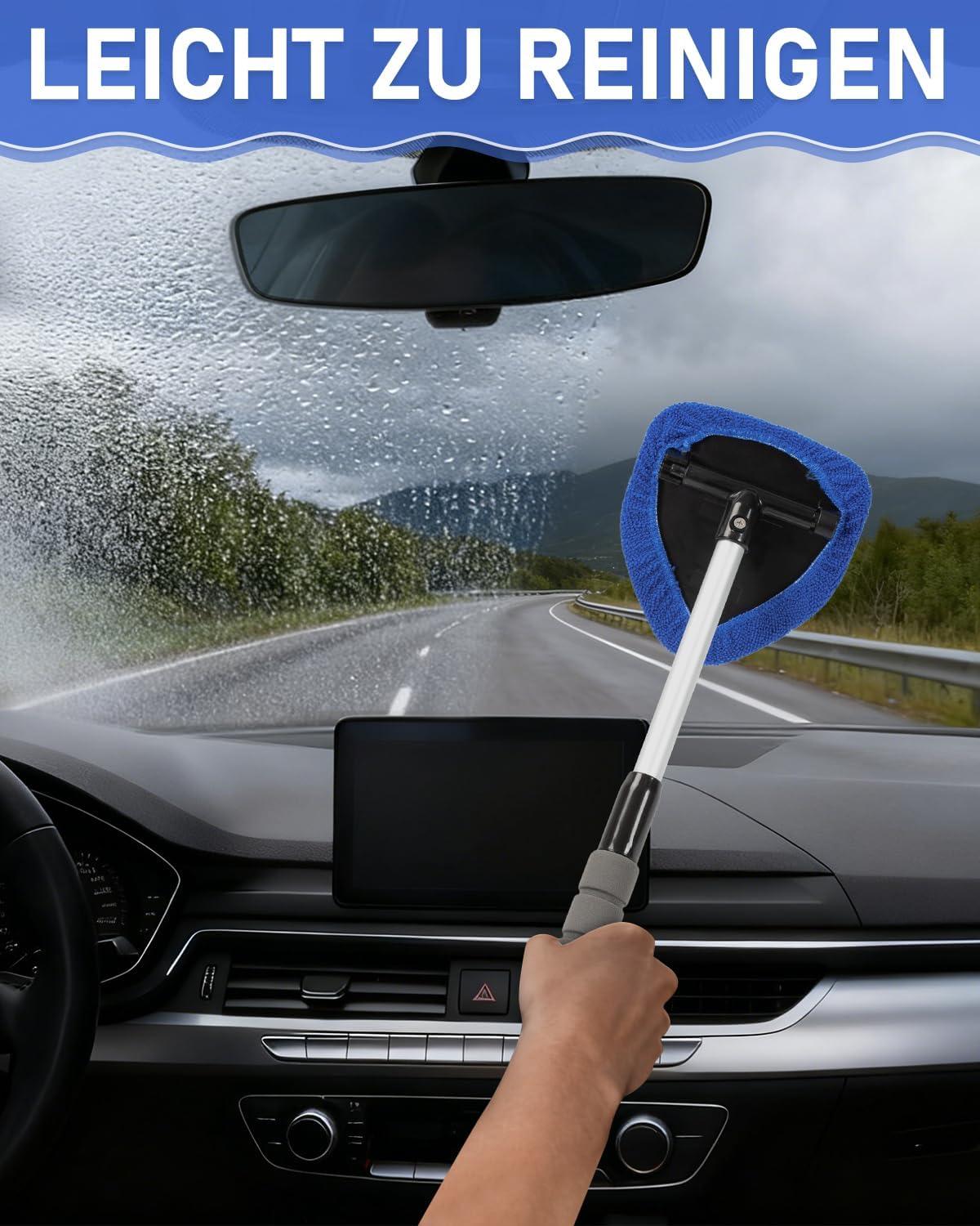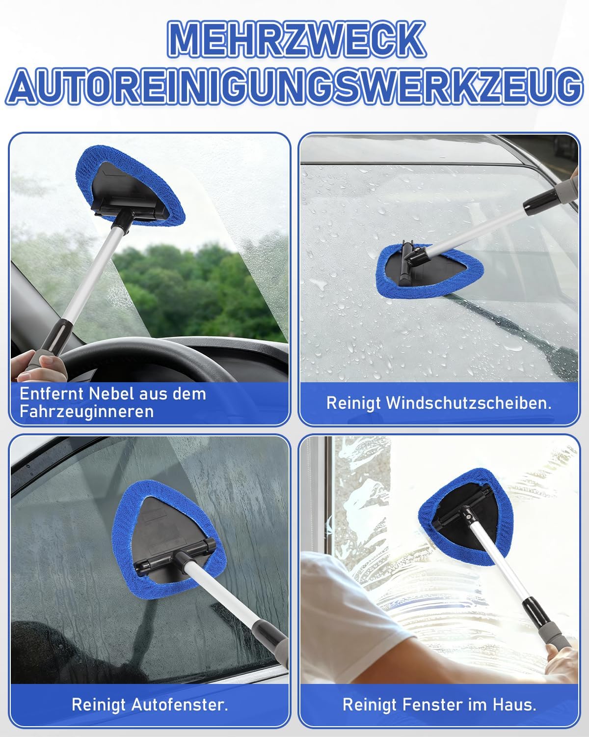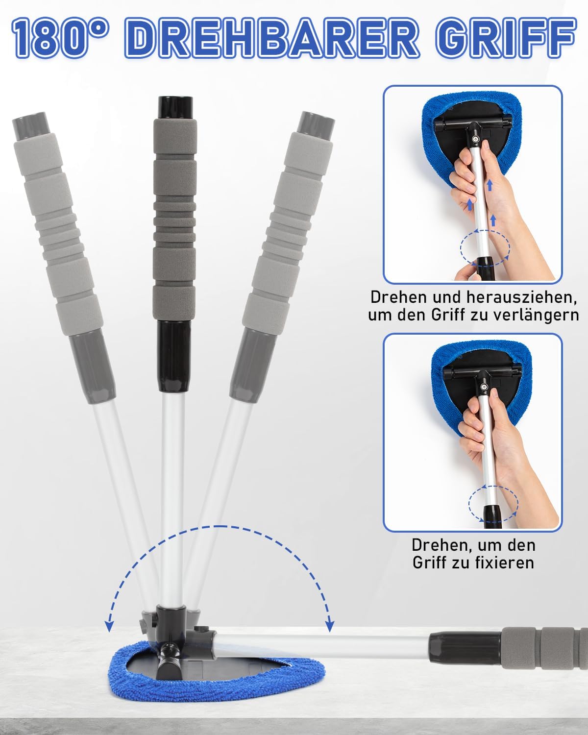• Почистване без усилие: С разтегателната си дръжка и въртящата се на 180° глава, този инструмент позволява по-бързо и удобно почистване на двете страни на прозорците на автомобила, като без усилие достига до всеки ъгъл. Дизайнът на разтегателната дръжка намалява навеждането по време на почистване и предотвратява напрежението в гърба, докато въртящата се на 180° глава приляга по-добре към стъклото и премахва старателно упоритите петна от ъглите на предното стъкло.