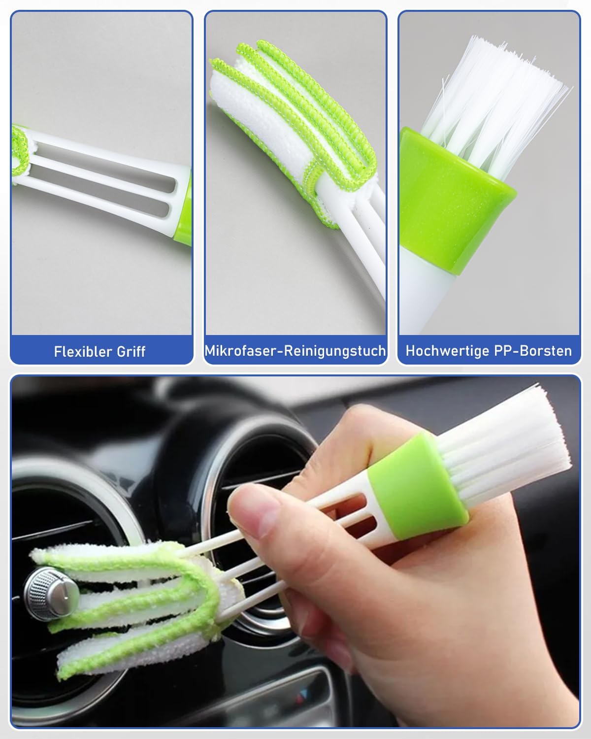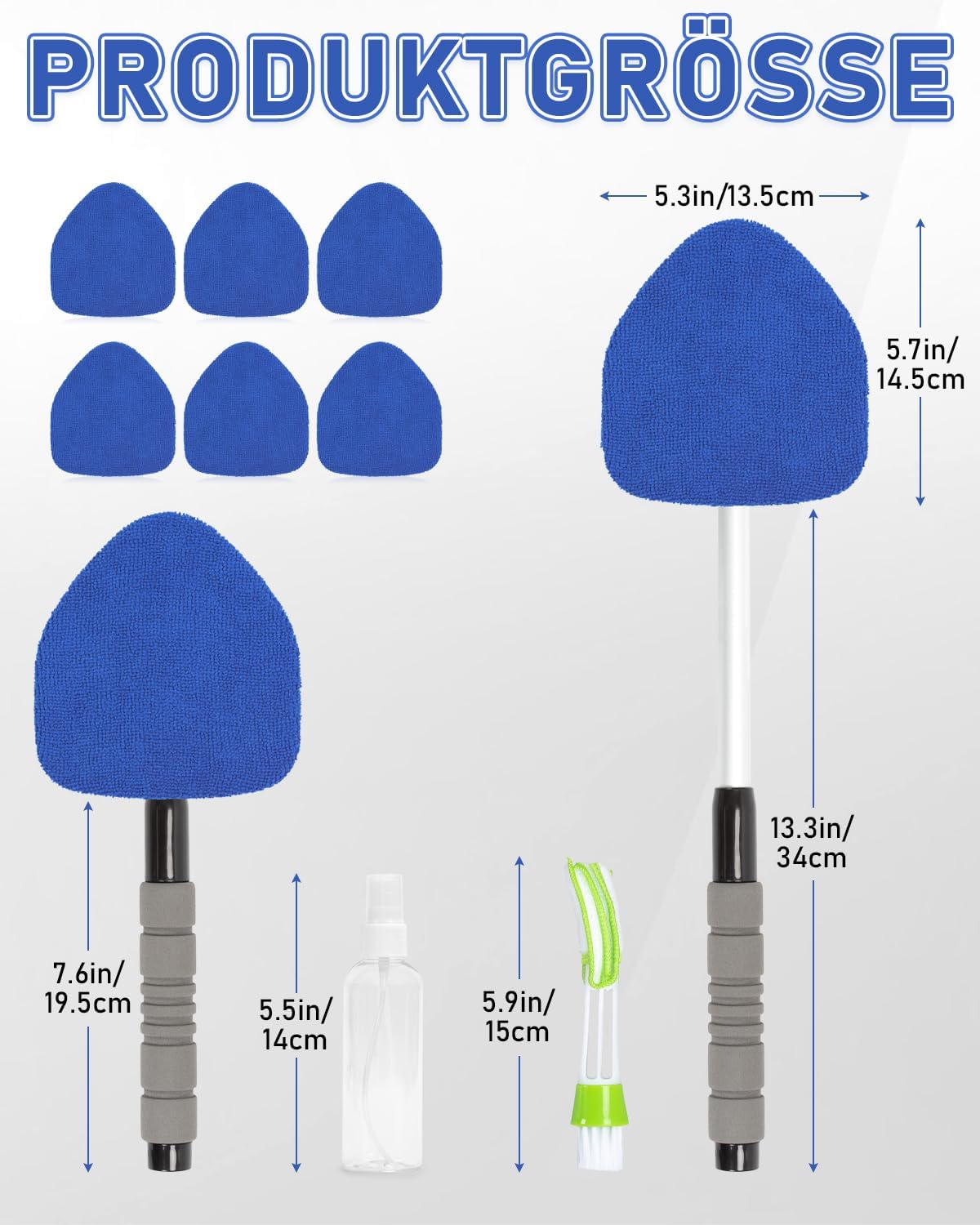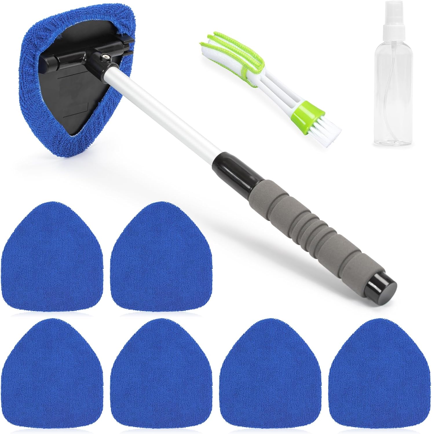 • УДОБЕН КОМПЛЕКТ Този почистващ препарат за предно стъкло на автомобил разполага с телескопична алуминиева дръжка и се предлага с шест триъгълни почистващи подложки за многократна употреба, които могат да се перет, четка за прах за вентилационните отвори и бутилка със спрей от 100 мл за по-голямо удобство.