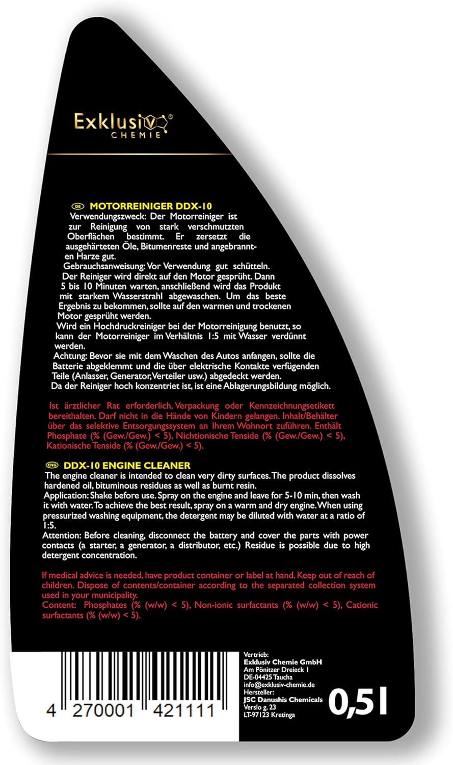 Професионално почистване на двигателя: препаратът за почистване на двигателя разгражда добре втвърдените масла, остатъците от битум и изгорелите смоли и премахва всякакви замърсявания от двигатели, инструменти, агрегати и машинни части. Гланцово почистване: концентрираният универсален почистващ препарат достига дори до труднодостъпни места благодарение на добрите си проникващи свойства и прави двигателя да изглежда като нов. Универсалният почистващ препарат премахва полепналите замърсявания нежно и надеждно. Лесен за употреба: разклатете бутилката със спрей. Напръскайте почистващия спрей върху леко охладен, сух двигател, оставете за 5-10 минути, след което измийте със силна струя вода. Безопасност: Преди да започнете почистването, изключете акумулатора и покрийте контактите с части като стартер, разпределител, генератор. Почистващият препарат за двигатели е без разтворители. Съдържание на кутията: 1 x Почистващ препарат за двигател Exklusiv Chemie DDX-10 се предлага готов за употреба в удобна бутилка със спрей от 0,5 литра. Гарантираме отлична грижа за вашия автомобил.