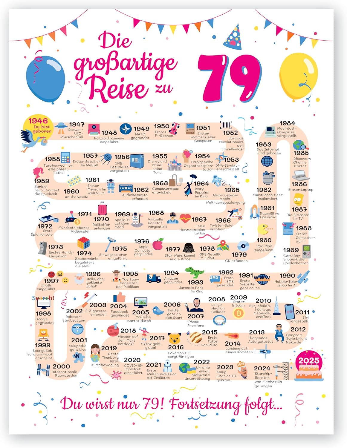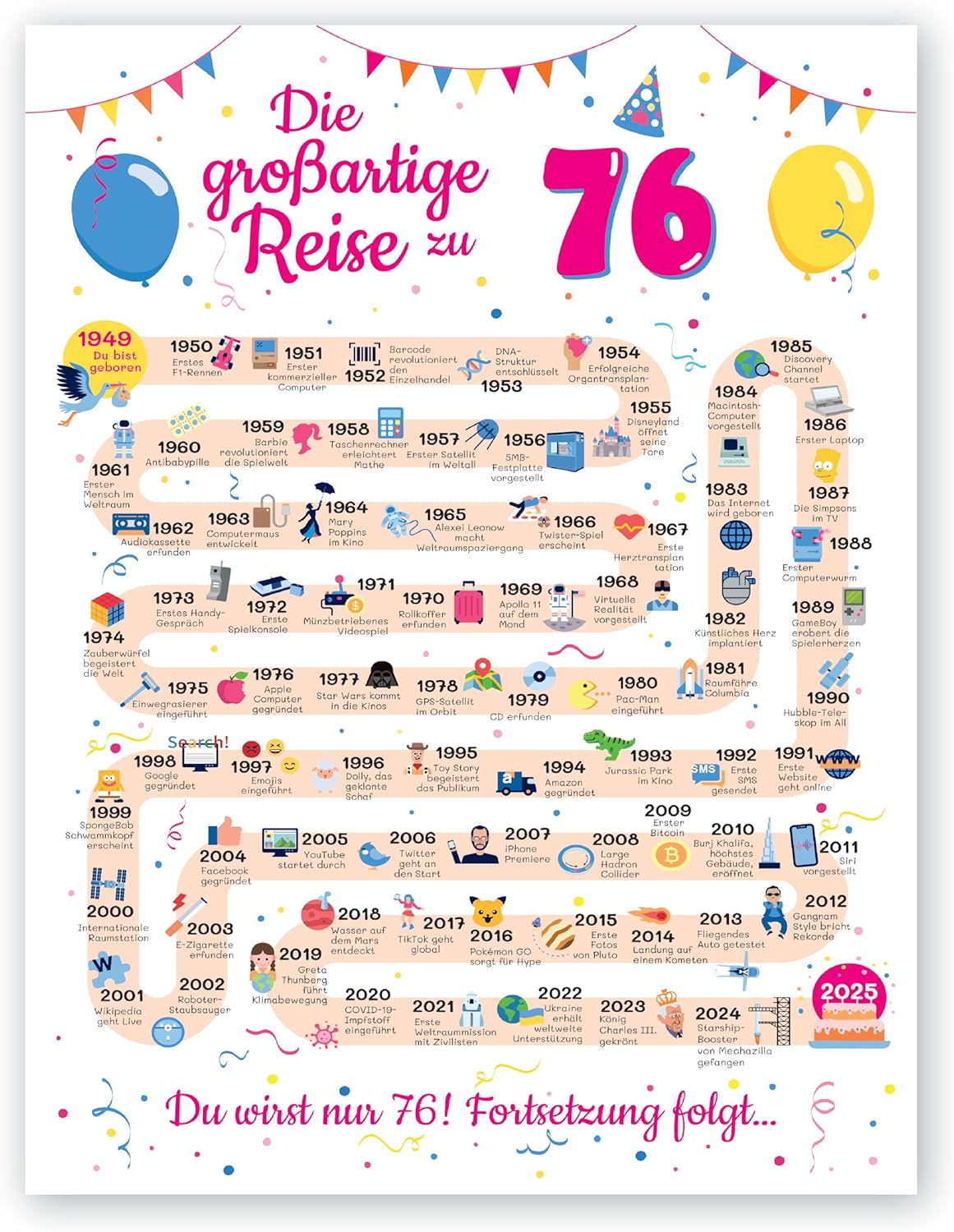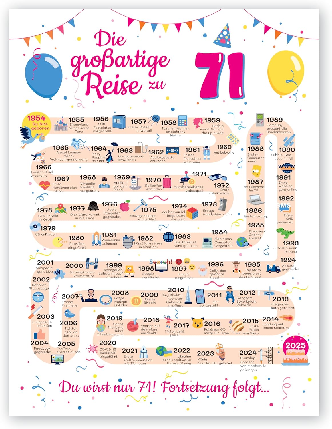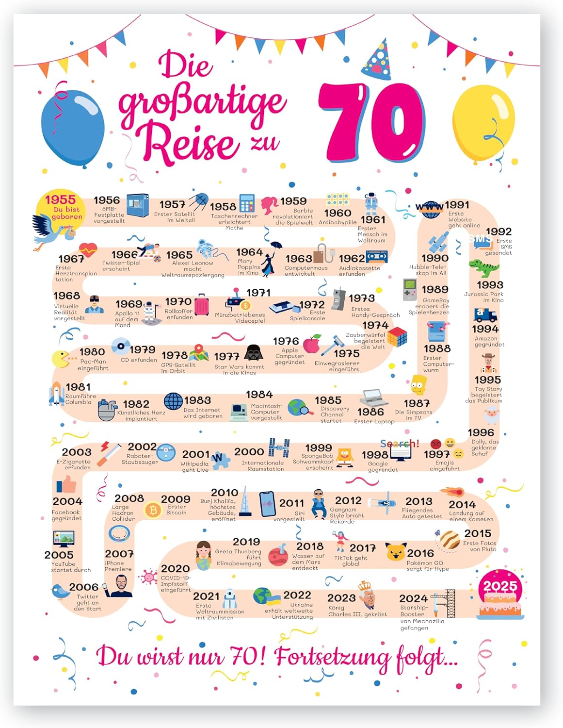 • Подарък за всеки, който вече има всичко: Търсите ли специален подарък за жена, която празнува 70-ти рожден ден? Този плакат ще зарадва всеки, който цени спомените и носталгията. Той разказва за специални събития от всяка година на годишнината и гарантира радост, когато го подарявате. Идеален е както за жени над 70 години, така и за мъж, който празнува 70-ти рожден ден.