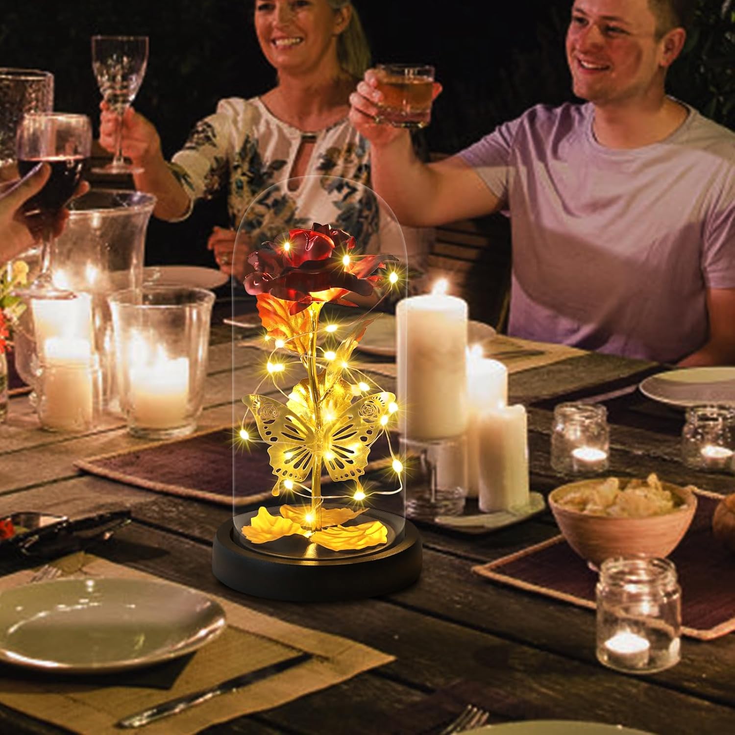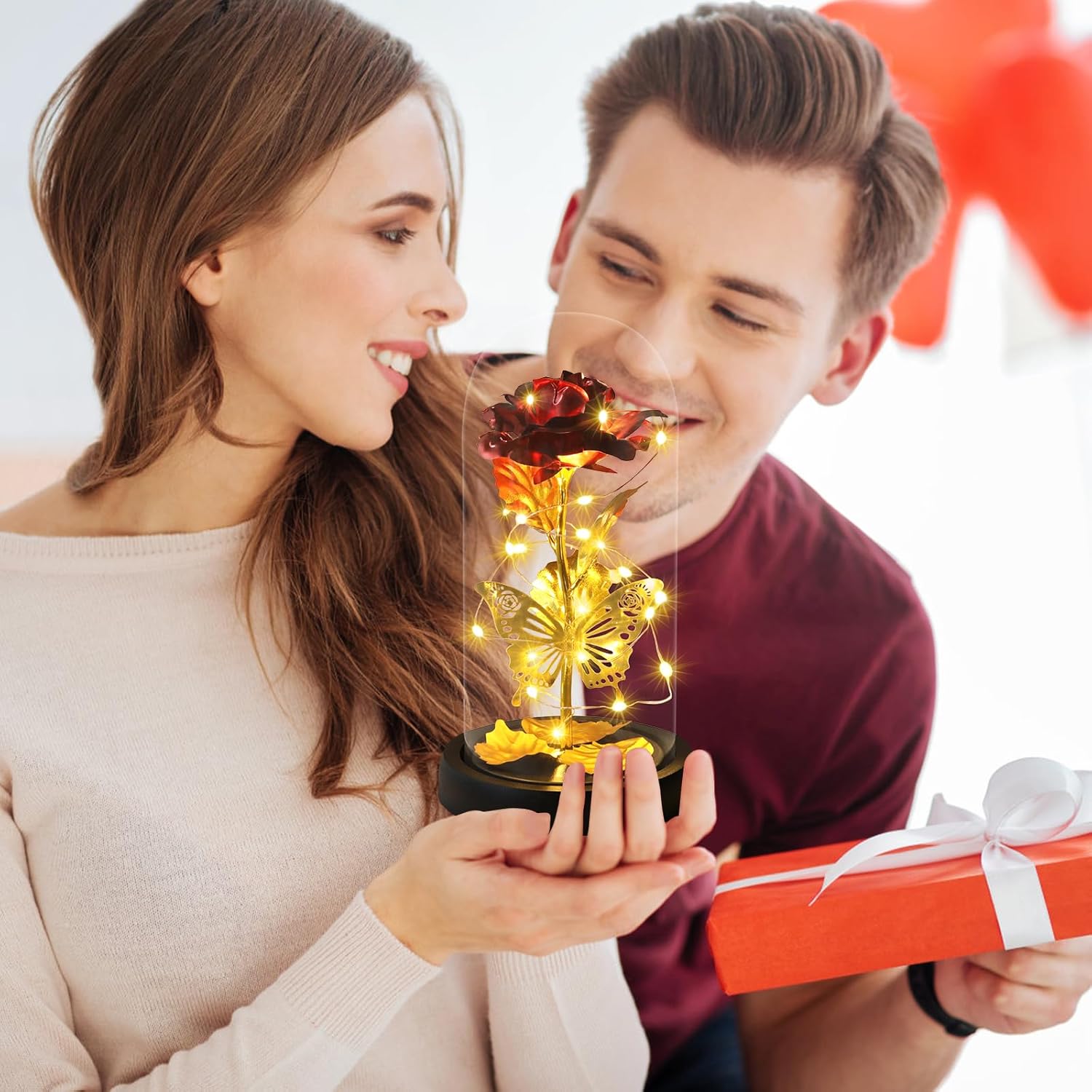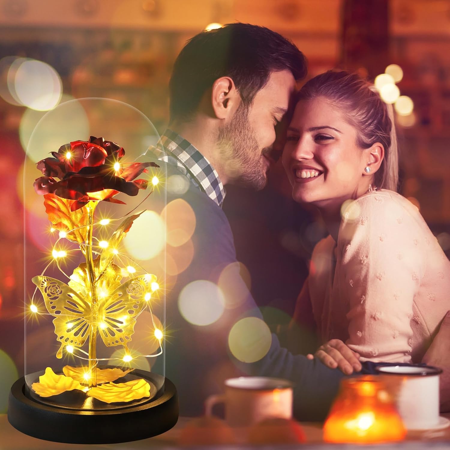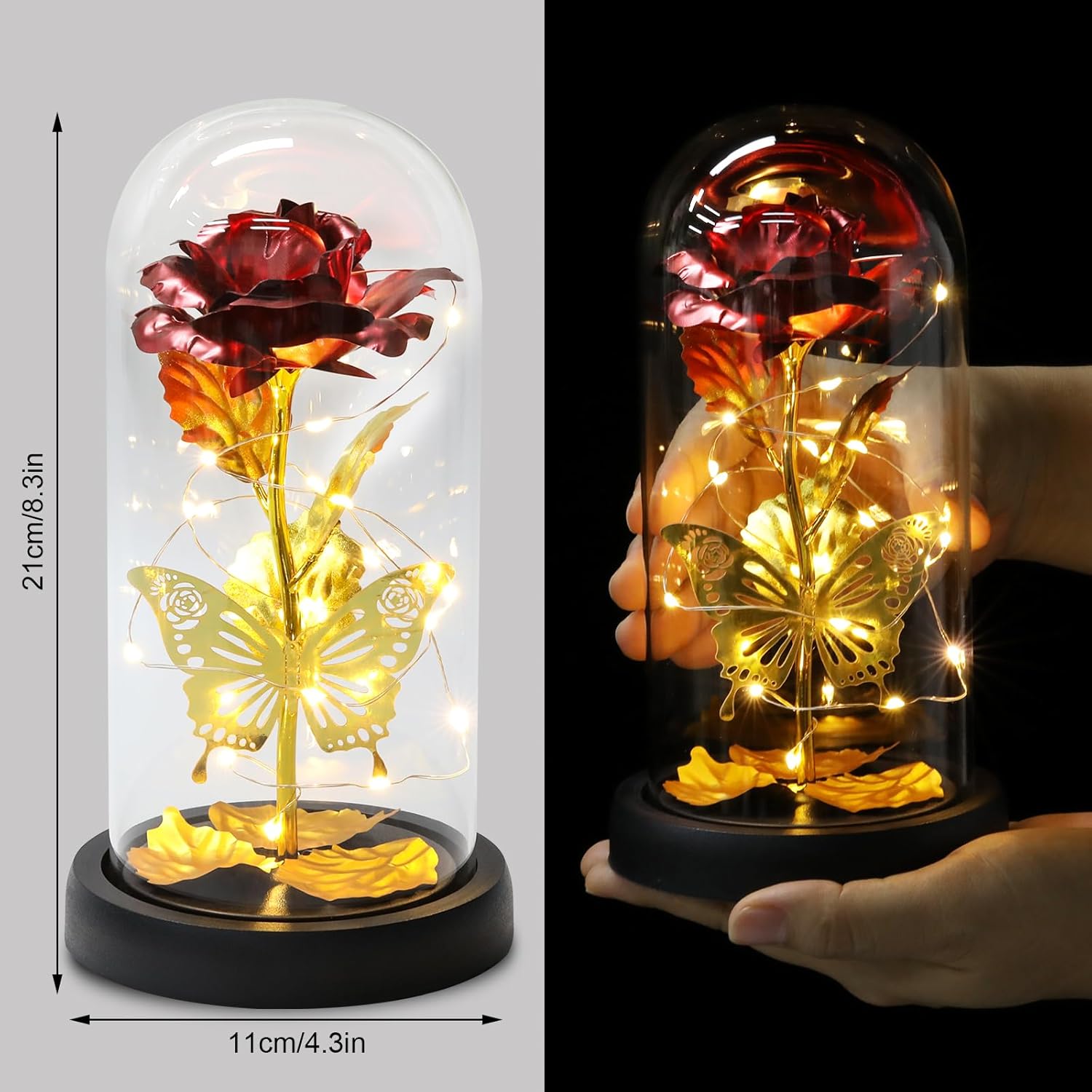 Bunte LED-Lichtshow, Rose ist um ein LED-Streifenlicht gewickelt, angetrieben durch 3 AAA-Strom (nicht im Lieferumfang enthalten), LED-Streifenlicht, helles, warmweißes Licht. LED-Rosenlicht kann tagsüber und nachts für Heimdekorationen verwendet werden oder eine romantische Atmosphäre schaffen. LED-Glasrose ist ein Symbol für Wertschätzung, beste Wünsche, ewige Liebe, Leidenschaft und Romantik.