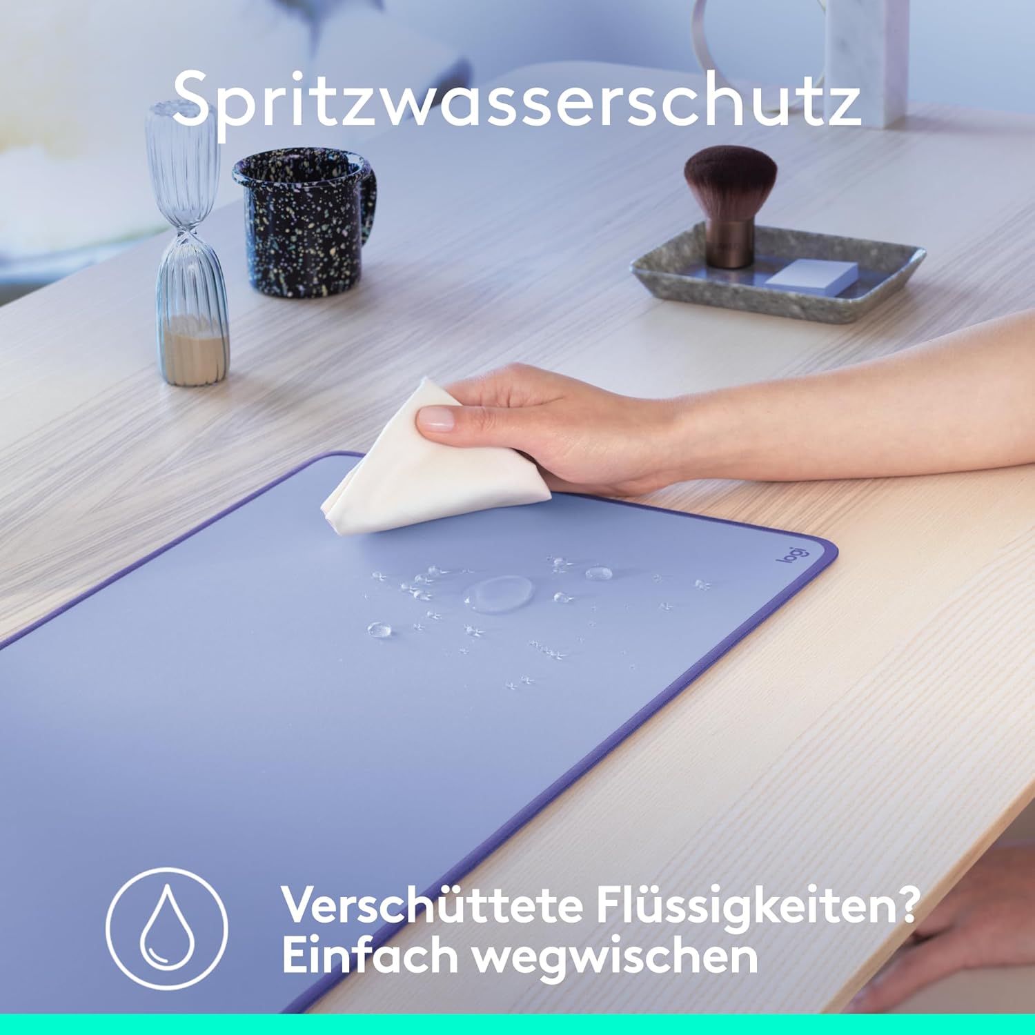 • УСТОЙЧИВА НА ТЕЧОВЕ, ЛЕСНА ЗА ПОЧИСТВАНЕ С покритата повърхност на подложката за бюро можете лесно да избършете случайни инциденти; избършете течностите с влажна кърпа