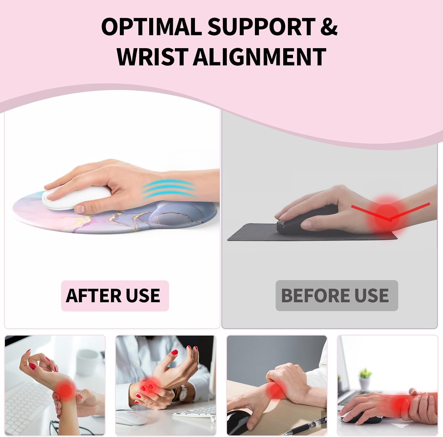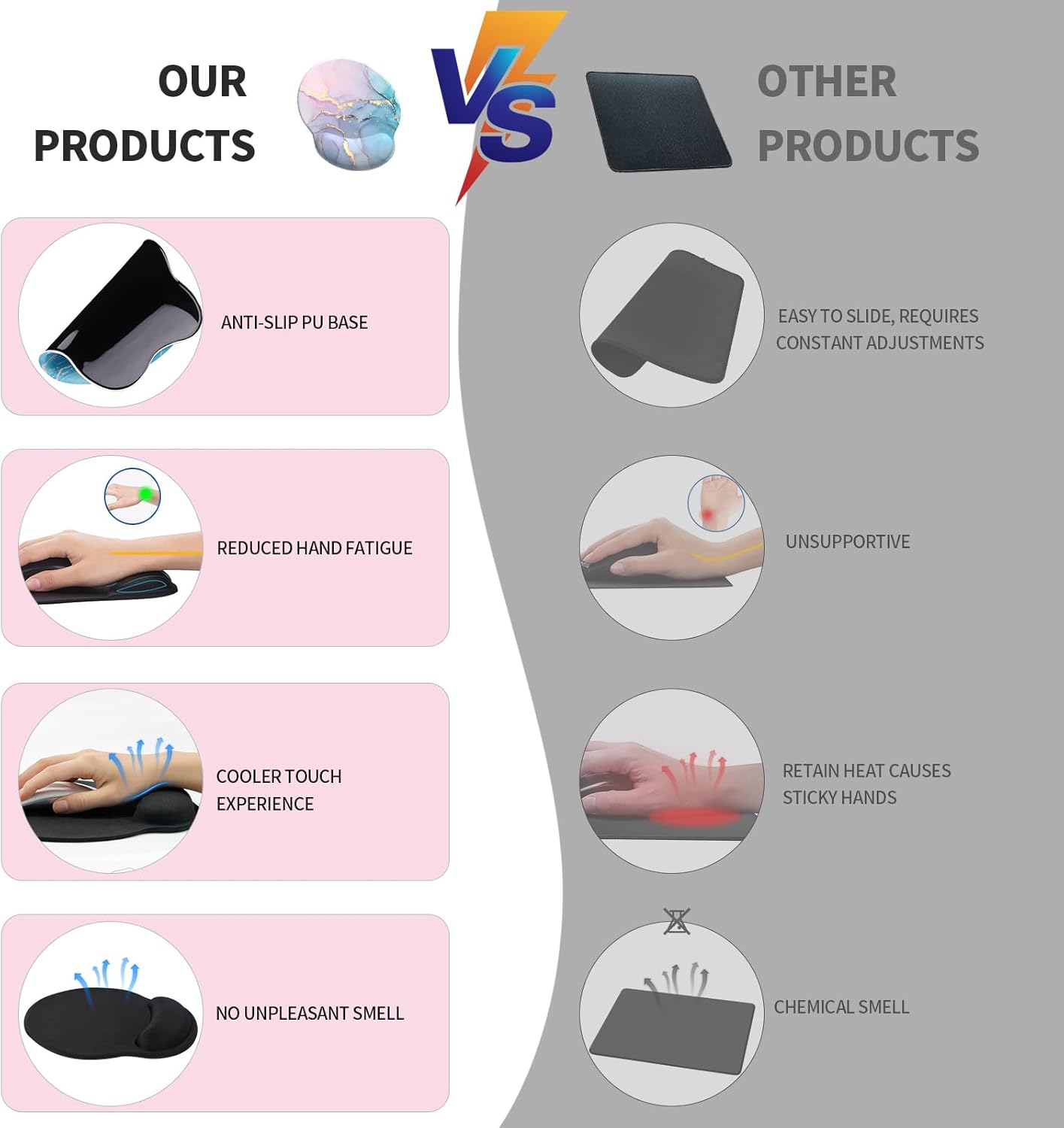 • Охлаждащ ефект: подложките за мишка с поставка за китката са проектирани с охлаждащ ефект, който намалява образуването на пот и влага върху китката. Това поддържа китката ви суха и удобна дори по време на продължителна работа с компютър.