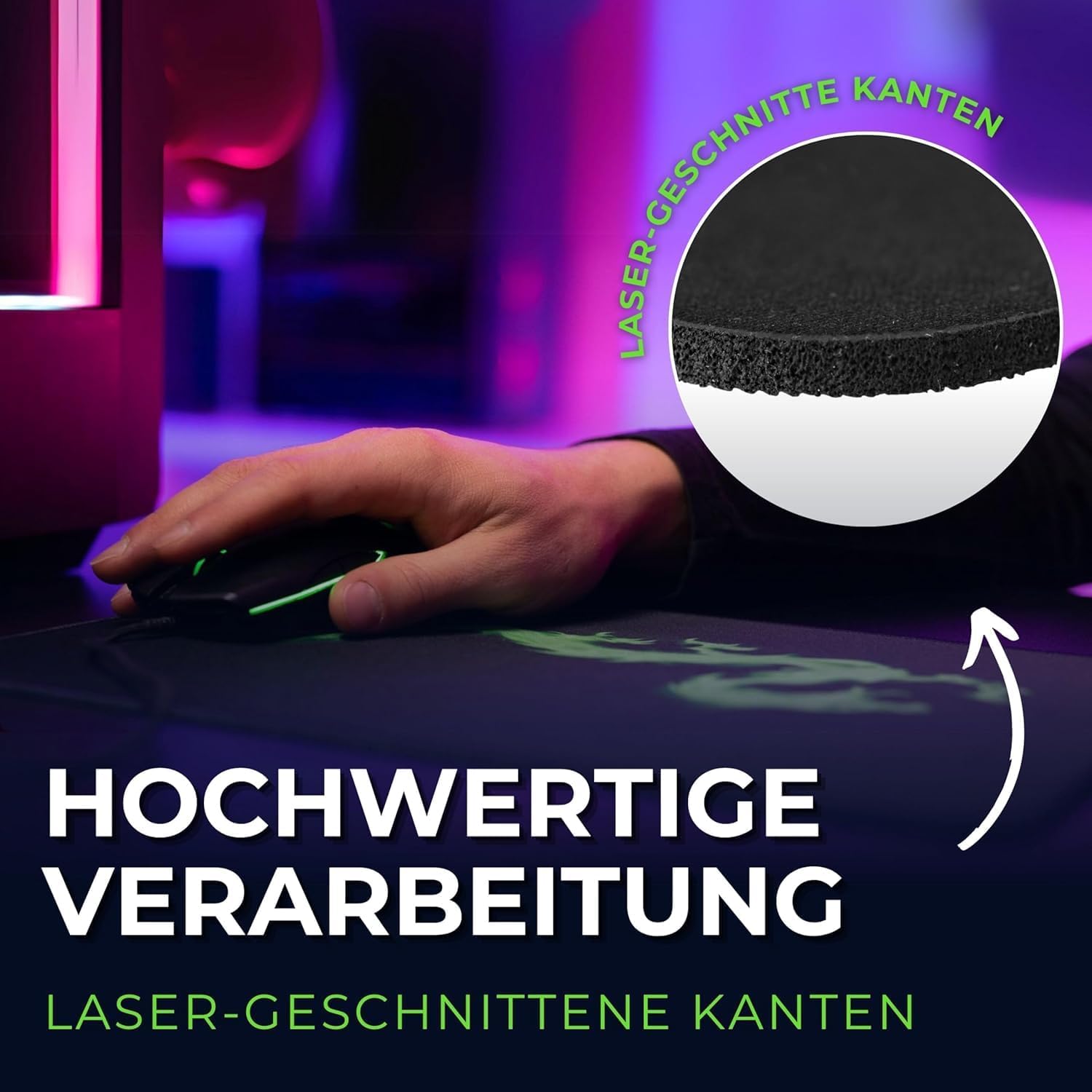 • Основа от естествен каучук: благодарение на неплъзгащата се долна страна, изработена от естествен каучук, подложката за мишка винаги остава на мястото си - дори върху гладки повърхности. Без подхлъзване, без пренастройване, само пълна концентрация върху играта или работата. Нашите подложки за мишка за геймъри/офис могат да се навиват по всяко време, те отново лежат напълно плоски.