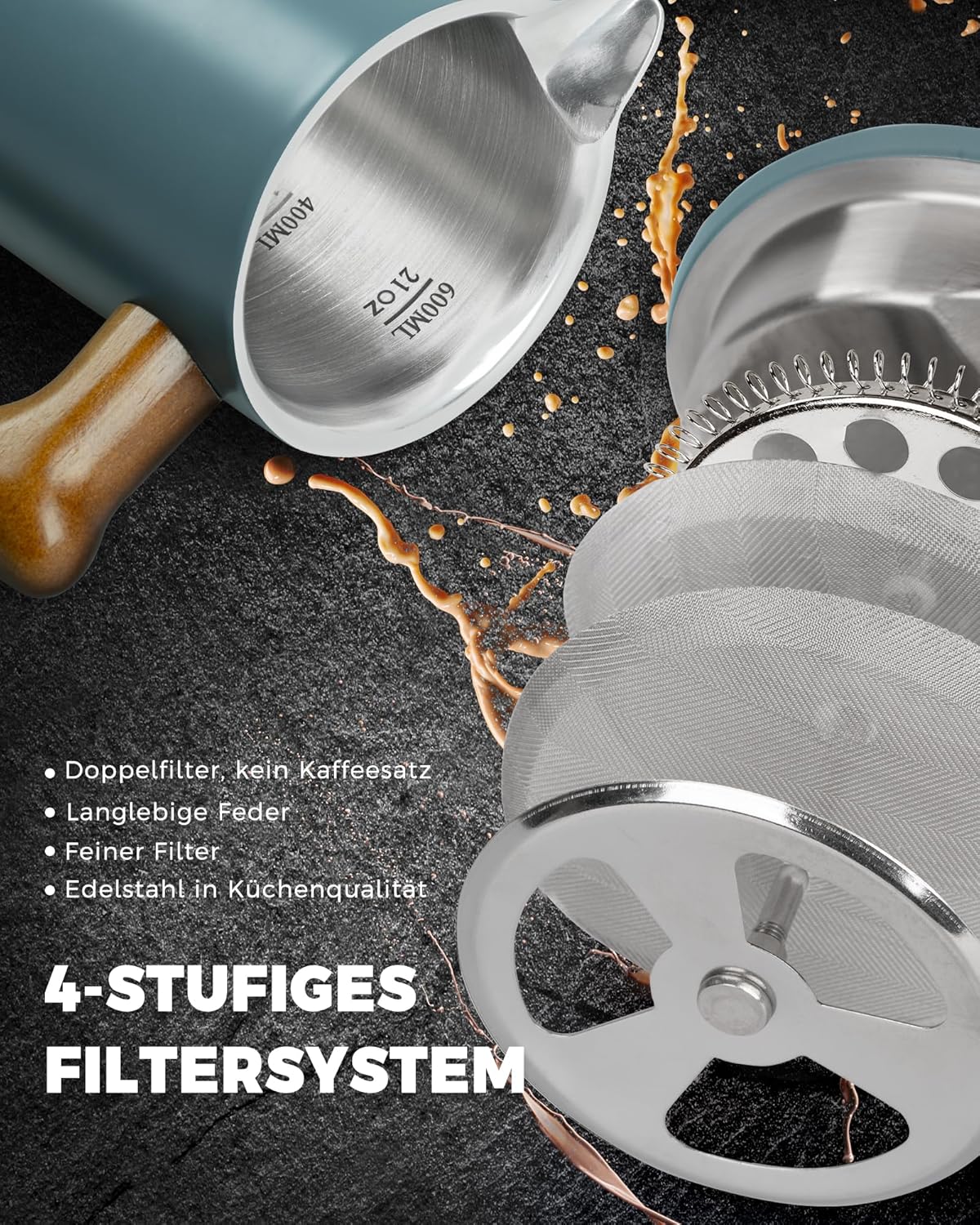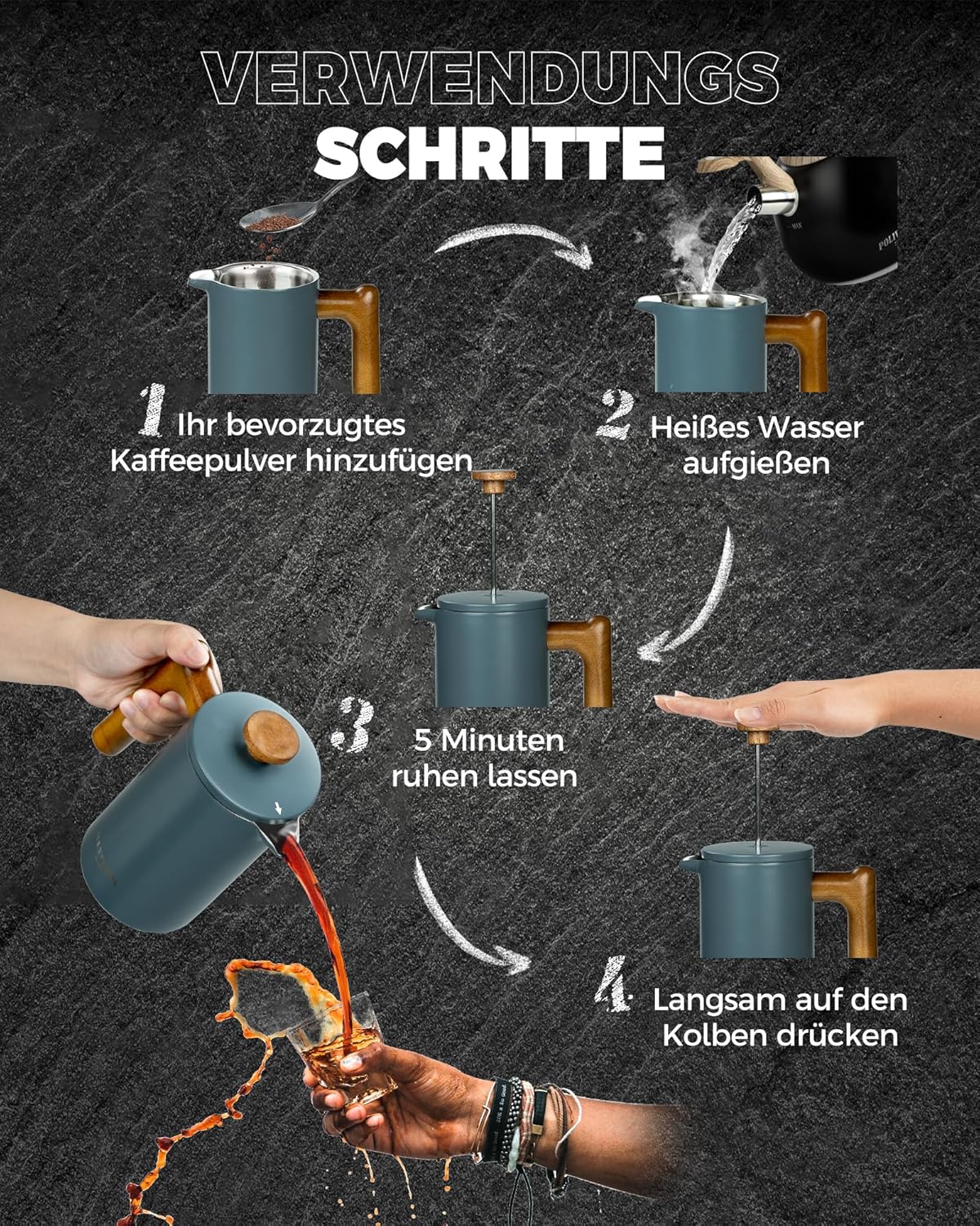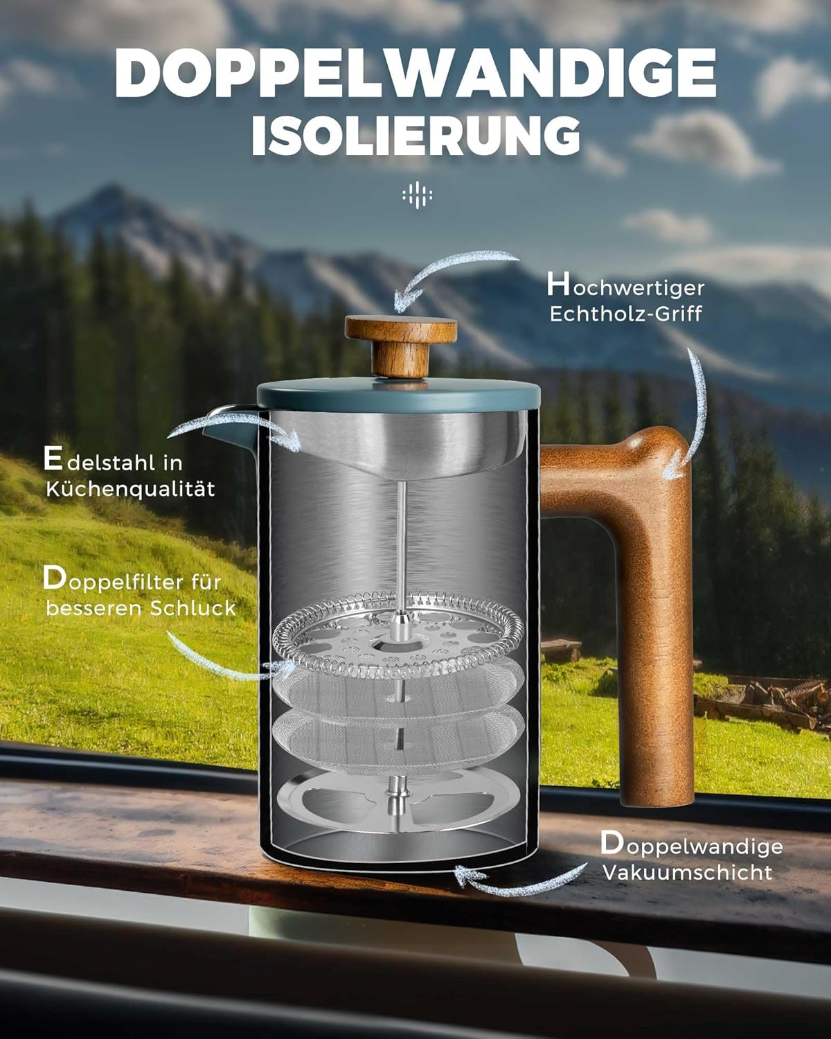 • Двустенна изолация: Нашата кафеварка с двуслойна конструкция е изработена от двустенна неръждаема стомана, така че можете да поддържате кафето си топло за по-дълго време, отколкото стъклена френч преса. Средно напитките остават топли за 60 минути по-дълго. Следователно, кафеварката поддържа кафето или чая топли за по-дълго време, като при допир отвън не се усеща твърде горещо.