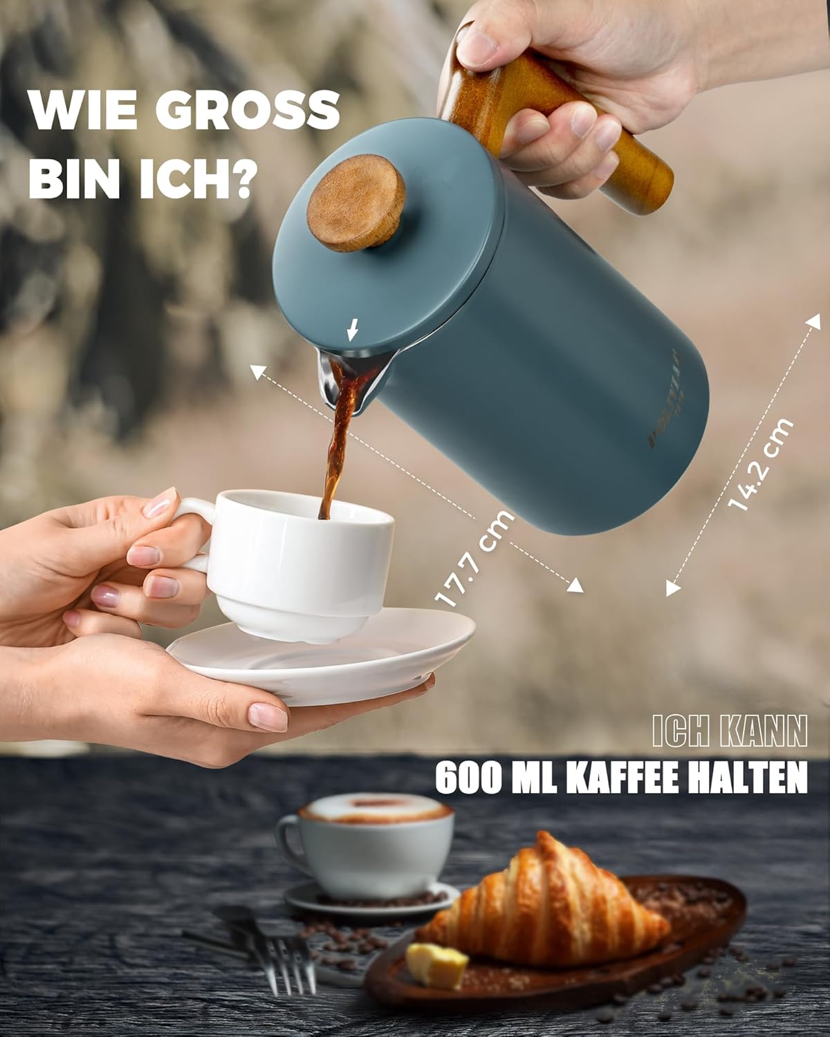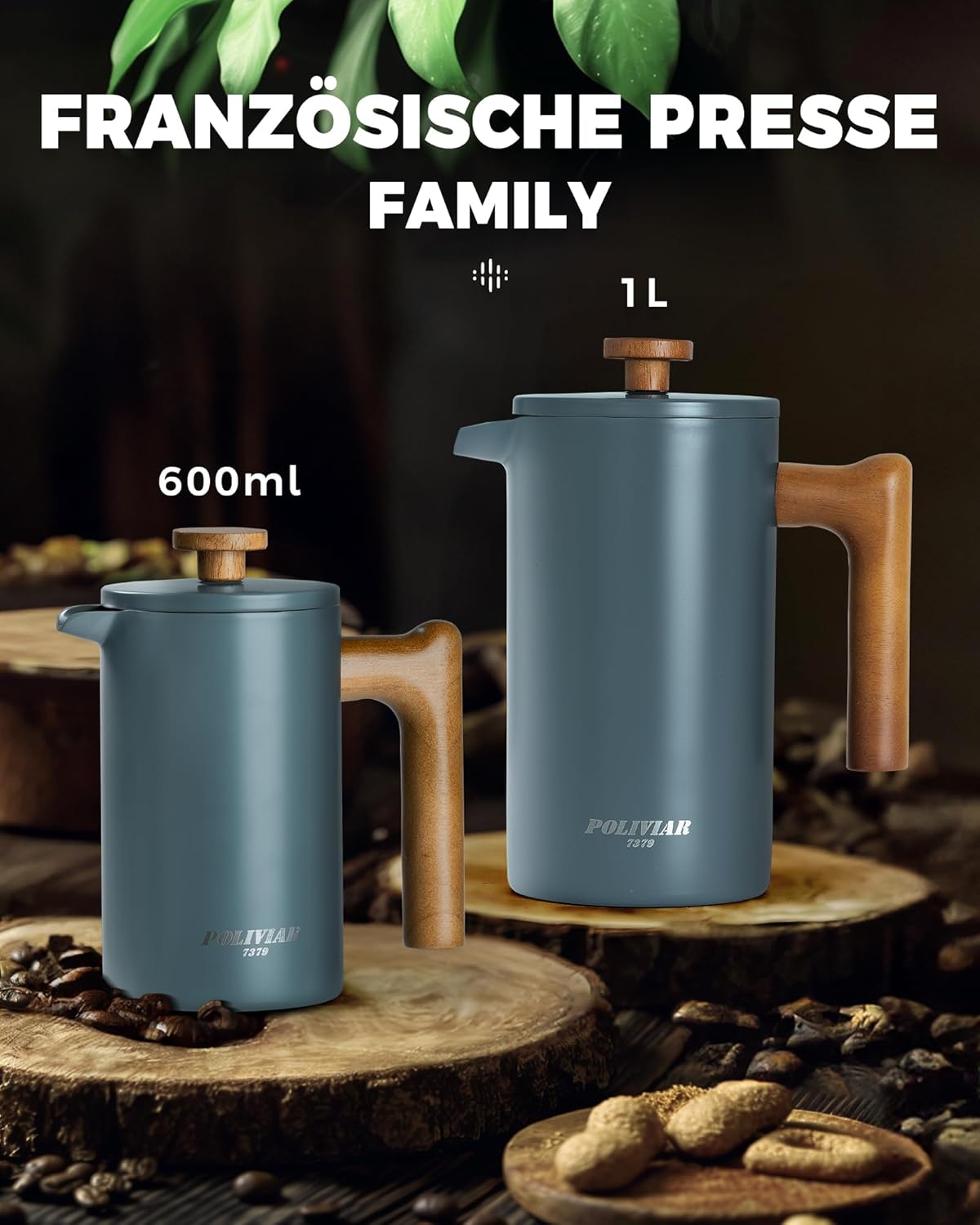 Poliviar JX2024-SFPU-DE Кафемашина с френска преса 600 мл/21 унции, двустенна изолирана кана за кафе и чай, ръчна филтърна преса за кафе с бутало и дървена дръжка, синя