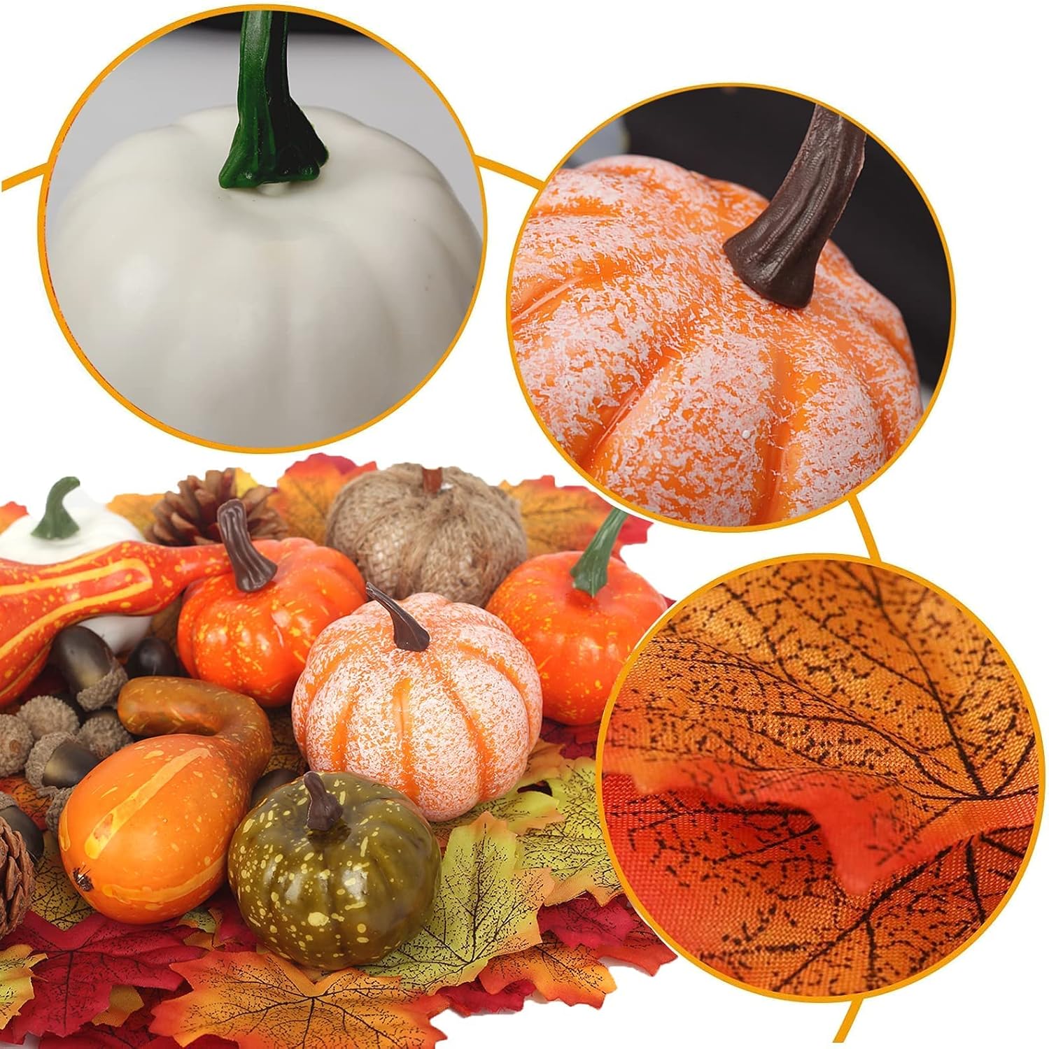 • ВИСОКОКАЧЕСТВЕНИ ЕСЕННИ ДЕКОРАЦИИ Тези тикви са изработени от висококачествена пяна и боядисани с безопасна, нетоксична, екологична боя. Всички те са леки, издръжливи и изглеждат ярки и сладки.
