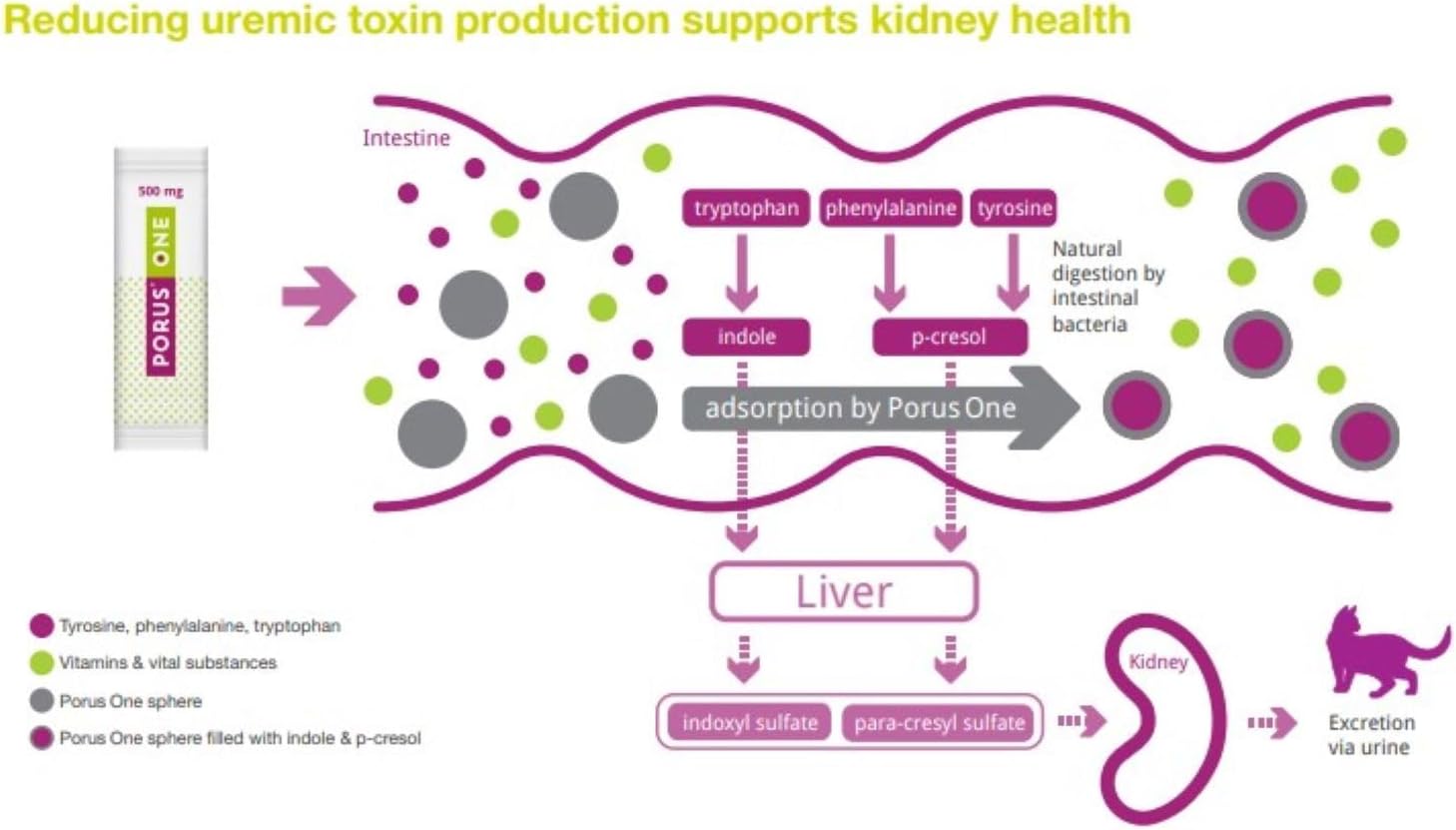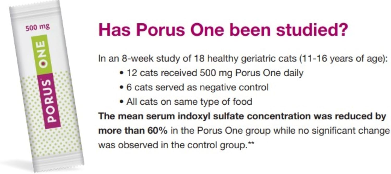 Porus One е продукт за бъбреците на котките. Porus One може да помогне за абсорбирането на прекурсорите на така наречените уремични токсини (бъбречни отрови) на мястото им на произход в червата и елиминирането им с изпражненията. Всички гранули Porus One се екскретират напълно. Самият Porus One не се метаболизира и следователно не натоварва метаболизма на котката. Какво представляват уремичните токсини и къде се произвеждат? Тези прекурсори се абсорбират и пътуват чрез кръвния поток до черния дроб, където се превръщат в действителните уремични токсини (бъбречни отрови). След това уремичните токсини пътуват чрез кръвния поток до бъбреците, където се екскретират с урината. Това се случва ежедневно и непрекъснато, защото котките консумират много протеини и следователно аминокиселини. Това обикновено не е проблем за котката. Въпреки това, в определени житейски ситуации може да бъде полезно да се намалят тези уремични токсини (бъбречни отрови), ако се натрупат в кръвта. Известно е, че уремичните токсини, когато се натрупат в кръвта, могат директно да увредят бъбреците и други органи. Намаляването на приема на протеини в диетата може да намали количеството уремични токсини (бъбречни отрови). Сега обаче е възможно прекурсорите на уремичните токсини да се свържат директно в червата и да се отделят с изпражненията. Това предотвратява образуването на уремични токсини и котката не е нужно да се отказва от вкусни протеини. Какво представлява Porus One? Мислете за сферите Renaltec като за малки прахосмукачки за прекурсорите на уремични токсини (бъбречни отрови). Вътре в сферите те улавят прекурсорите и след това ги отделят с изпражненията. Повърхността е толкова голяма, че една дневна доза стик Porus One на котка е достатъчна, за да улови достатъчно прекурсори на уремични токсини. Тези прекурсори след това предотвратяват образуването на уремични токсини.