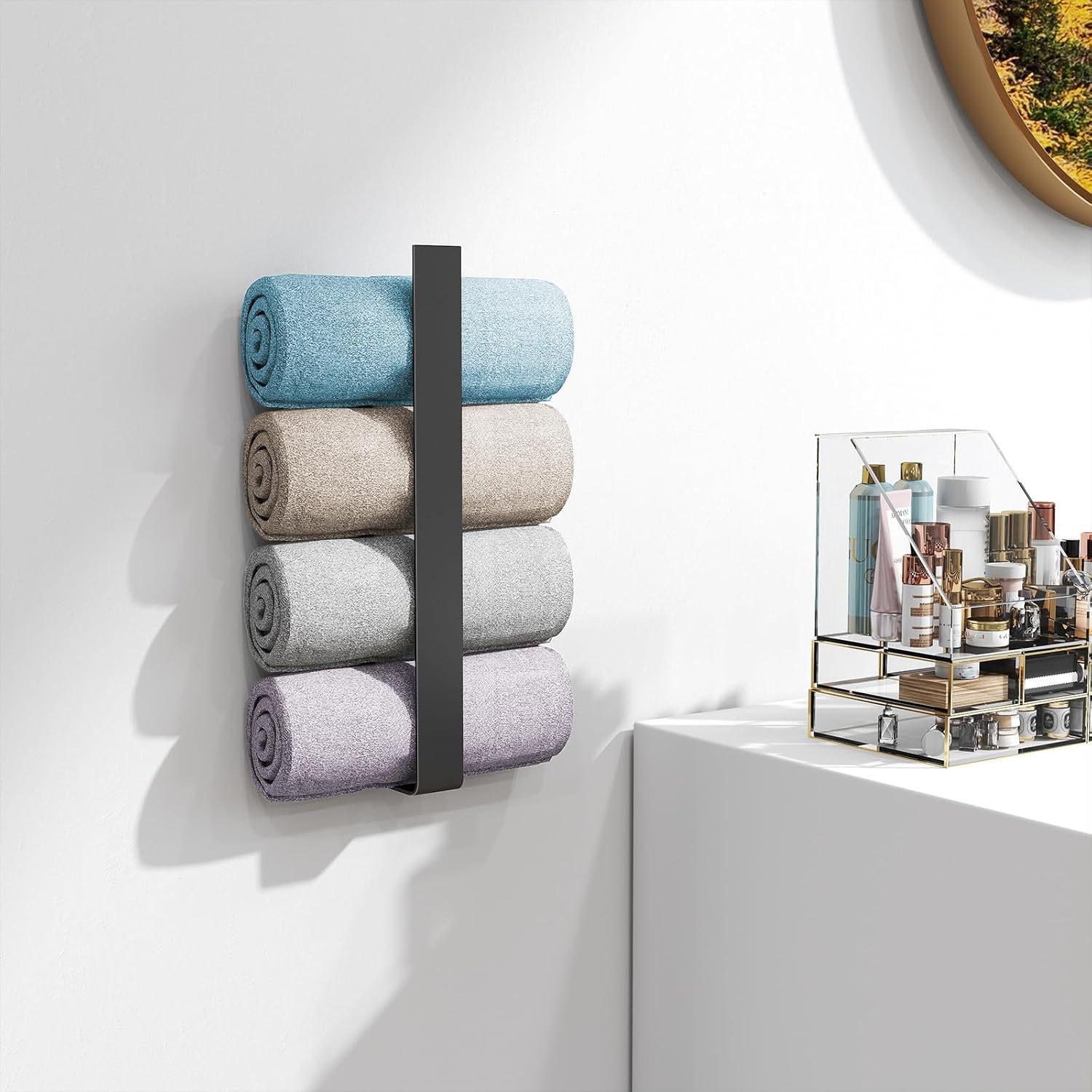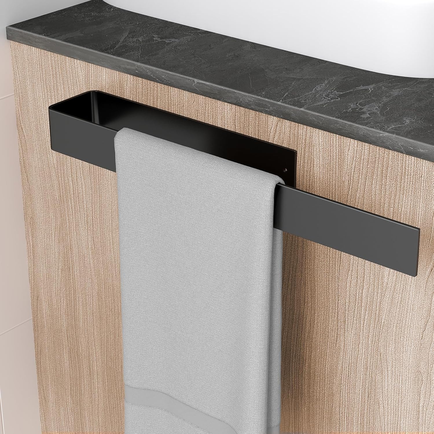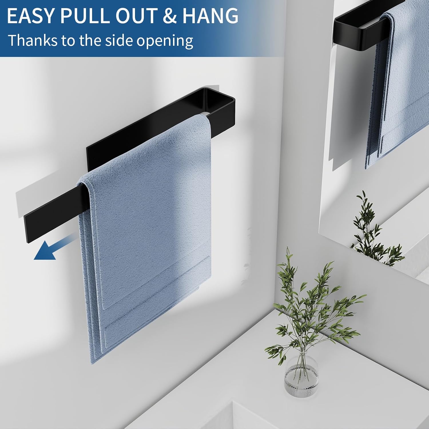• Висококачествен материал: черният държач за кърпи без пробиване е изработен от лек, издръжлив метал, който е устойчив на корозия и ръжда и издържа дълго време дори във влажна среда. Повърхността и ръбовете са гладки, така че ръцете и кърпите не се надраскват.