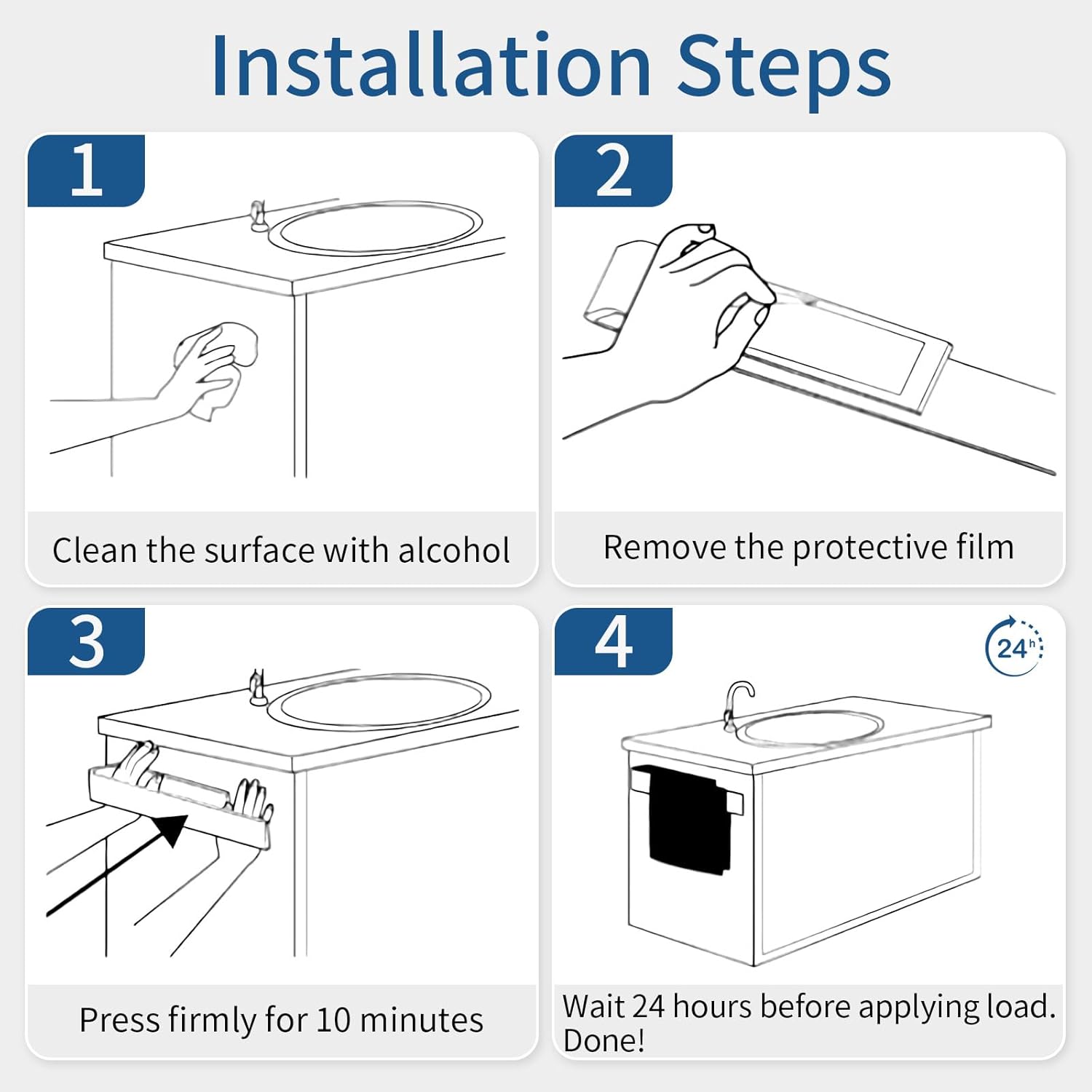 • Лесен монтаж: не е необходимо пробиване за монтаж на държача за кърпи за залепване. Просто отлепете лепилото 3M и го залепете върху гладката стена и мивката в банята, притиснете за 30 секунди и изчакайте 24 часа, за да окачите артикула.