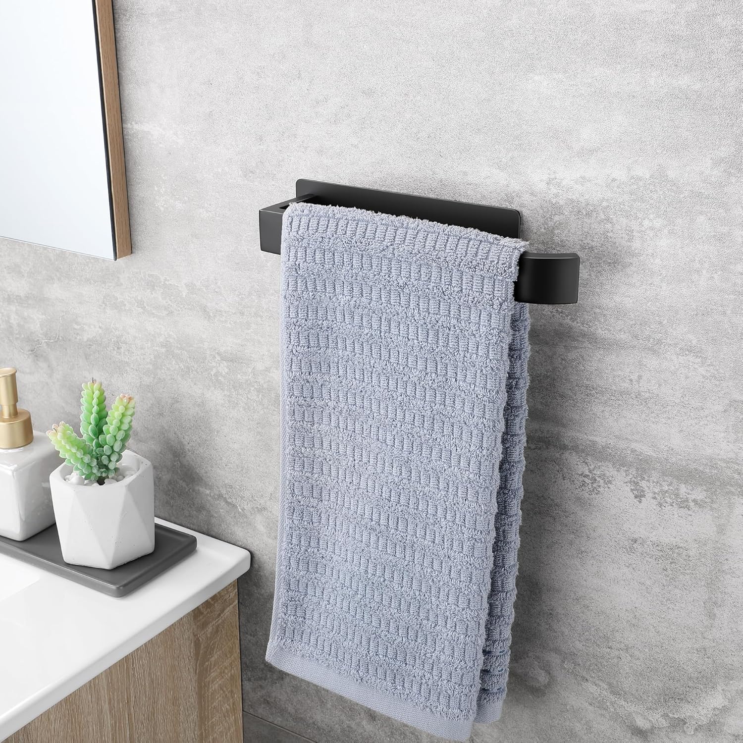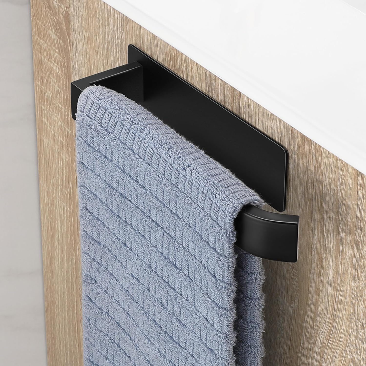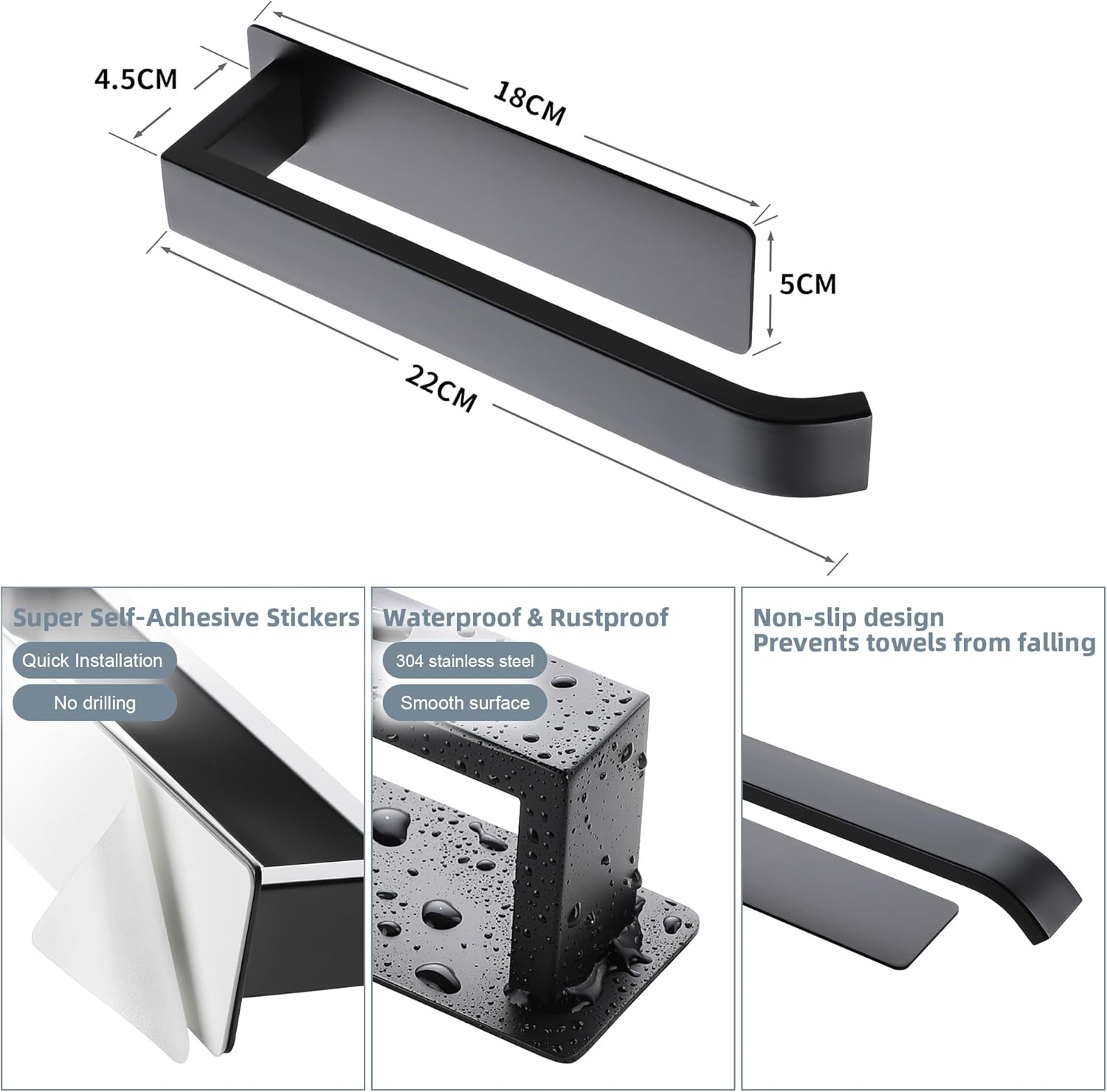 Поставка за кърпи, без пробиване, черна, матова, самозалепваща се, от неръждаема стомана 304, еднораменна поставка за кърпи, стенен държач за кърпи, държач за кърпи за залепване за баня и кухня, 22 см