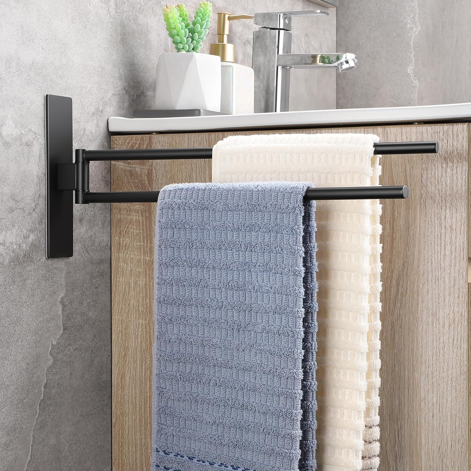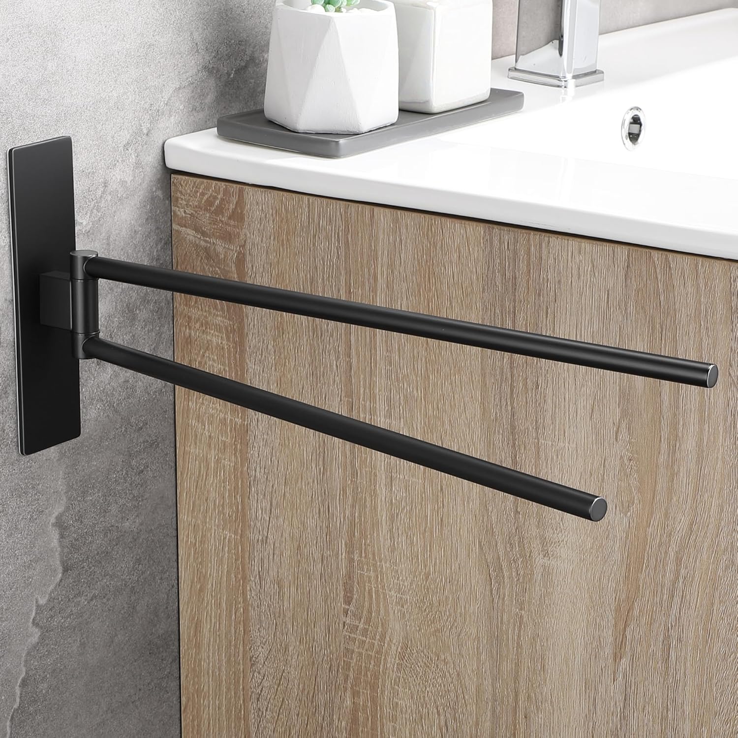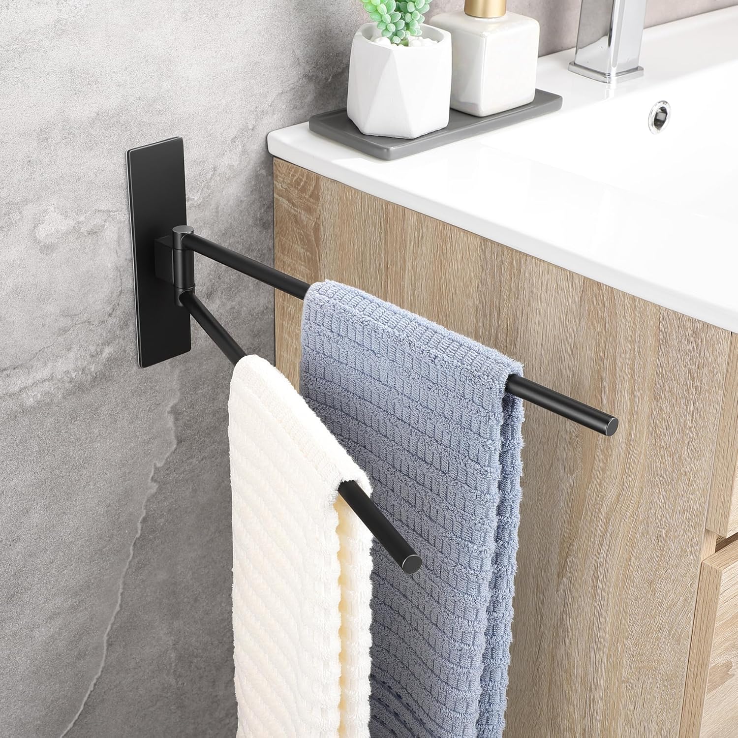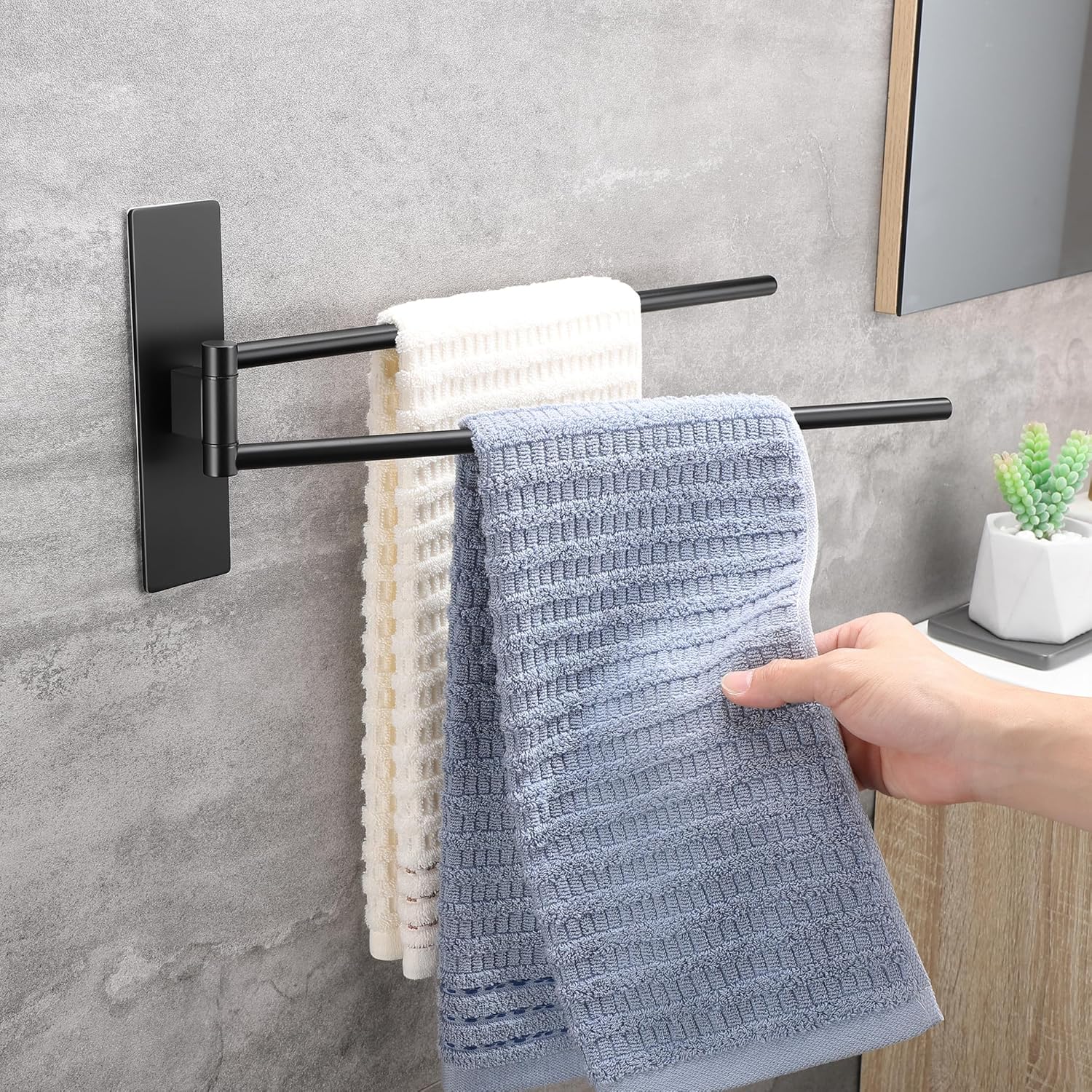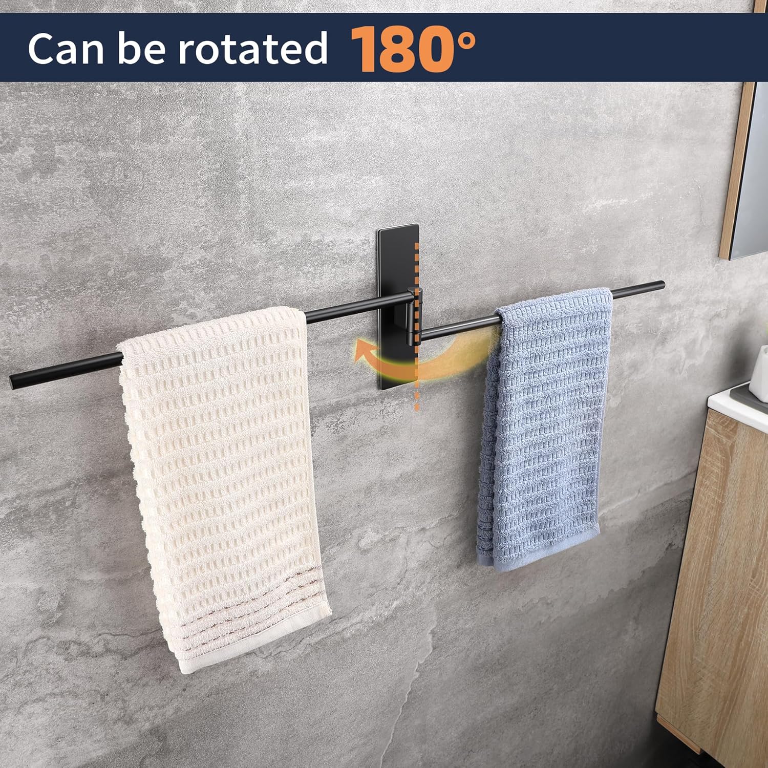 • НОВА ЪПГРАД Самозалепваща се поставка за кърпи, която може да се завърта на 180°, дизайн с двоен прът, може да окачи две кърпи едновременно, гъвкава за употреба. Увеличава лепящата повърхност на поставката за кърпи, по-стабилна е, ефективно намалява риска от падане.