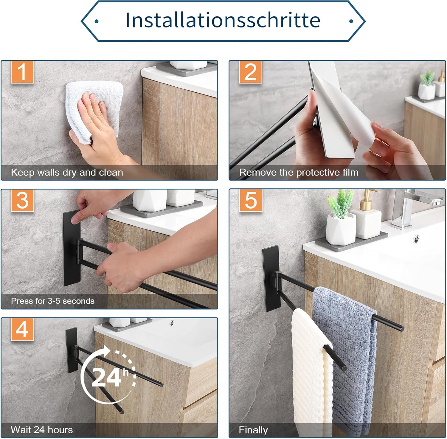 • Бърз монтаж без пробиване: просто отлепете защитното фолио от основата на поставката за кърпи, залепете я върху гладката стена и я натиснете за няколко секунди, за да я фиксирате. Няма да повреди стената, идеална за бани и кухни, които не могат да се пробиват.
