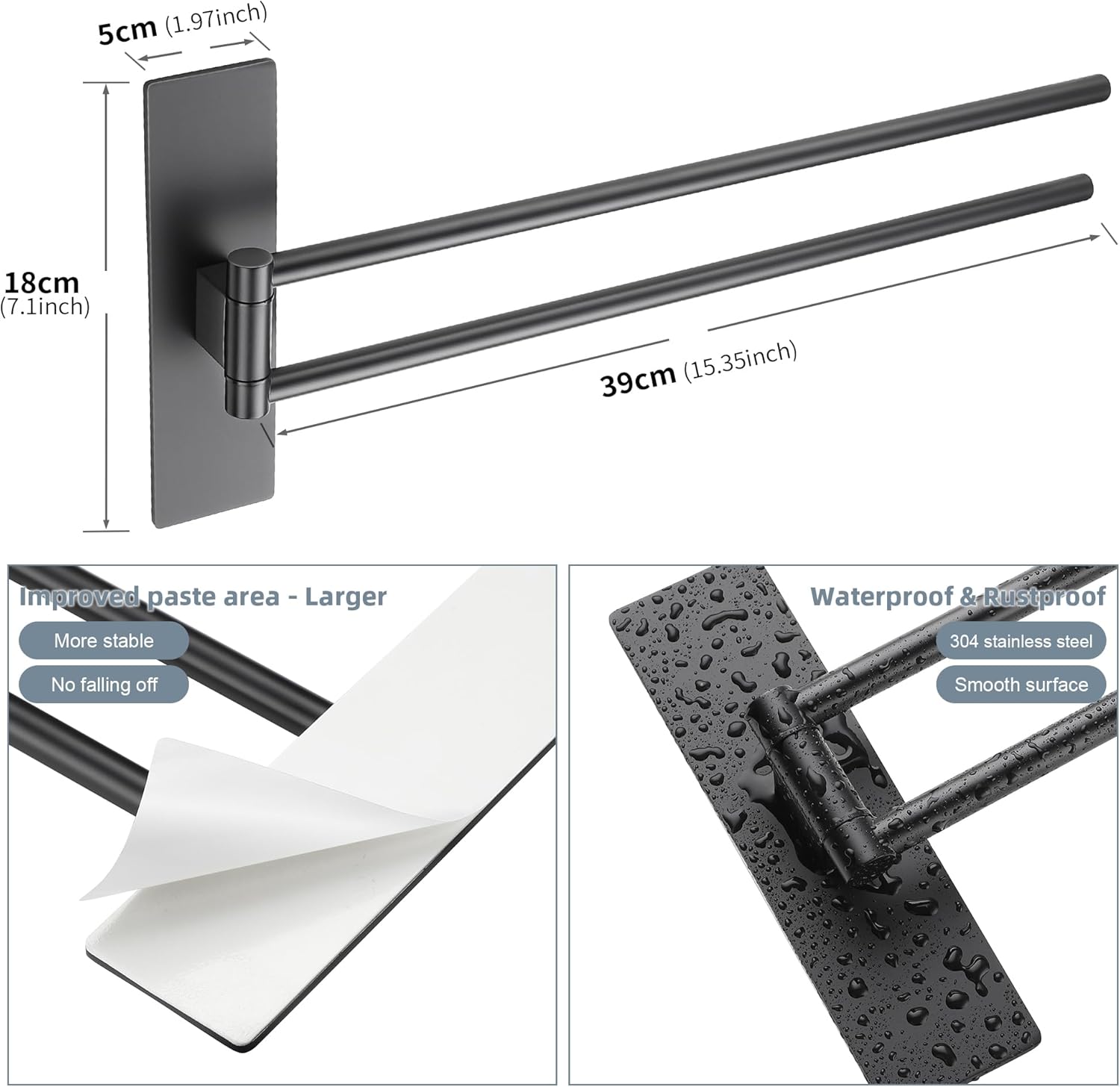 Поставка за кърпи, без пробиване, черна, матова, въртяща се на 180°, самозалепваща се, от неръждаема стомана 304, държач за кърпи за баня, двоен държач за кърпи, 39 см
