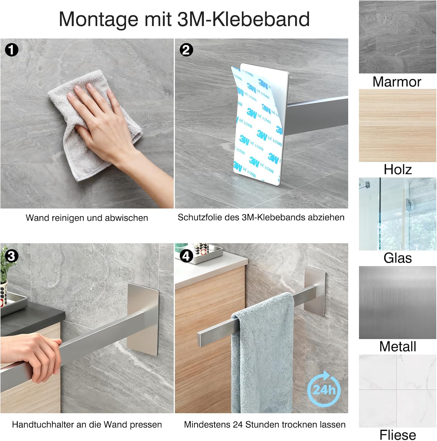 • Поставка за кърпи без пробиване: модерна поставка за кърпи, която се залепва върху гладка повърхност с малко подготовка, след което се изчаква и след 24 часа може да се опъне, сякаш е била пробита. Много е важно за плочките да бъдат старателно почистени. Без пробиване, без винтове, без дупки, без инструменти, лепило 3M вместо пробиване, без повреди по стената.