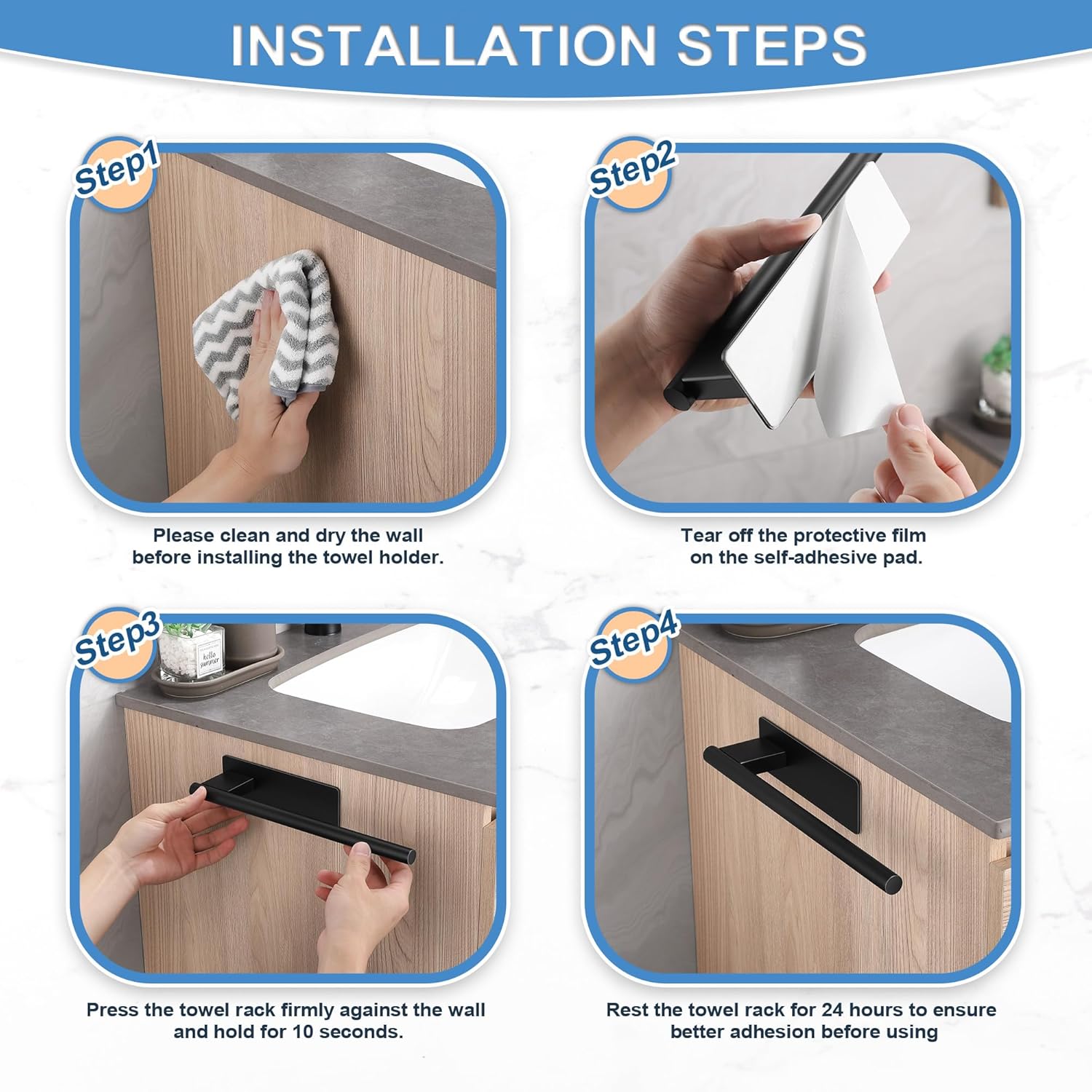 • Поставка за кърпи без пробиване: просто избършете стената, след това отстранете защитното фолио отзад и го залепете върху гладката стена, като натиснете здраво за няколко секунди, след което изчакайте 48 часа, преди да можете да ги използвате.