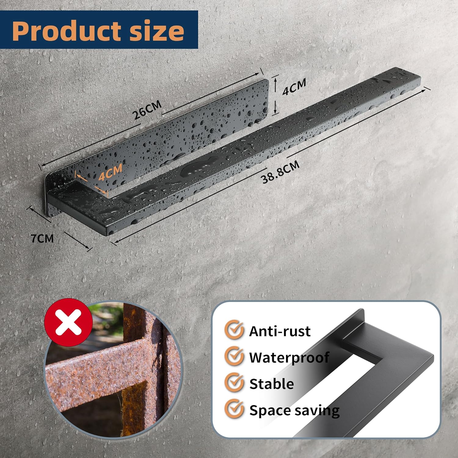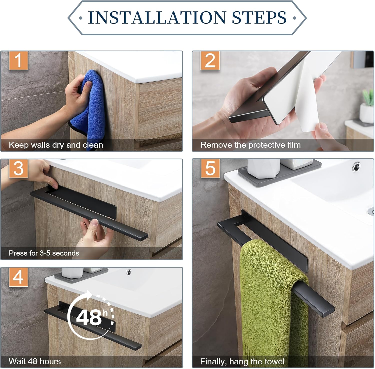 Размер на опаковката: 39 x 3,9 x 9,3 см. Материал: Неръждаема стомана. Метод на монтаж: Силна самозалепваща се подложка. Съдържание на опаковката: 1 x самозалепващ се държач за кърпи за баня, 1 x ръководство за потребителя (английски език не е гарантиран)
