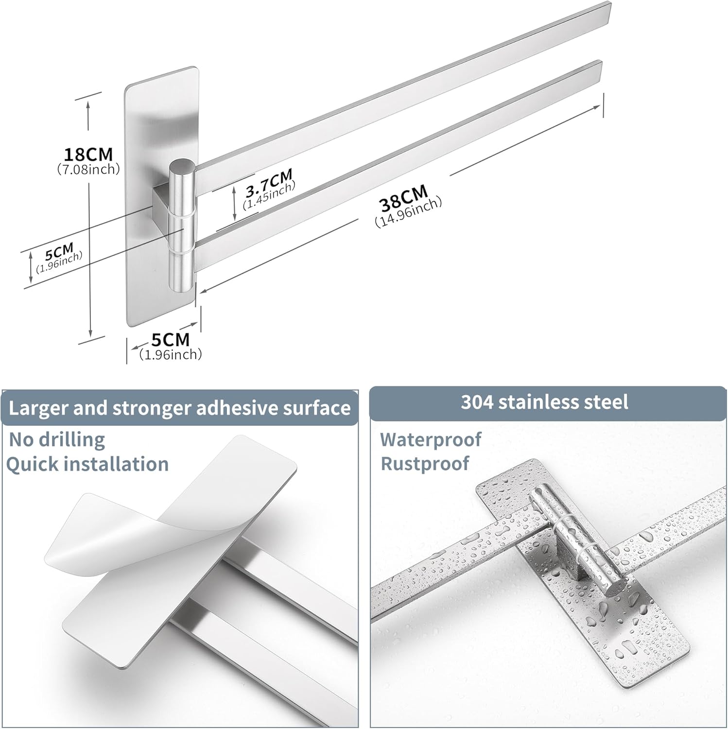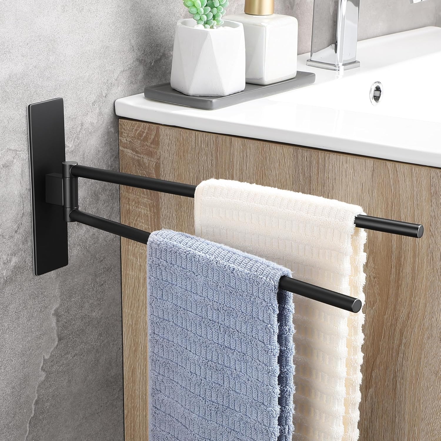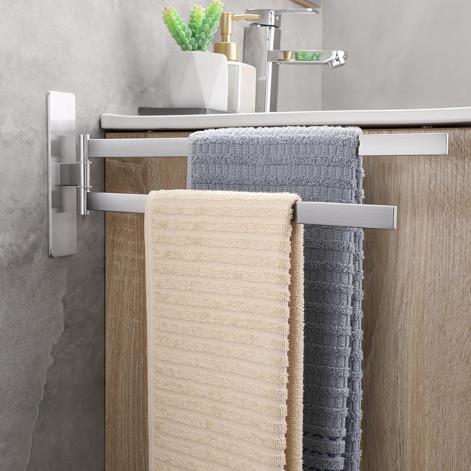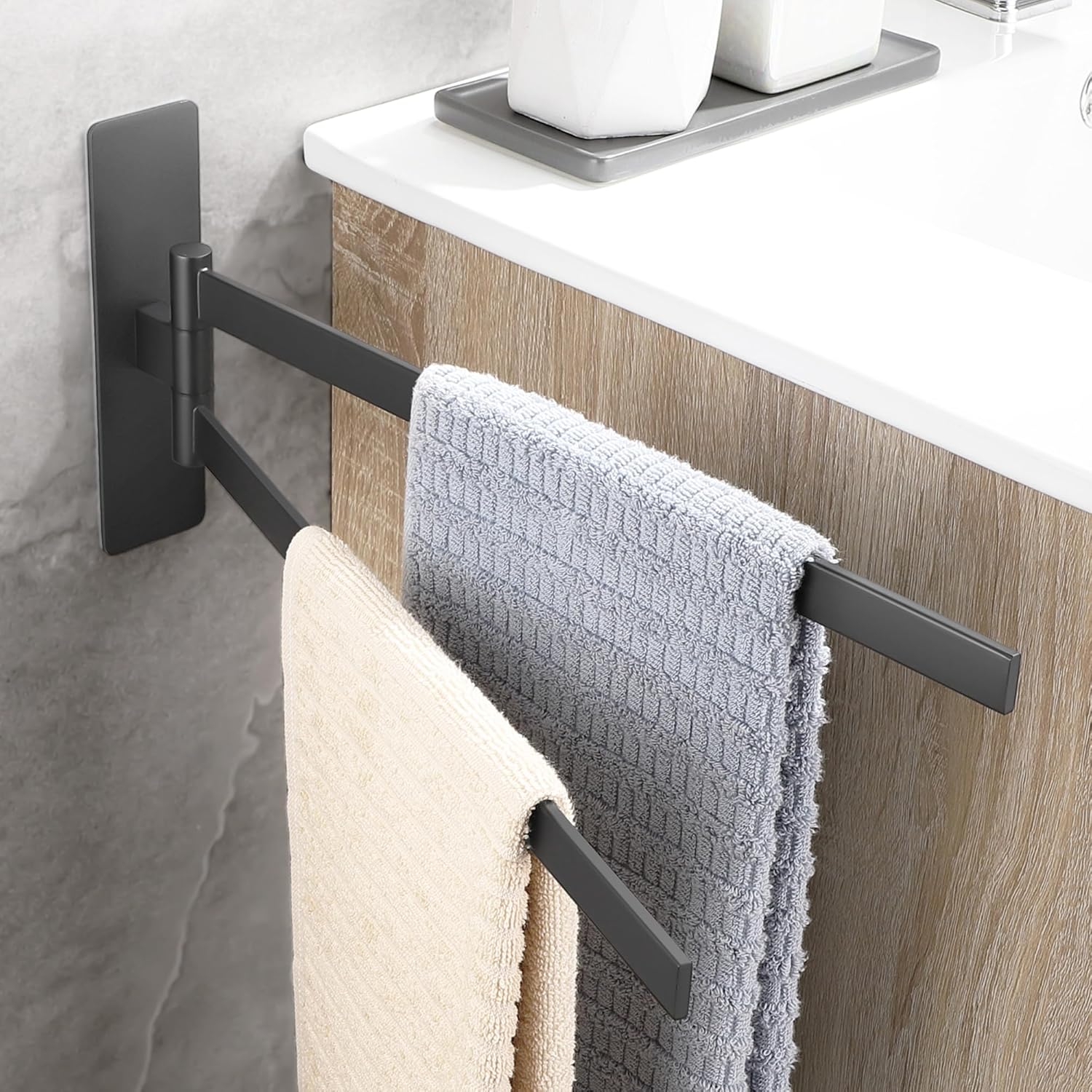 • НОВА ЪПГРАД Самозалепваща се поставка за кърпи, която може да се завърта на 180°, дизайн с двоен прът, може да окачи две кърпи едновременно, гъвкава за употреба. Увеличава лепящата повърхност на поставката за кърпи, по-стабилна е, ефективно намалява риска от падане.