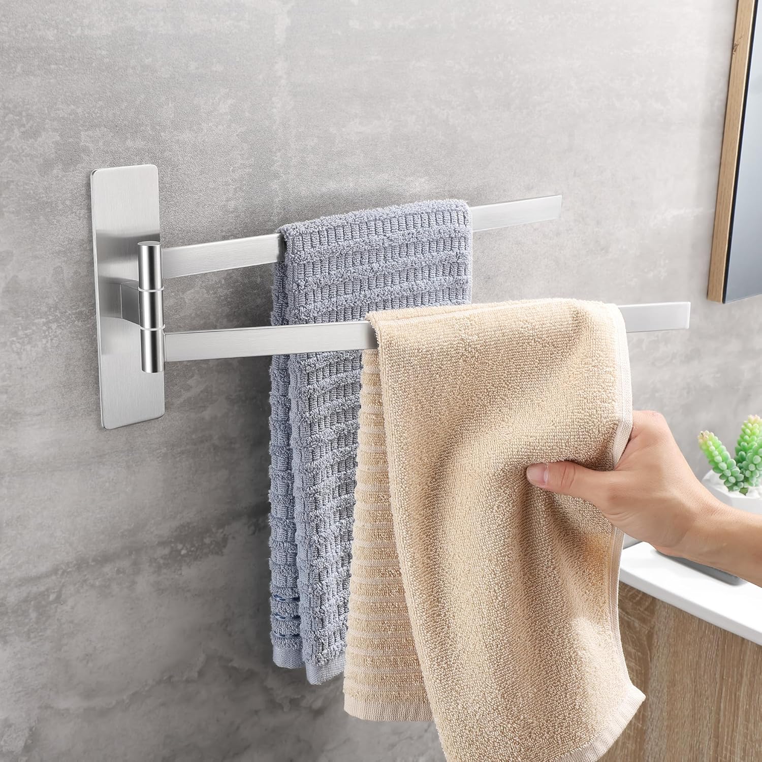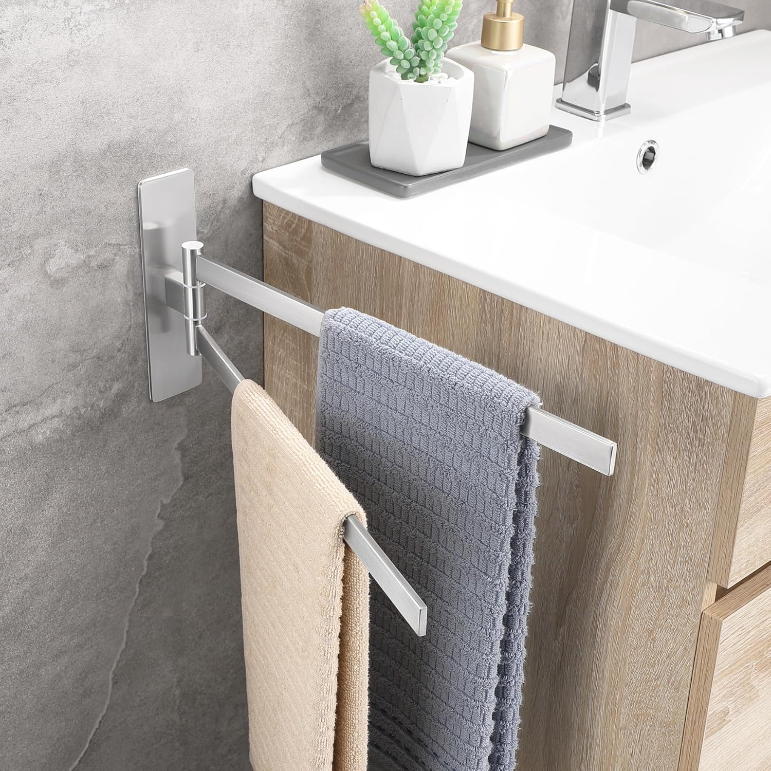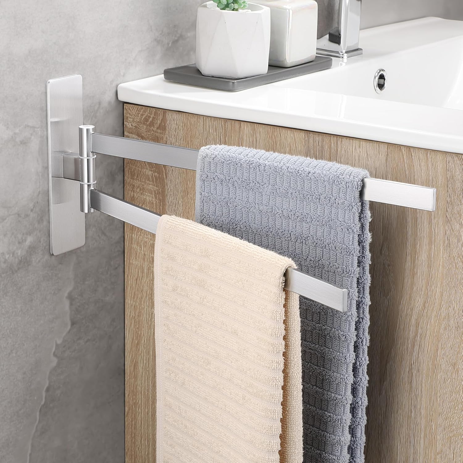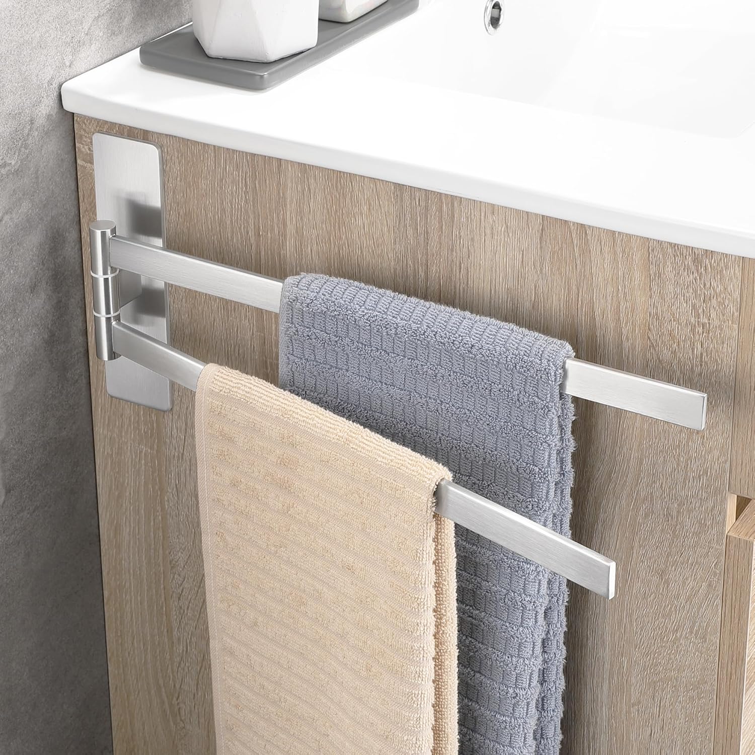 • НОВА ЪПГРАД Самозалепваща се поставка за кърпи, която може да се завърта на 180°, дизайн с двоен прът, може да окачи две кърпи едновременно, гъвкава за употреба. Увеличава лепящата повърхност на поставката за кърпи, по-стабилна е, ефективно намалява риска от падане.
