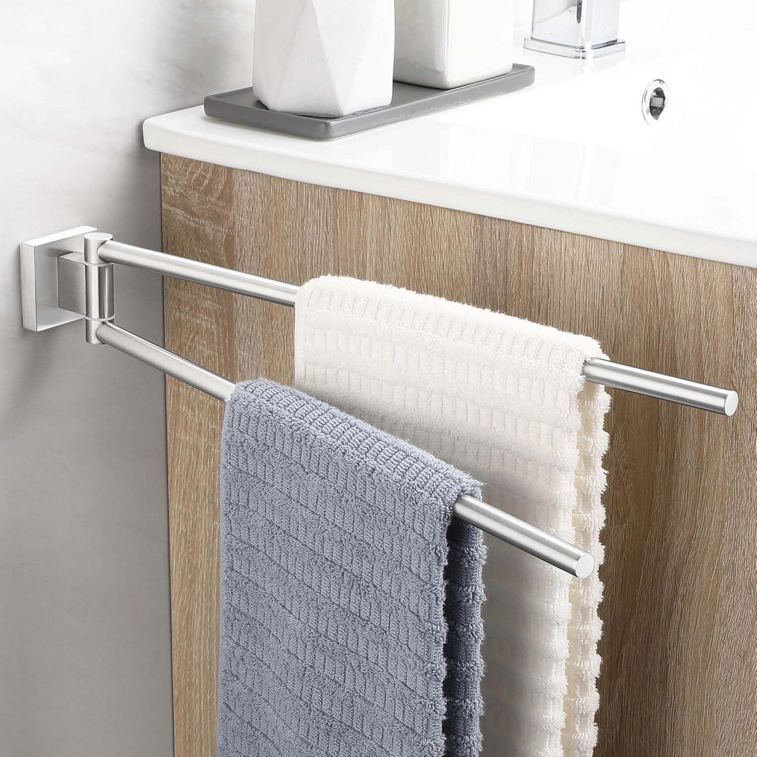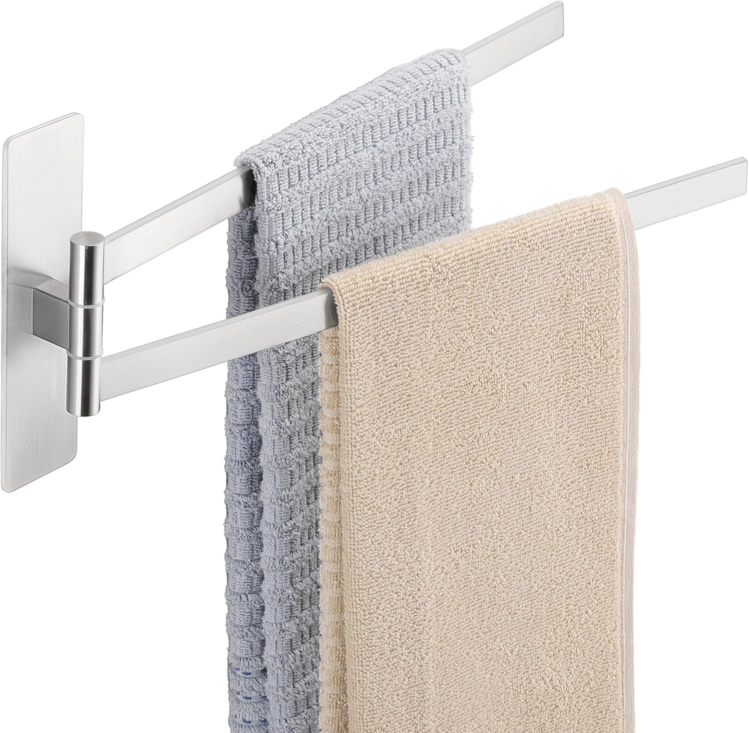 Поставка за кърпи, без пробиване, въртяща се на 180°, квадратна, самозалепваща се, от неръждаема стомана 304, двойна поставка за кърпи, сребриста