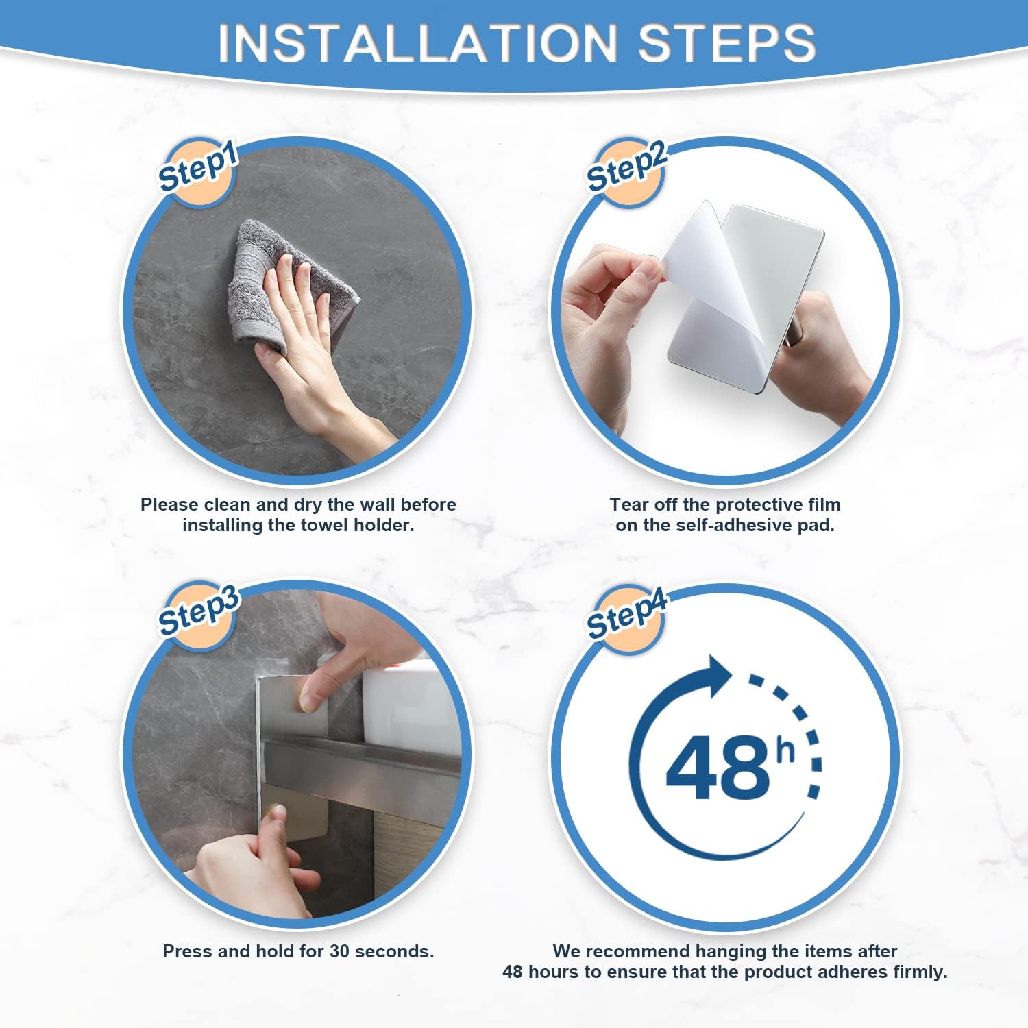 • Поставка за кърпи без пробиване: просто избършете стената, след това отстранете защитното фолио отзад и го залепете върху гладката стена, като натиснете здраво за няколко секунди, след което изчакайте 48 часа, преди да можете да ги използвате.