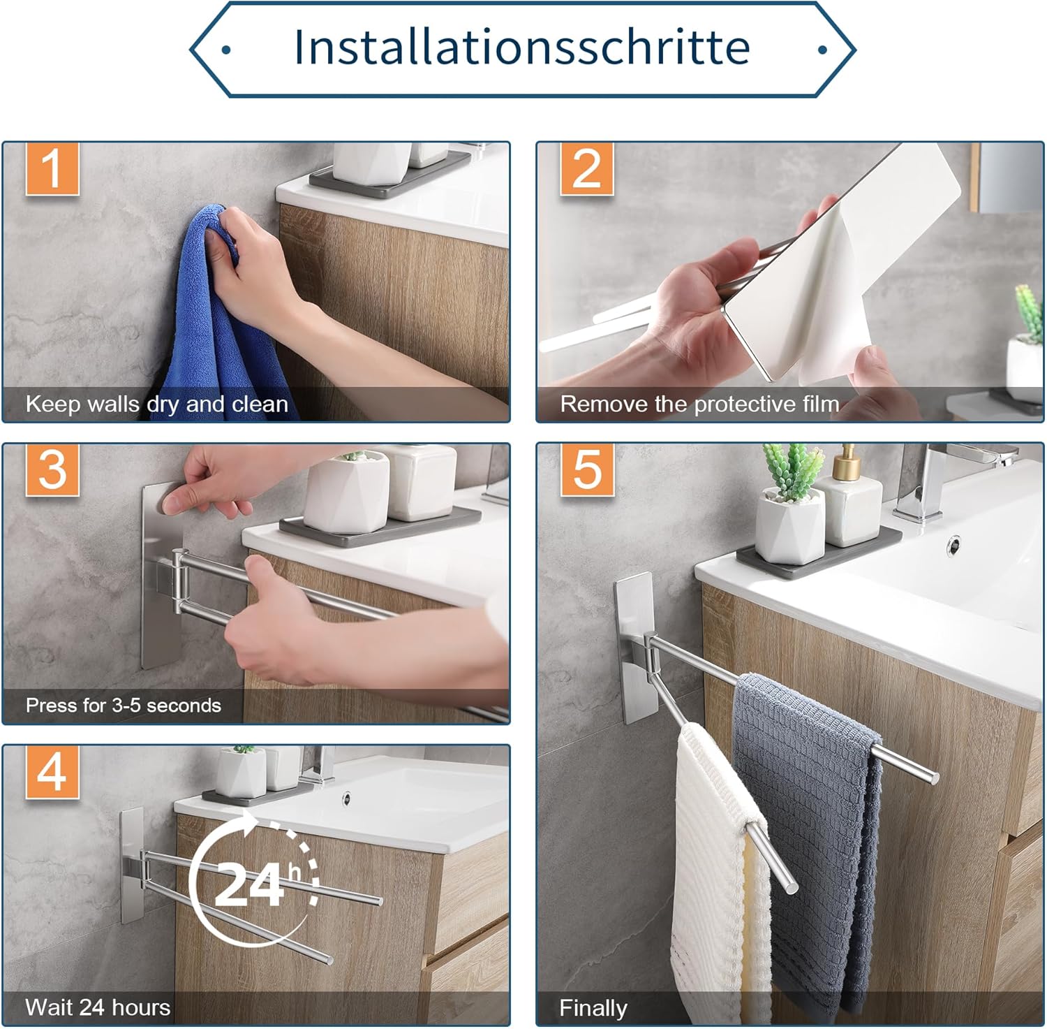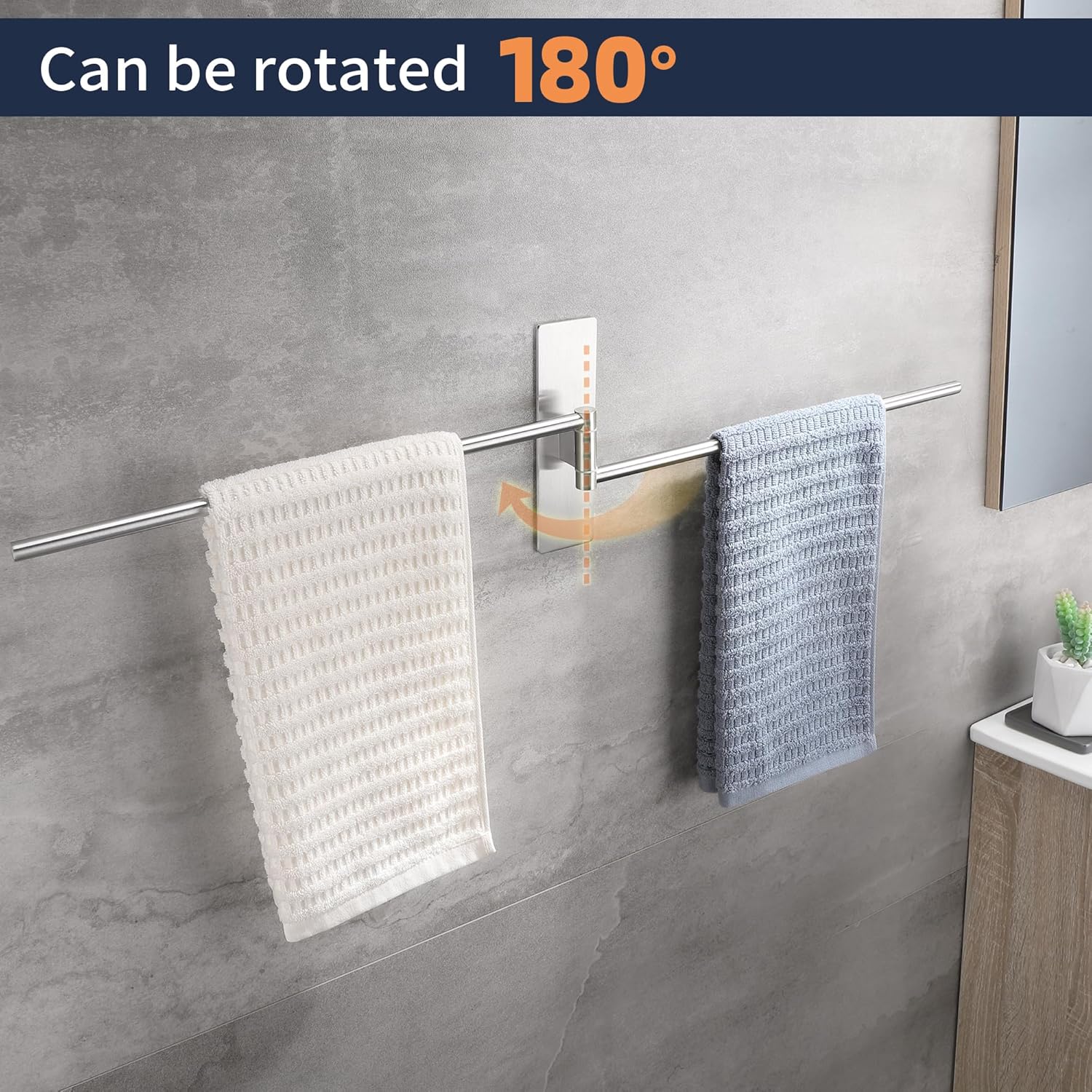 • НОВА ЪПГРАД Самозалепваща се поставка за кърпи, която може да се завърта на 180°, дизайн с двоен прът, може да окачи две кърпи едновременно, гъвкава за употреба. Увеличава лепящата повърхност на поставката за кърпи, по-стабилна е, ефективно намалява риска от падане.