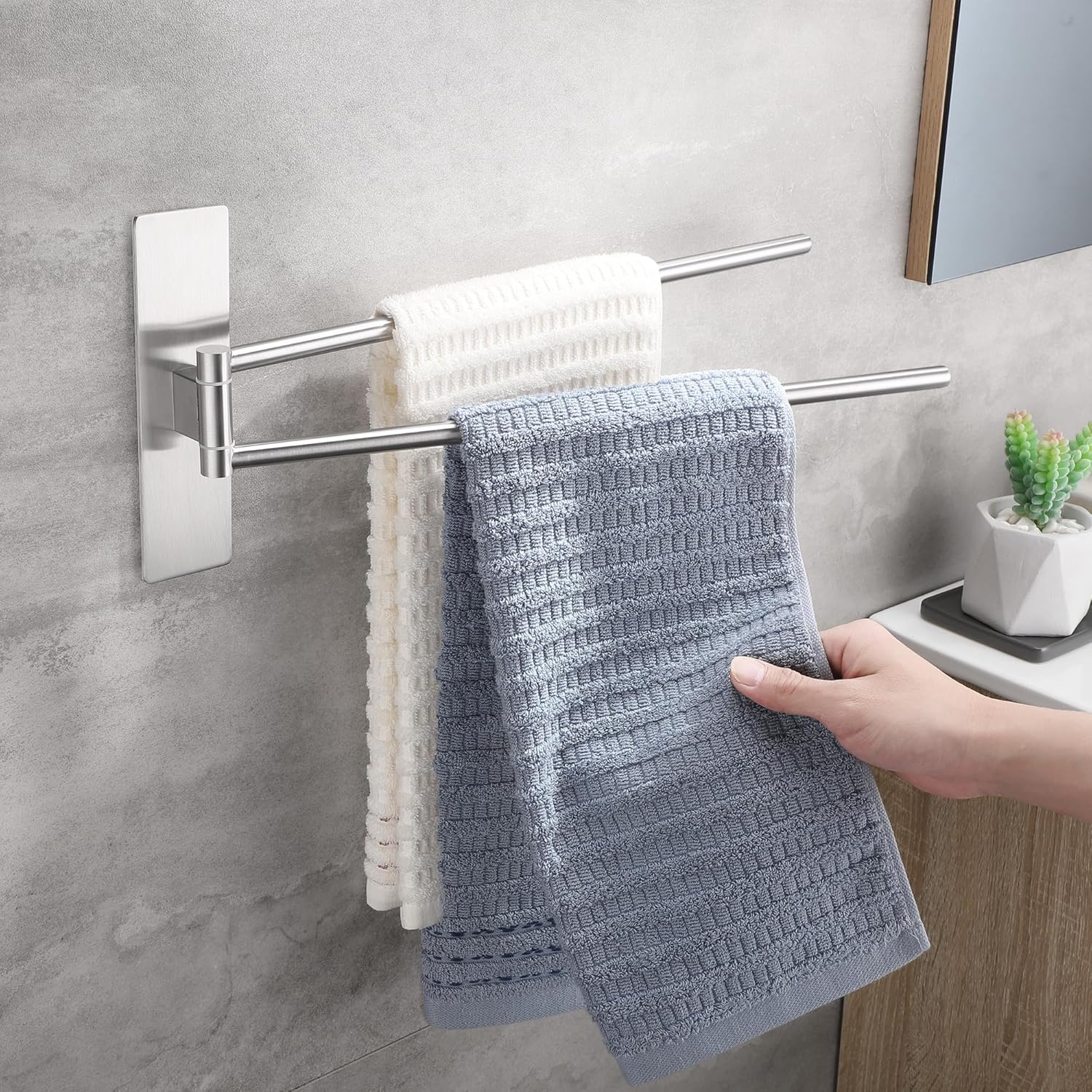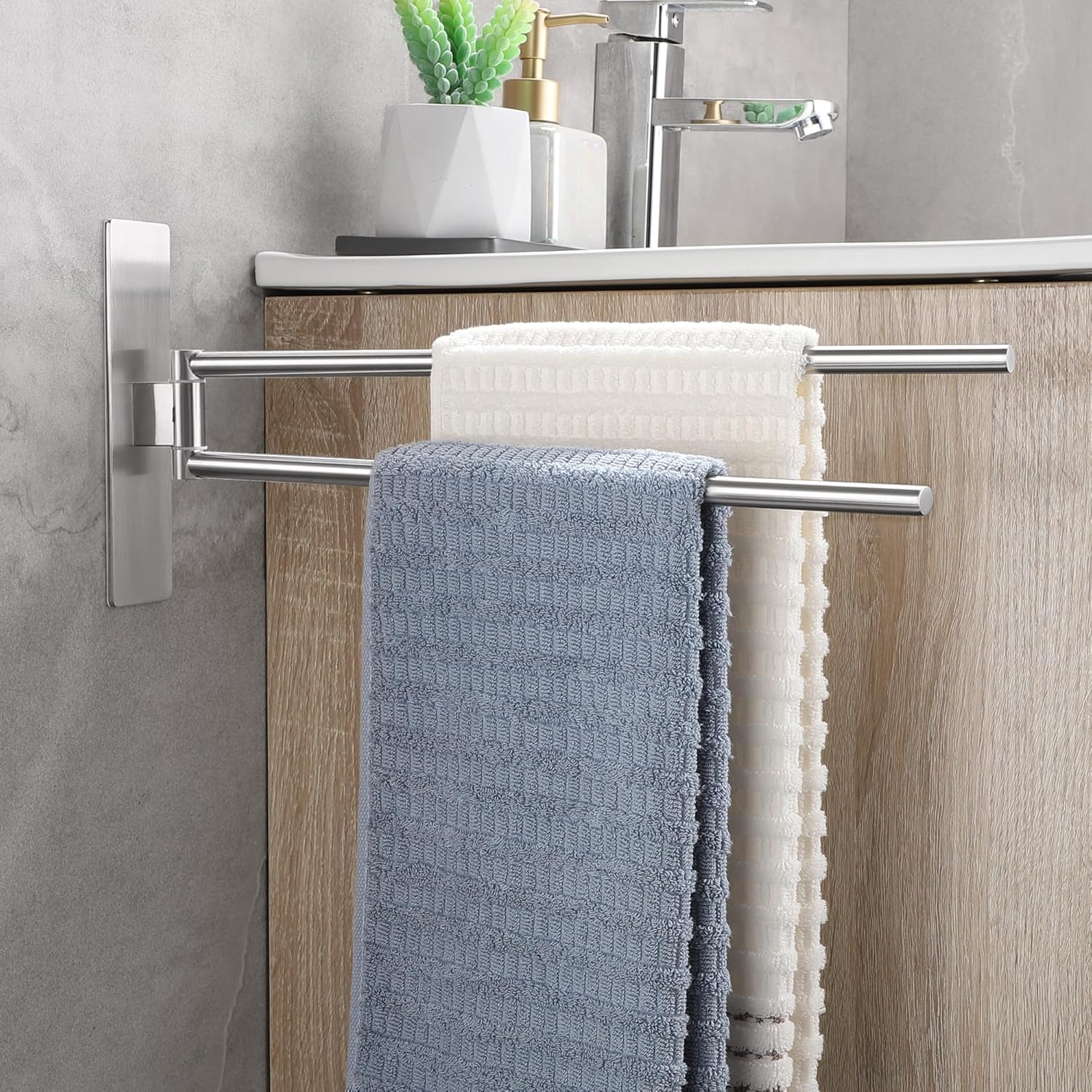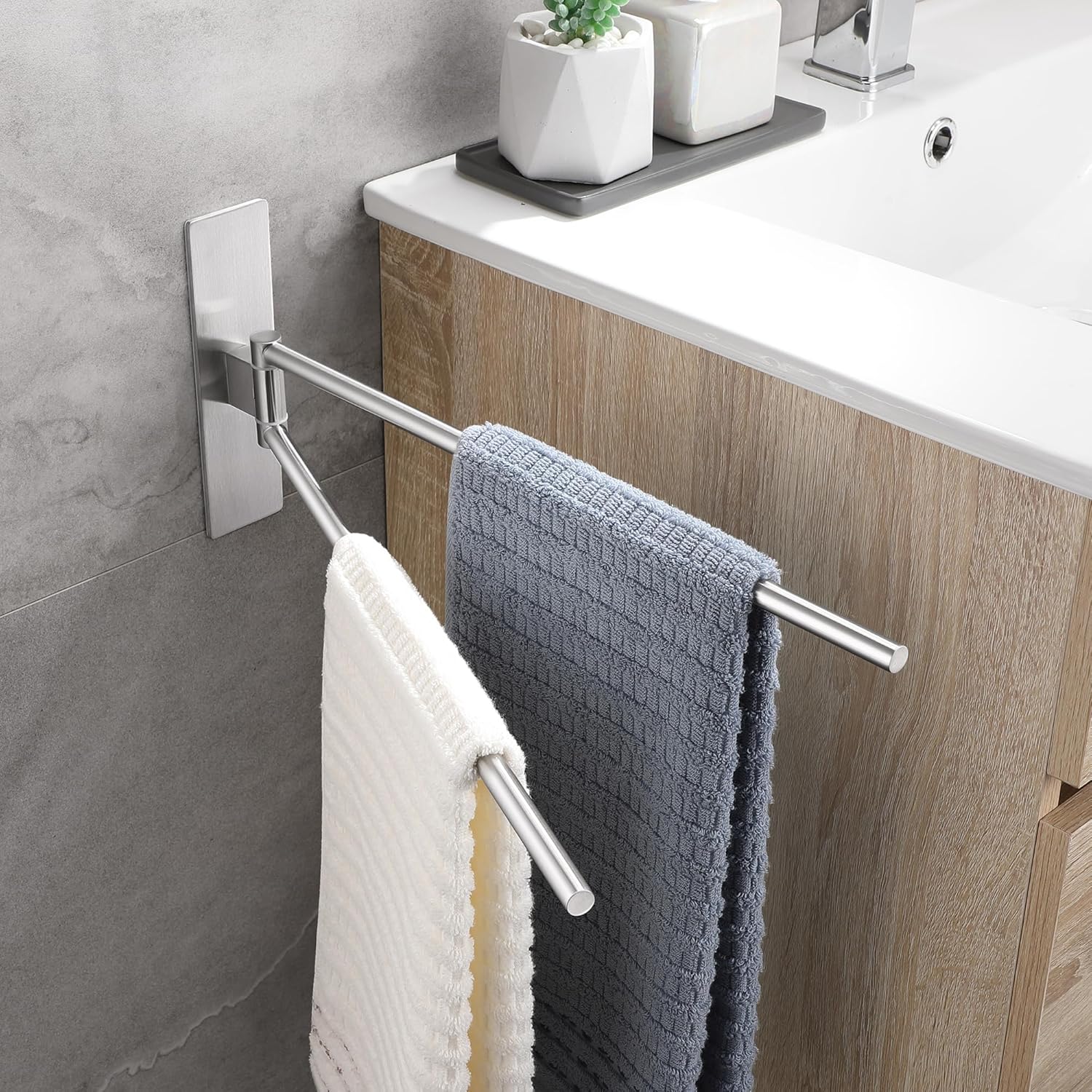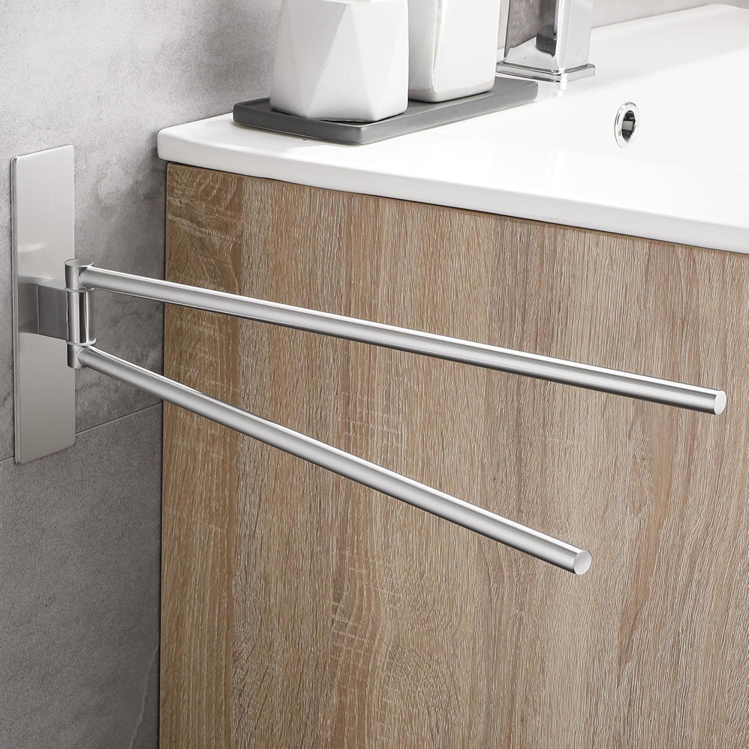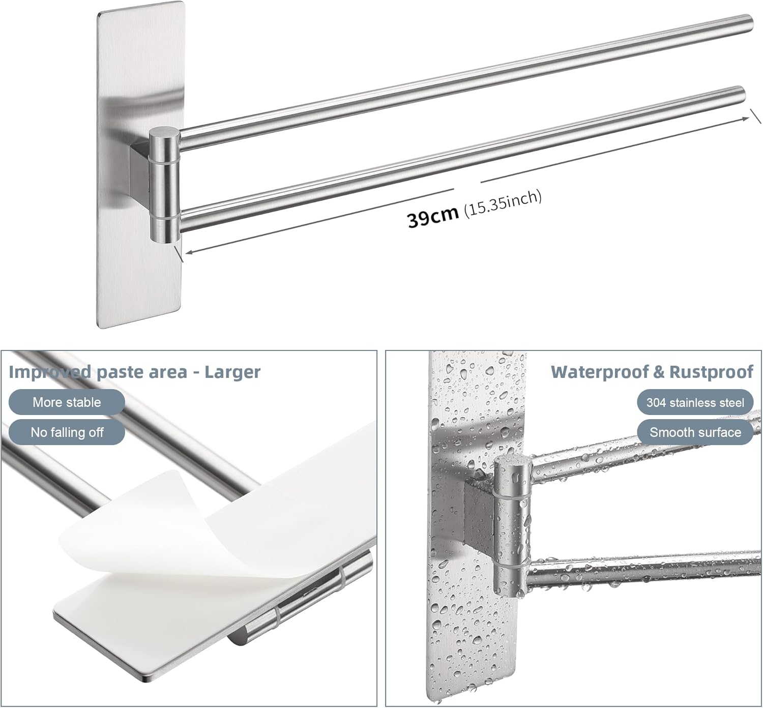 Поставка за кърпи, въртяща се на 180°, без пробиване, самозалепваща се, от неръждаема стомана 304, двойна поставка за кърпи, матово сребристо
