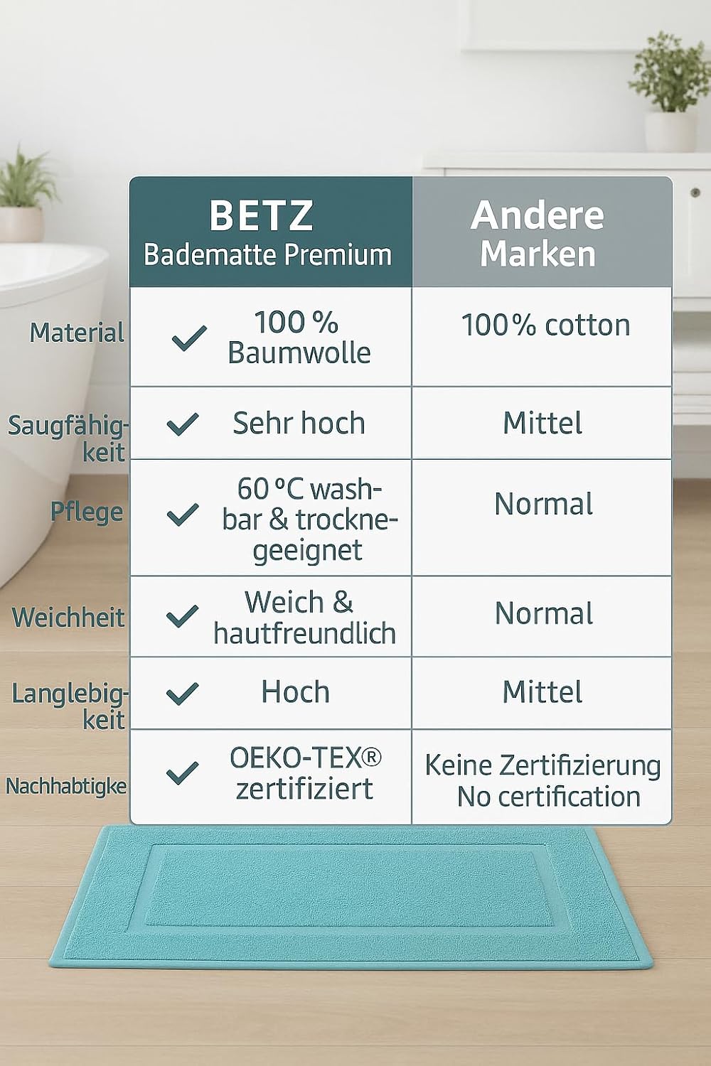 • Вечен дизайн: памучната постелка за баня се предлага в различни цветове и е с семпъл дизайн - така че се вписва във всяка баня. Вечни цветове с висококачествен външен вид