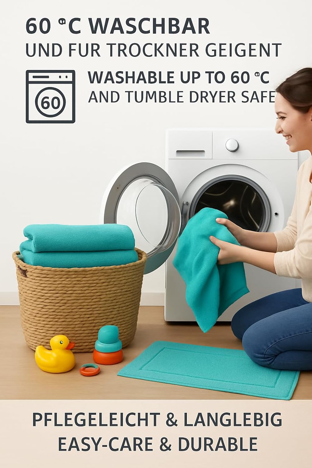 • Много лесна за поддръжка: постелката за баня за тоалетната и банята е изключително издръжлива – абсорбираща – мека и следователно много издръжлива. Може да се пере до 60 градуса и е подходяща за сушене в сушилня.