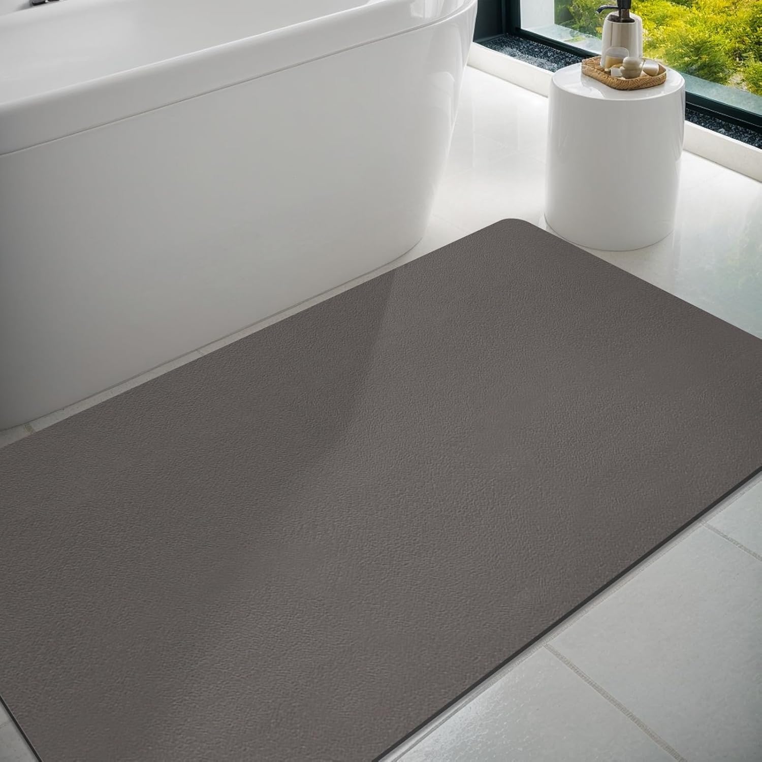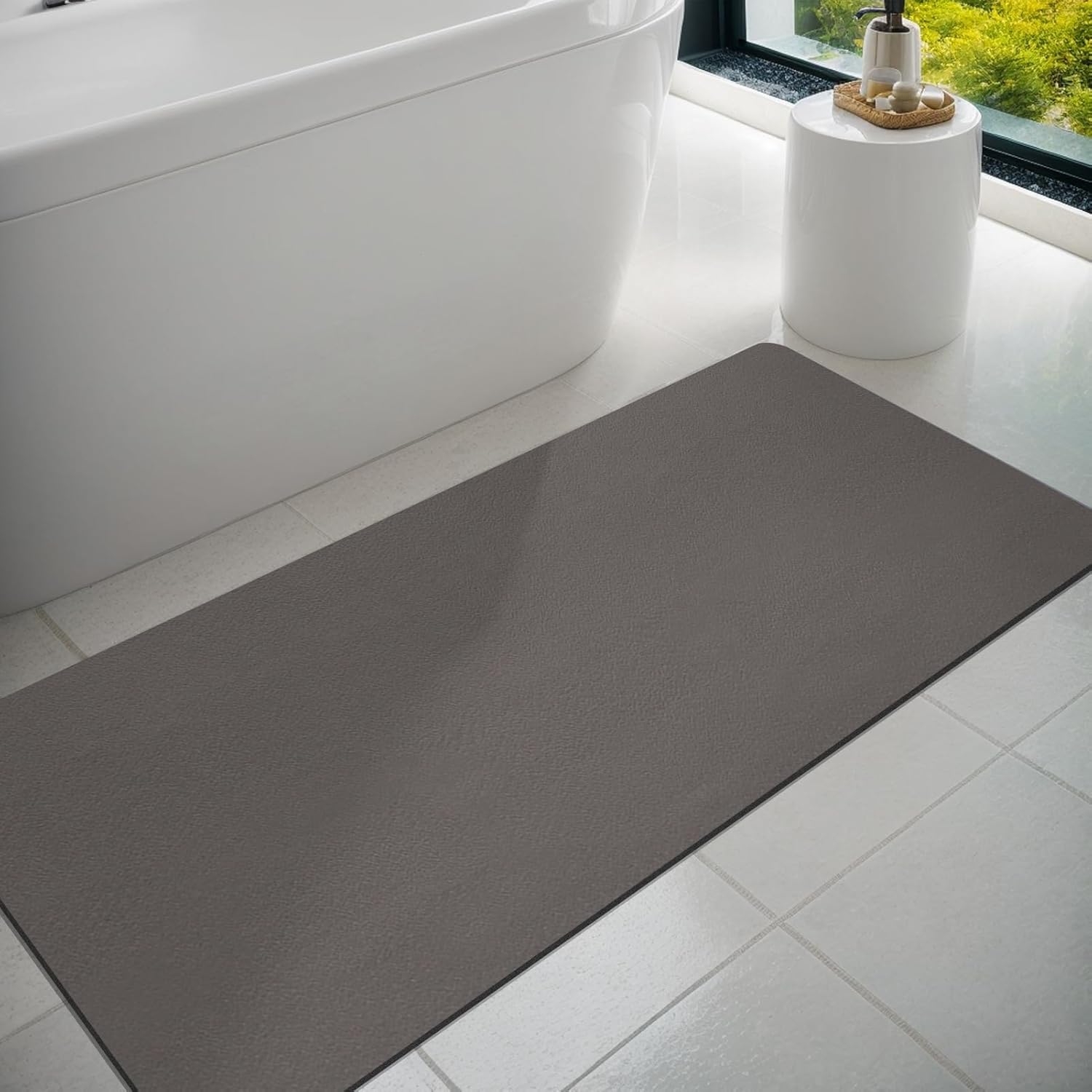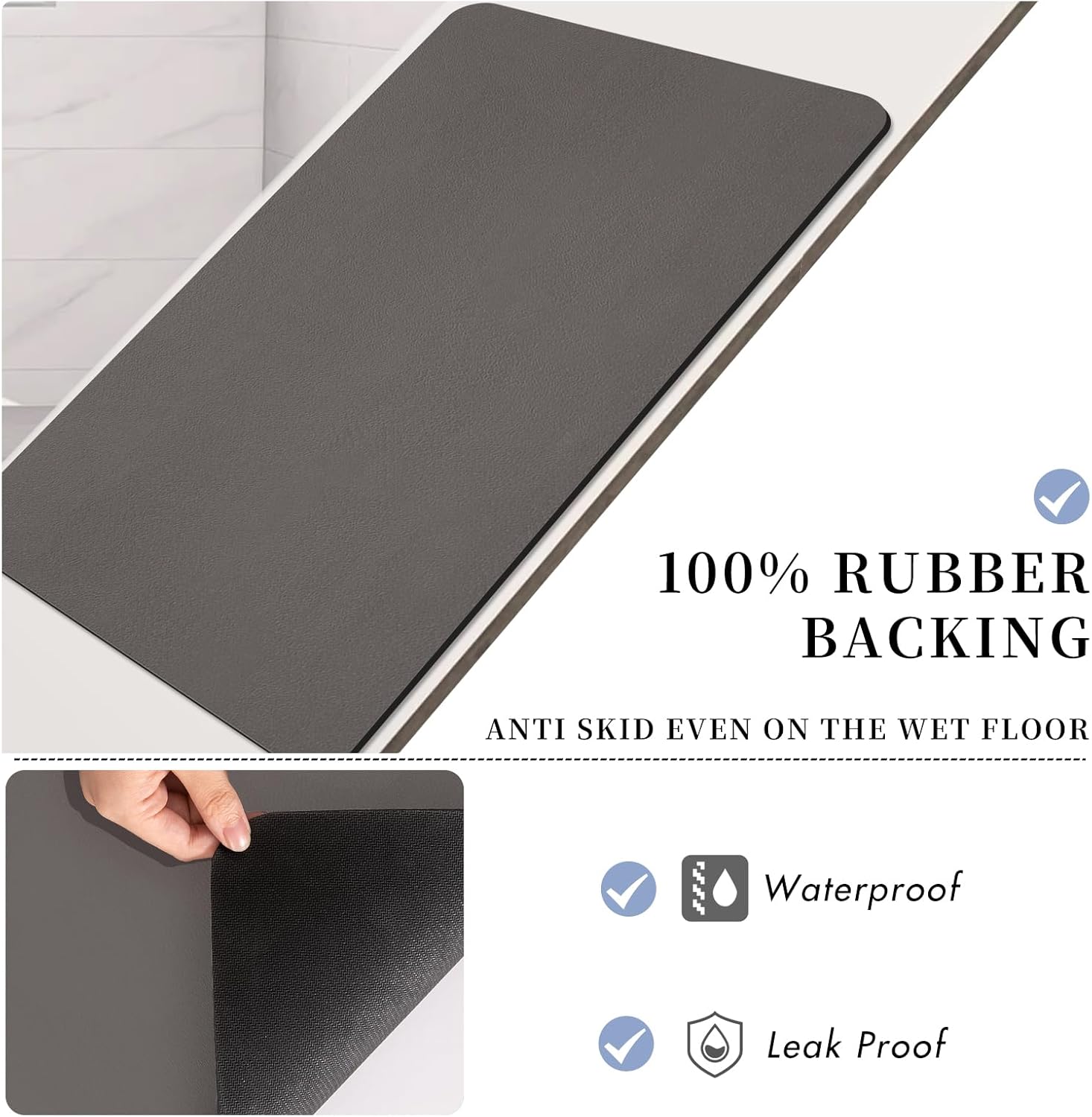 • ИЗДРЪЖЛИВА И ИЗДРЪЖЛИВА Тази постелка за баня е изработена без микрофибър и елиминира опасенията от изтичане или образуване на пликове от влакна. Водоустойчивата гумена подложка предотвратява навлизането и разпространението на вода отдолу. Дори при продължителна влага, гумената постелка остава без мирис.