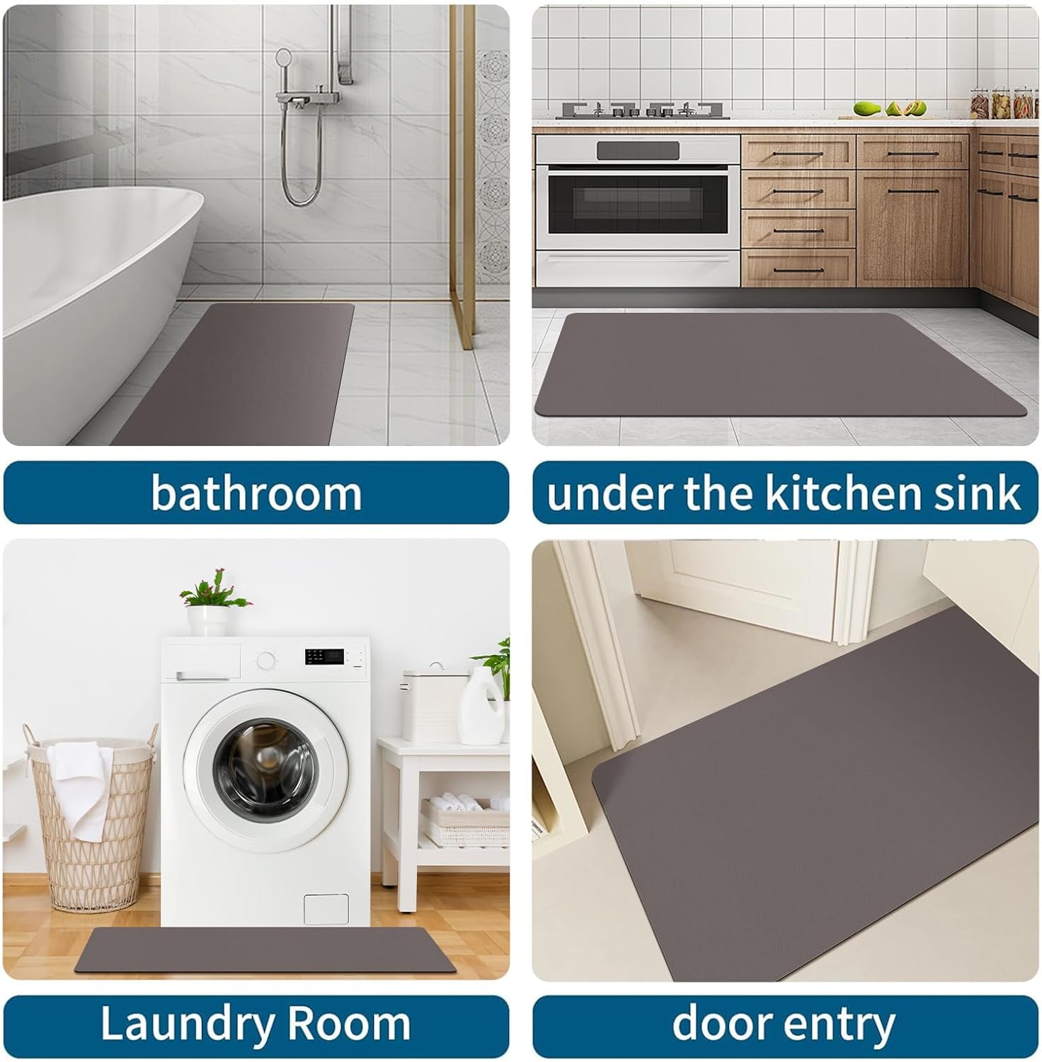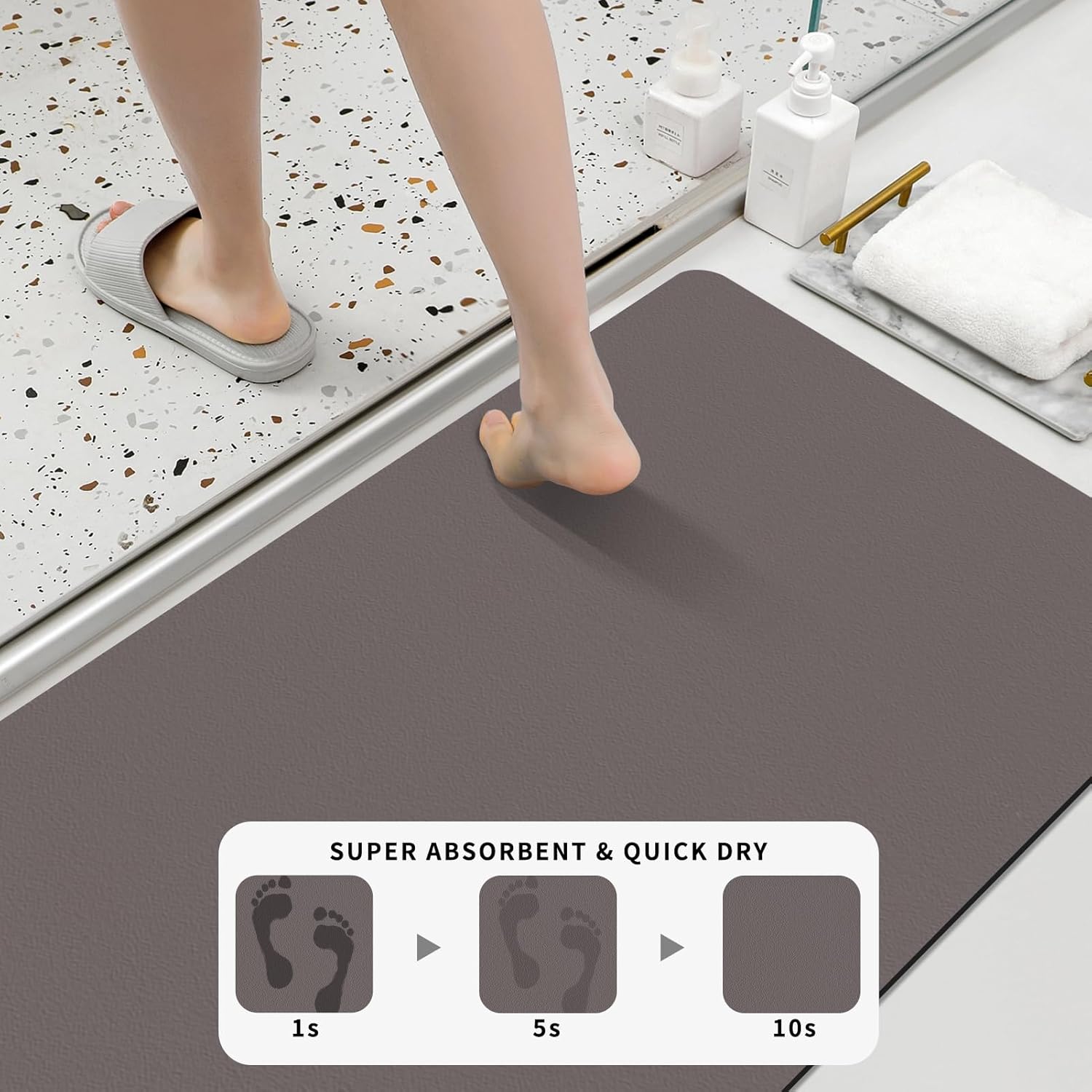 • Разнообразие от размери, от които да избирате: супер абсорбиращата постелка за баня се предлага в три размера: Малка: 40 x 60 см - Идеална за малки пространства, например под единична мивка или извън един душ. Средна: 43 x 80 см - Идеална за средно големи бани. Голяма: 43 x 120 см - Чудесна за по-големи пространства, включително под двойни мивки, вани или големи душ кабини. Изберете правилния размер въз основа на пространството и дизайна на вашата баня, преди да купите.