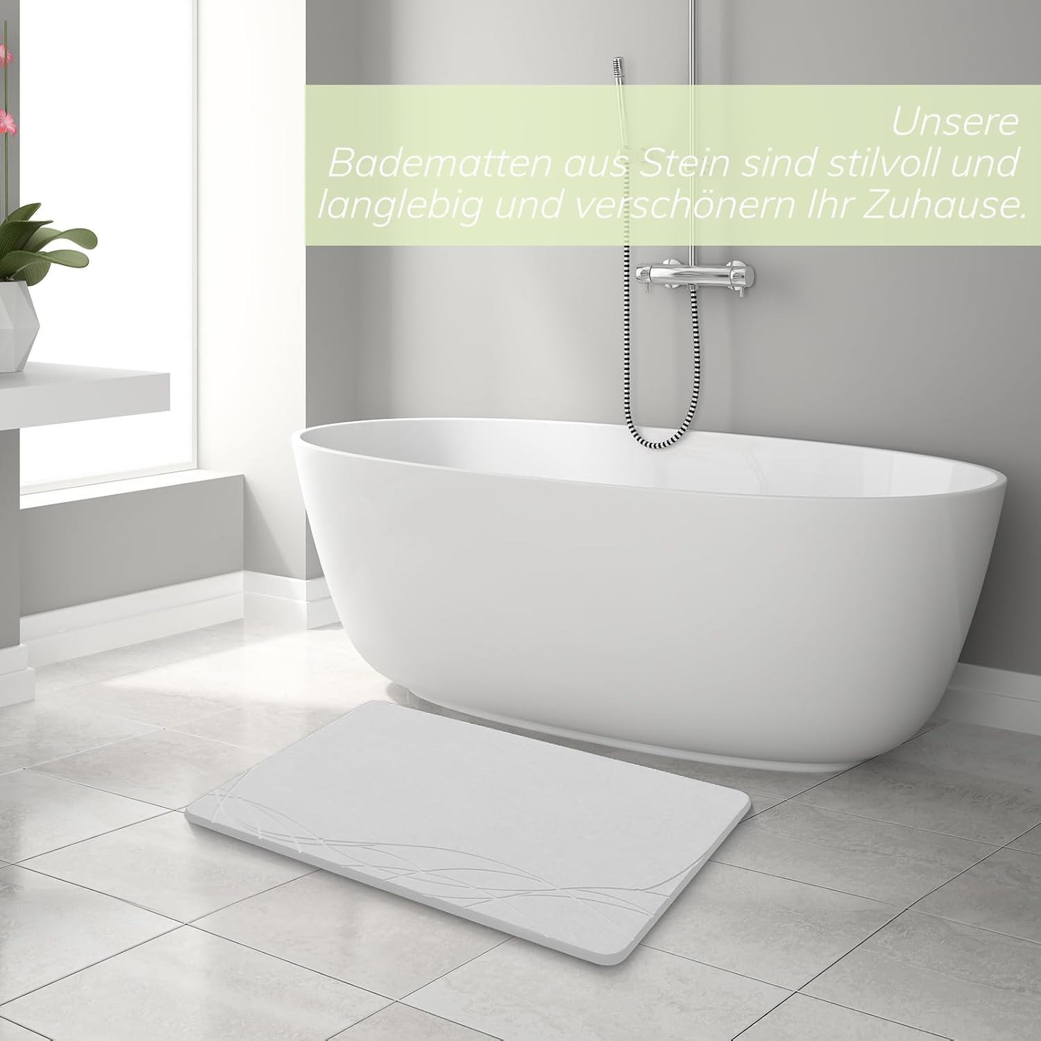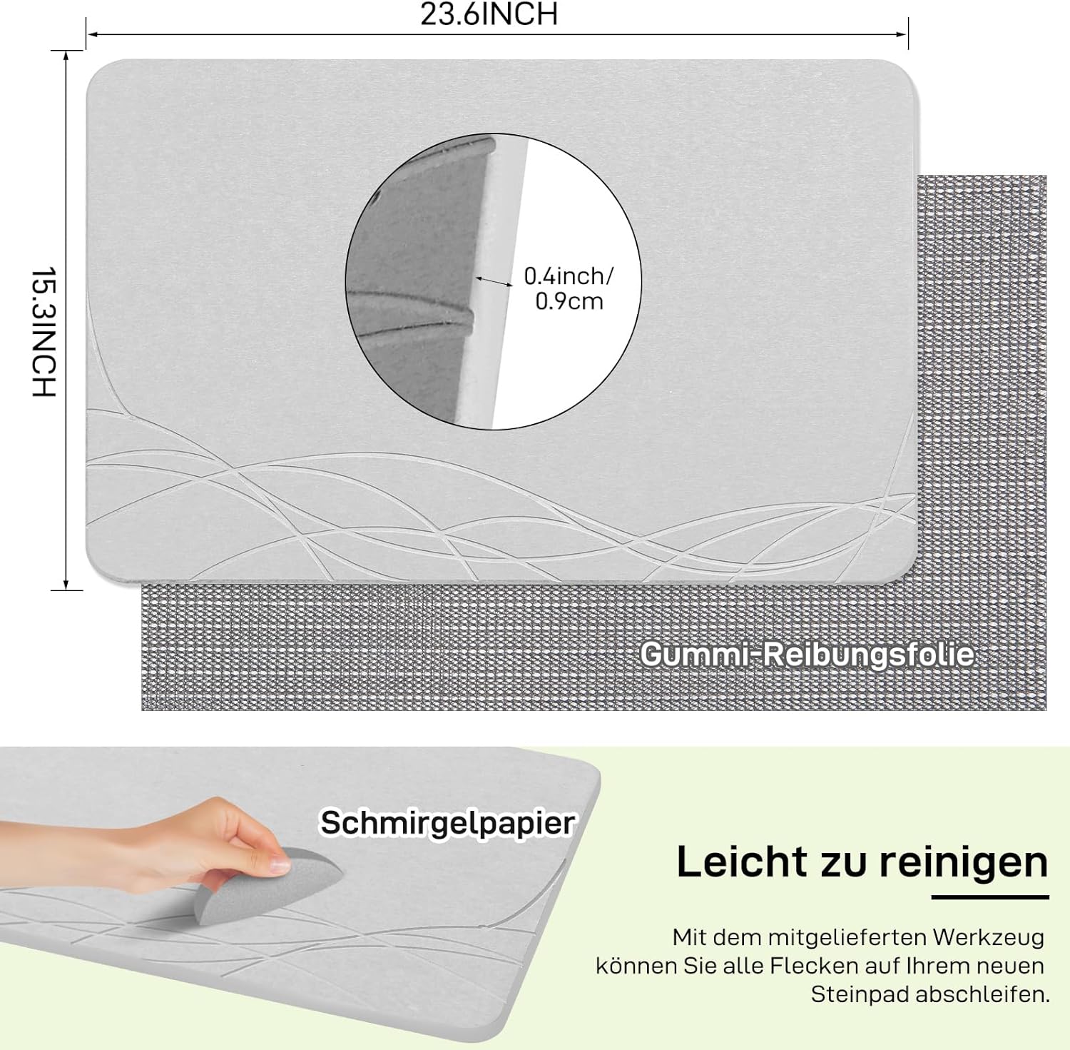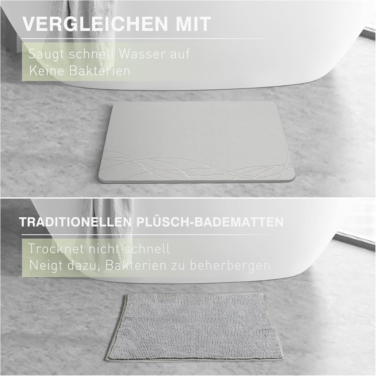 Изработени от издръжлива диатомитна пръст, нашите постелки за баня абсорбират влагата и съхнат бързо, за разлика от конвенционалните постелки за баня, които не го правят. Това поддържа работните повърхности в банята и кухнята, както и домакинските предмети чисти и подредени.