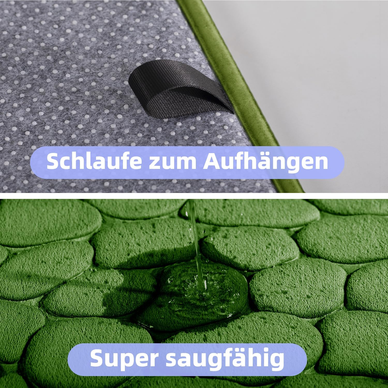 • Супер абсорбираща постелка за душ: гъбата има пореста структура тип „пчелна пита“ с висок капацитет за абсорбиране на вода. Тя може да абсорбира вода за секунди, за да поддържа краката ви сухи и чисти. Водата не се задържа по повърхността на килима за баня.