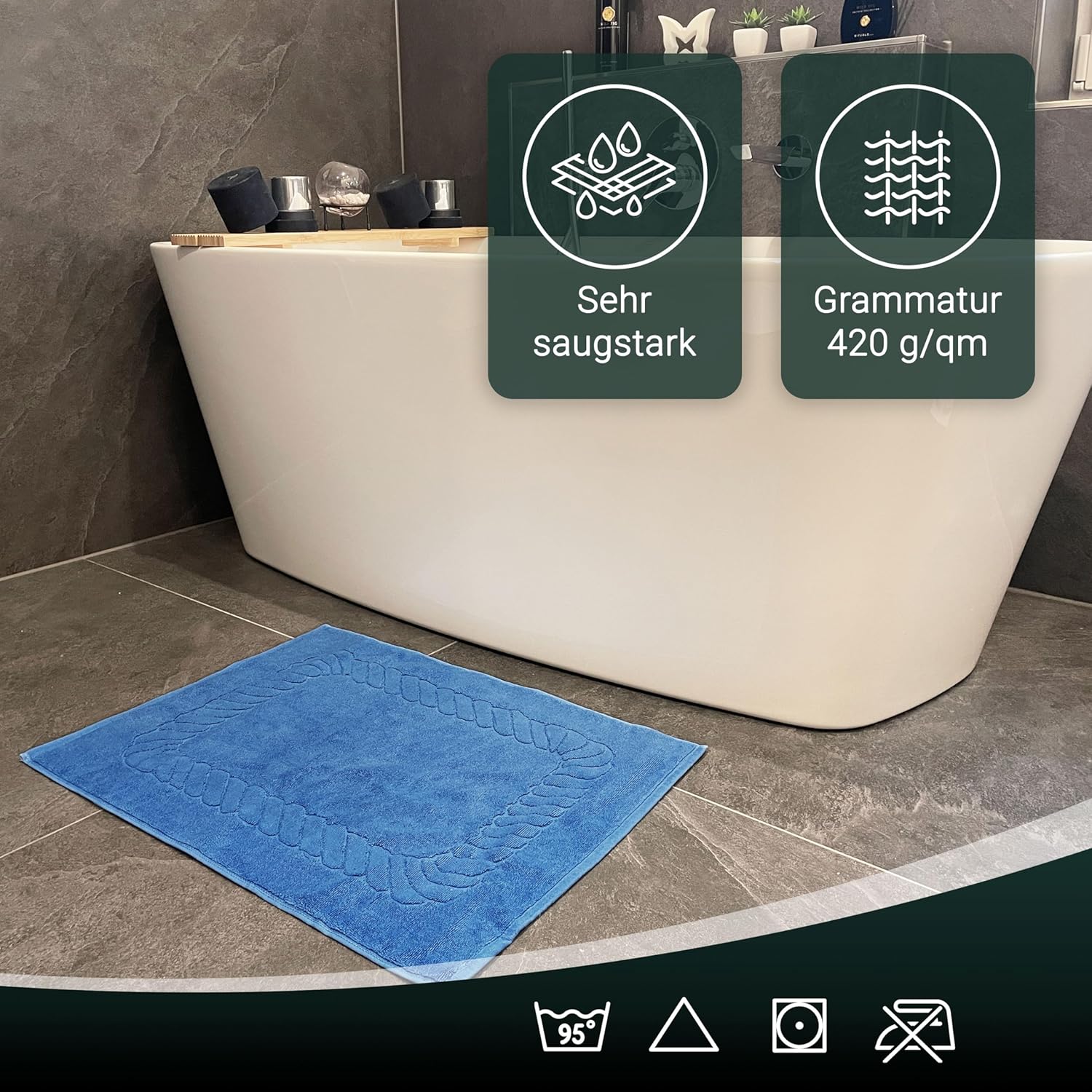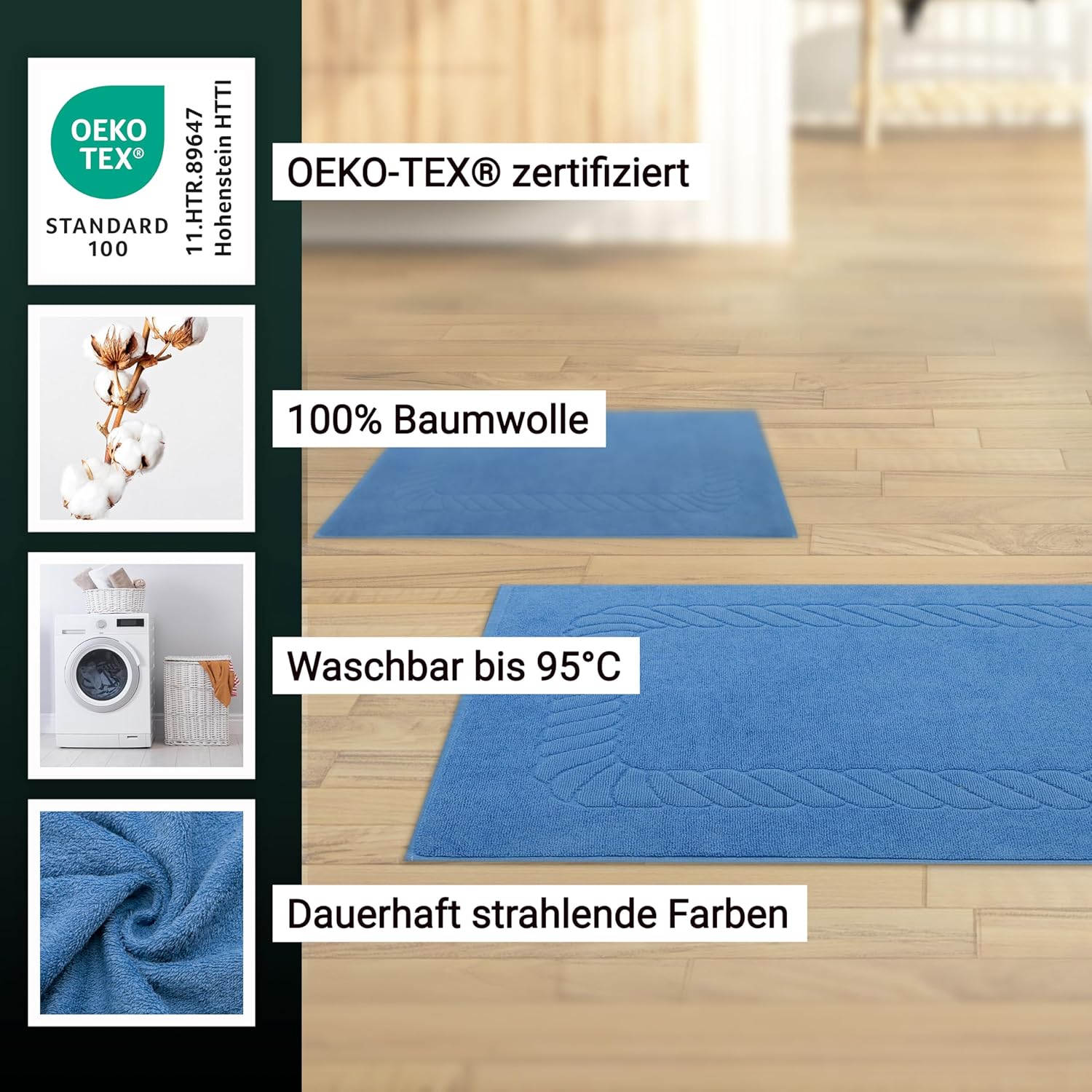 Абсорбиращите постелки за баня впечатляват с най-високата си устойчивост на цветовете. Благодарение на боядисването с индантрен, хавлиените кърпи постигат най-високи стойности за устойчивост на цветовете и най-добра стабилност на цветовете, могат да се перат до 95°C и дори са устойчиви на кипене и хлор.