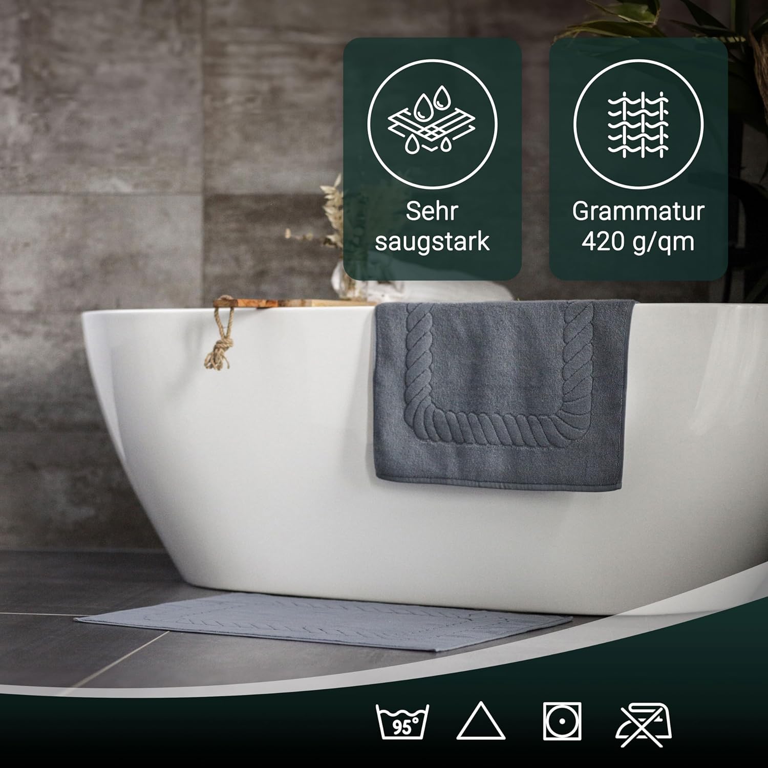 Абсорбиращите постелки за баня впечатляват с най-високата си устойчивост на цветовете. Благодарение на боядисването с индантрен, хавлиените кърпи постигат най-високи стойности за устойчивост на цветовете и най-добра стабилност на цветовете, могат да се перат до 95°C и дори са устойчиви на кипене и хлор.